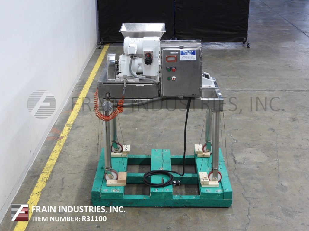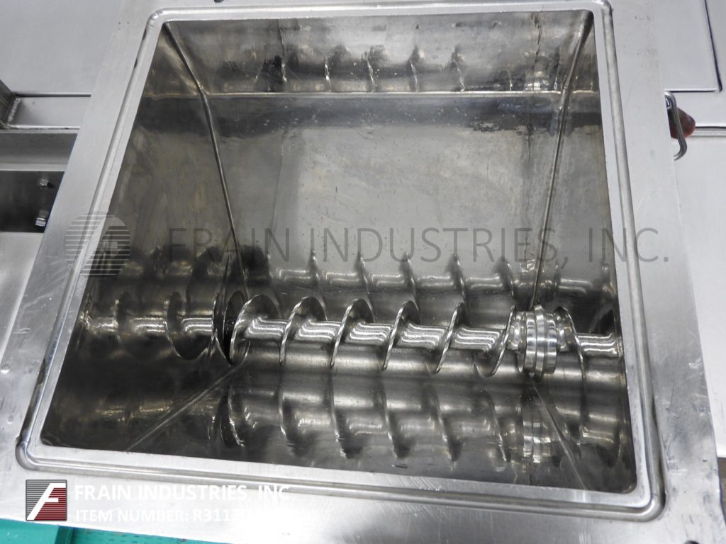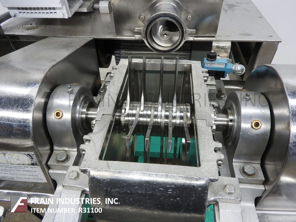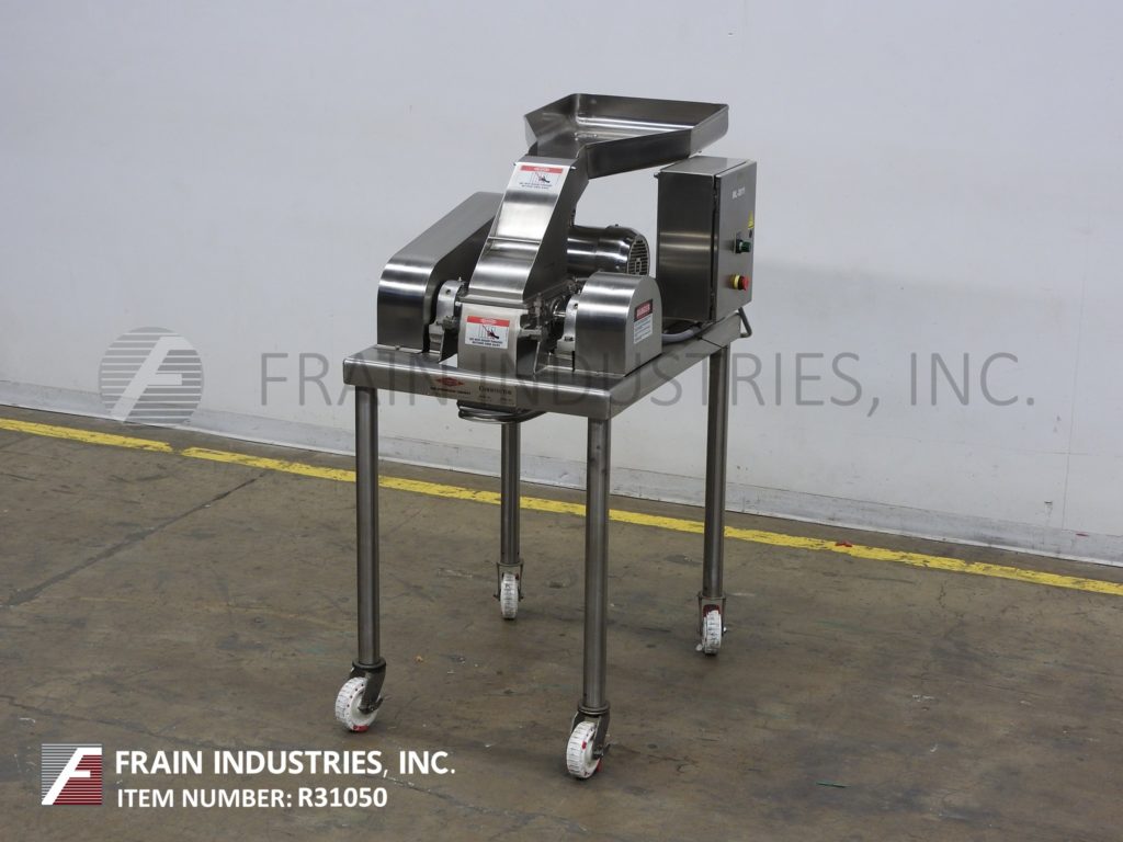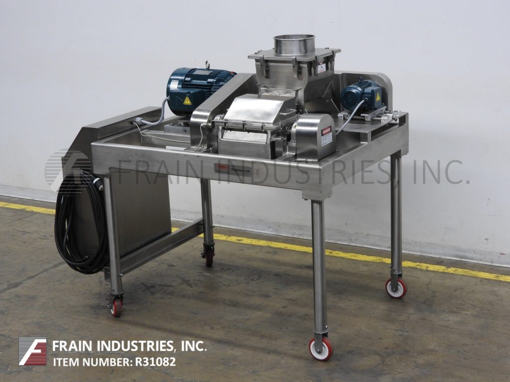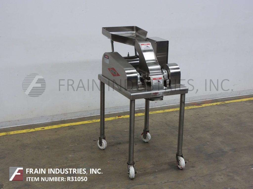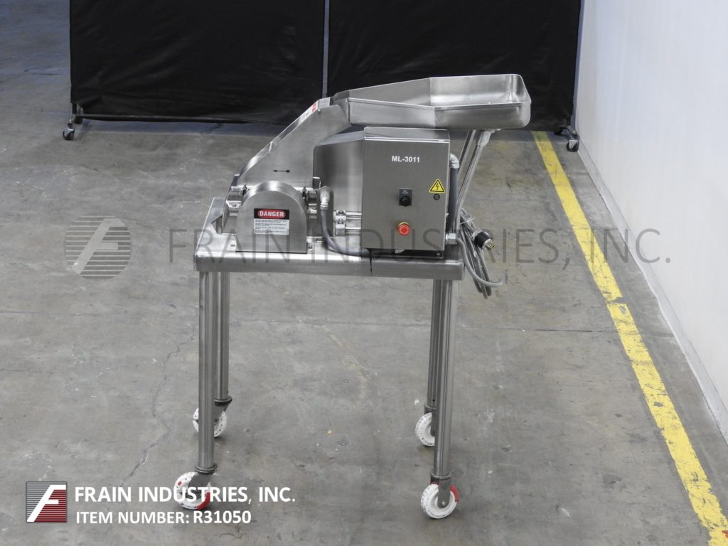 Fitzmill, Model D, stainless steel hammer mill. Equipped with 12" long x 12" wide x 12" deep (½ ft³) product hopper, 3" diameter feed screw with 2" centers powered by ¼ HP drive with variable speed gearbox and (16) 3½" long x 1" wide fixed knife / impact blades. Product discharge is 15”L x 5½” W with 36" of ground clearance. Mounted on (4) leg mild steel frame with casters.