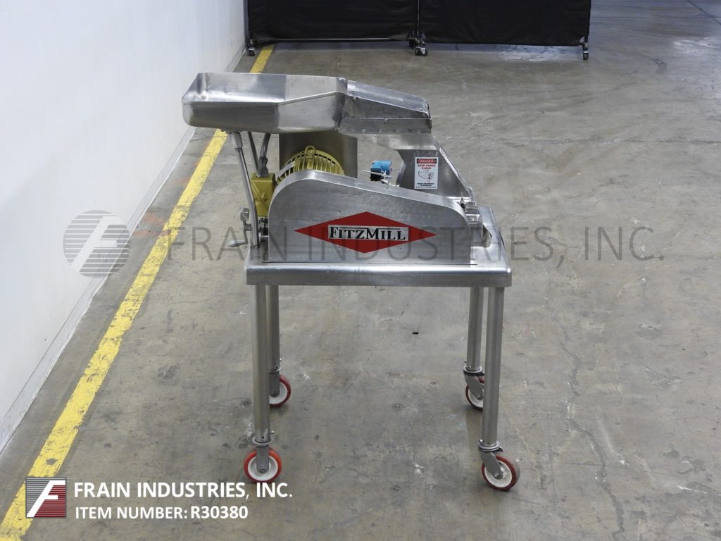 Fitzmill, Model DAS06, stainless steel hammer mill with pounds of product per hour – depending on materials and application. Equipped with 20" wide x 20" long x 4" deep feed pan, (16) fixed knife / impact blades and 15" x 5" discharge with 32" of ground clearance. Mounted on (4) leg stainless steel frame with casters.