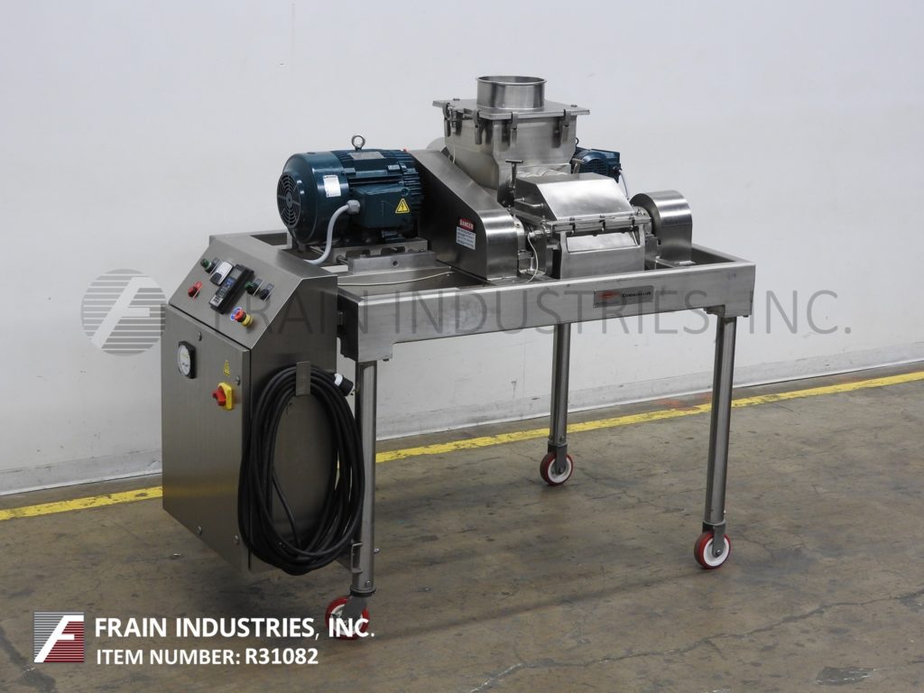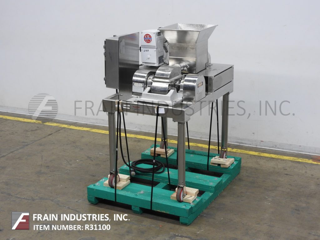 Fitzmill, Model DKAS012, stainless steel hammer mill with pounds of product per hour – depending on materials and application. Equipped with 20" wide x 24" long x 4" deep feed pan, (32) 3" long x 1½" wide fixed knife blades and 12" x 15" discharge with 45" of ground clearance. Mounted on (4) leg stainless steel frame with casters