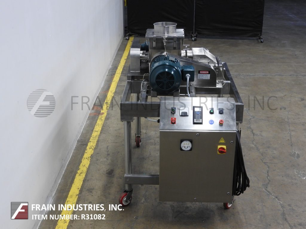Fitzmill, Model DASO6, stainless steel hammer mill with production rates per hour – depending on materials, application and machine configuration. Equipped with 18" long x 18" wide x 18" deep hopper, 3" diameter feed auger powered by a ¾ hp drive with variable speed gearbox and (16) fixed knife/impact blades powered by 10 Hp motor drive. Product discharge is 16” long x 6” wide with 33” floor clearance. Control panel with push button start / stop controls. Mounted on a stainless steel frame with casters.