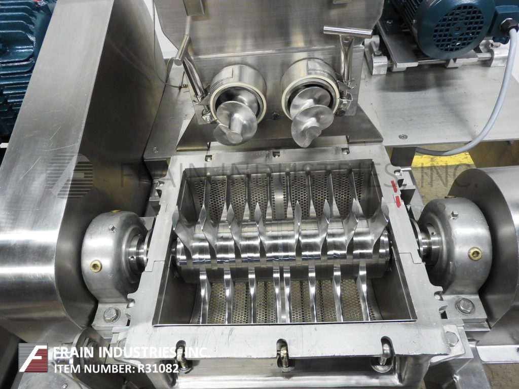 Fitzmill, Model DKAS012, stainless steel hammer mill with pounds of product per hour – depending on materials, application and machine configuration. Equipped with 16" x 16" x 16" stainless steel product hopper and has 10" OD product port with dual product feed augers, 12" x 12" feed throat with (32) fixed knife / blunt blades powered by 1/2 Hp motor drive and 16" x 16" ID product discharge port with 41” floor clearance. Control panel has touch pad controller with readout, amp meter and phase sequence gauges with vari-speed controller and start, stop, e-stop push button controls with 15 Hp main motor drive. Mounted on (4) leg stainless steel legs with casters. Used to grind, de-lump, pulverize and process wet or dry products.