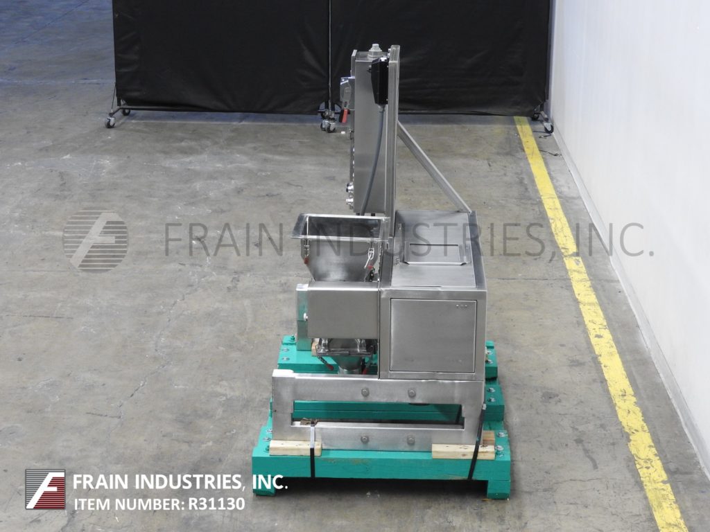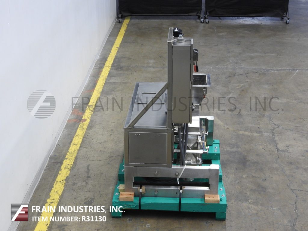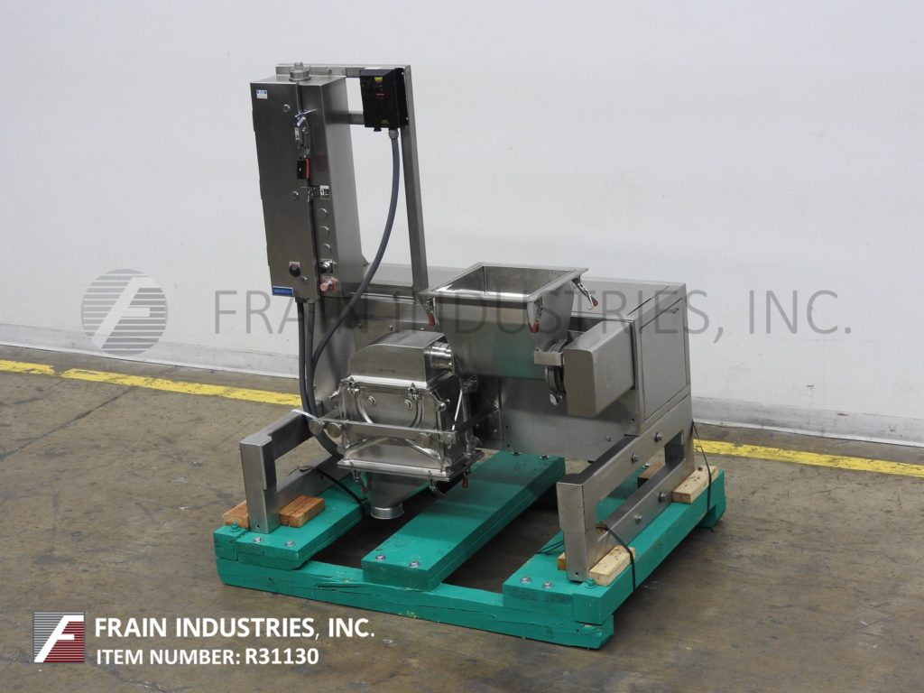 Fitzmill, Model D6A, compact, on-wall design, 316 stainless steel construction, hammer mill with production rates per hour – depending on materials and application. Equipped with 12" long x 12" wide x 12" deep stainless steel product feed hopper 3" OD stainless steel vari speed metering feed screw to enclosed process chamber with (16) fixed stainless steel knife / impact blades and 4"diameter product discharge port. Control panel has speed adjust dials and start, stop buttons for mill and feed screw.