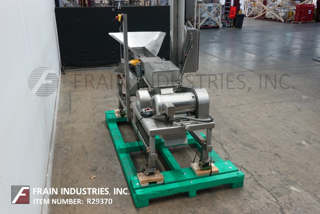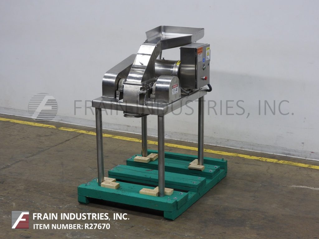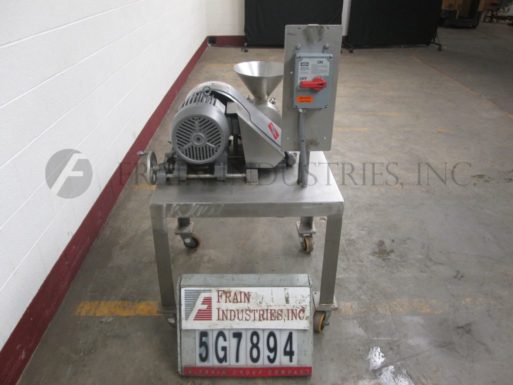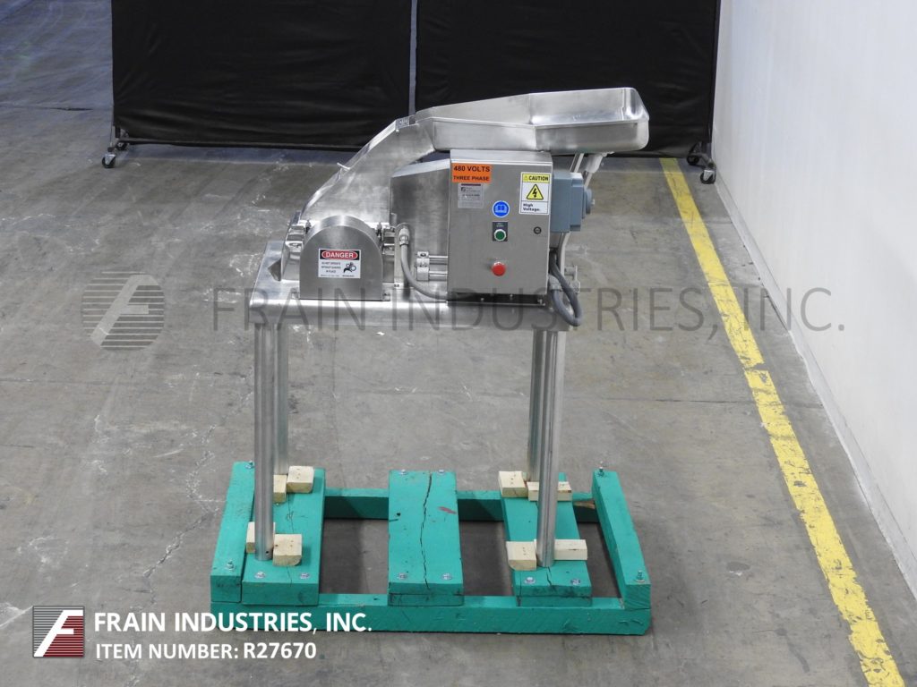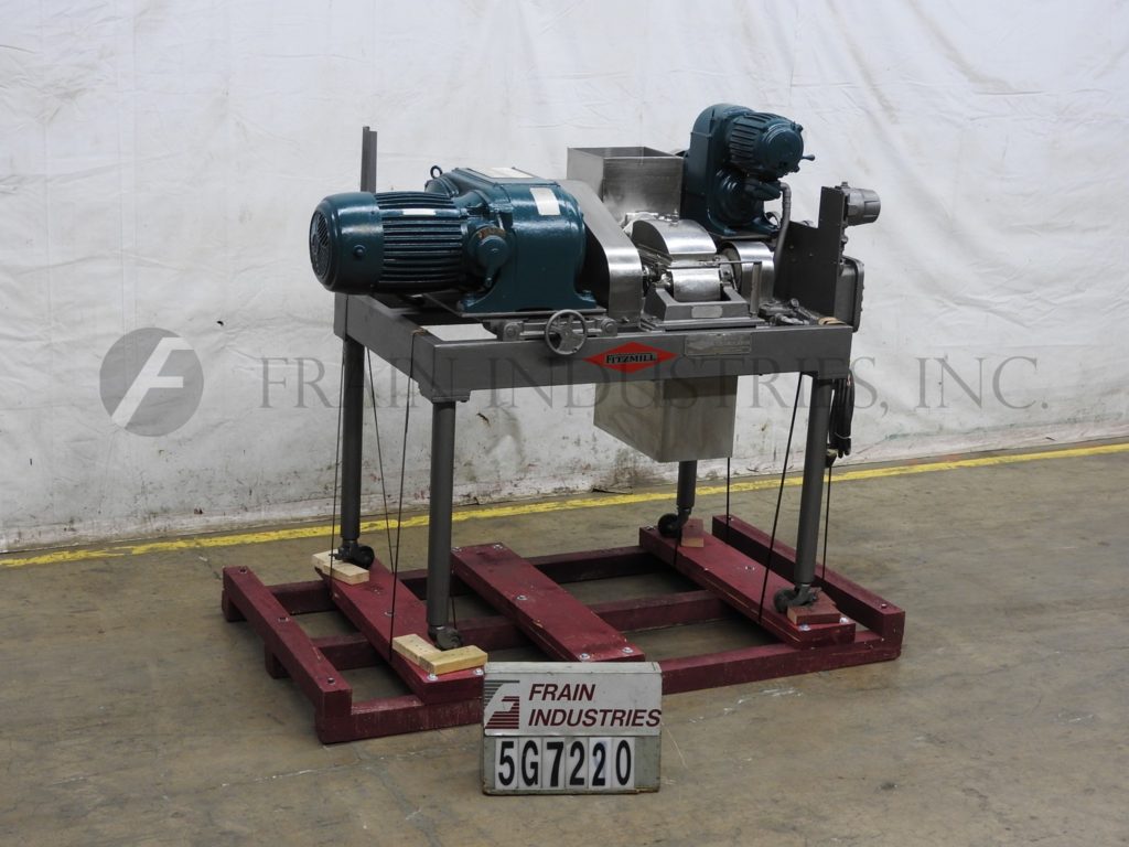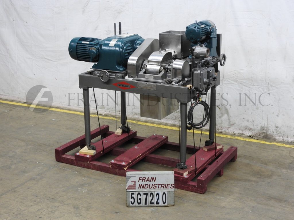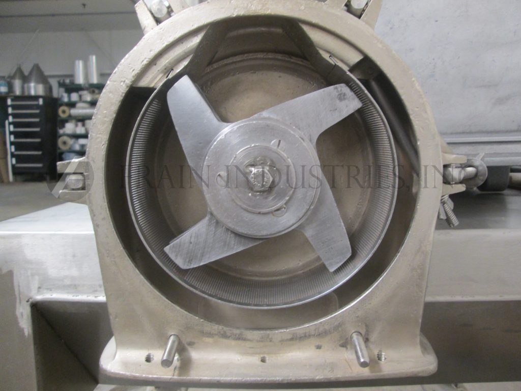 Fitzmill、模型DAS06不锈钢锤式粉碎机. with pounds of product per hour – depending on materials and application. Equipped with 12" long x 12" wide x 12" deep (½ ft³) product hopper, 4" diameter feed screw with 2" centers powered by ¾ HP drive and (26) 4" long x 3" wide fixed knife blades powered by a 15 hp drive. Product discharge is 9½”L x 6” W with 31" of ground clearance. Mounted on (4) leg painted frame base.