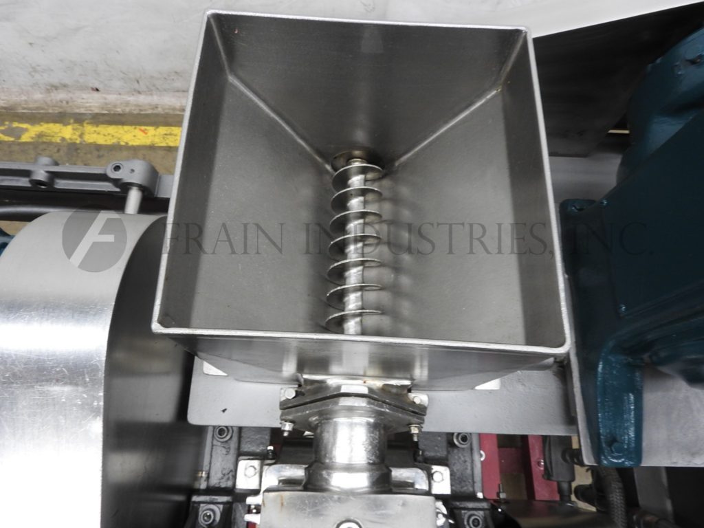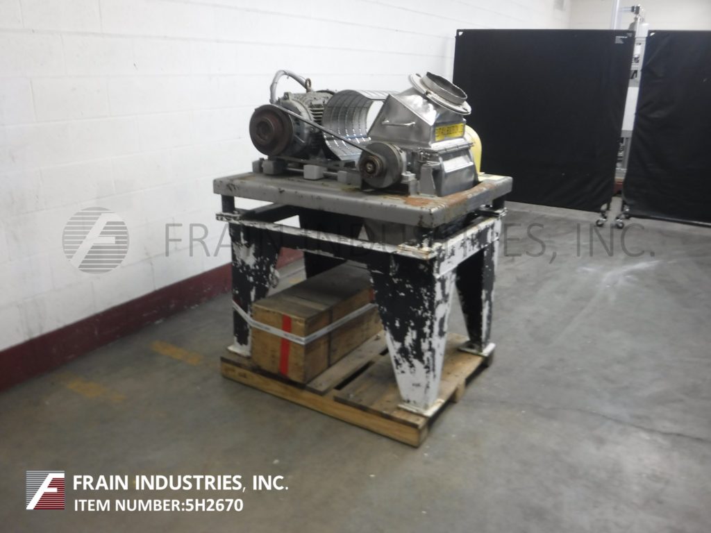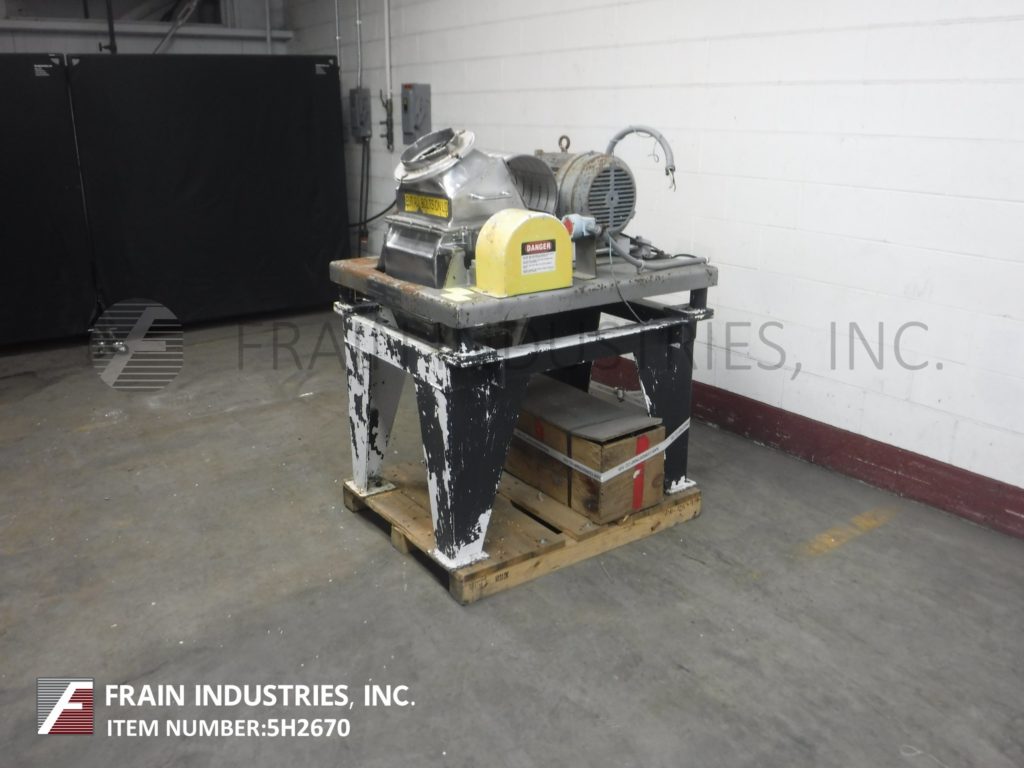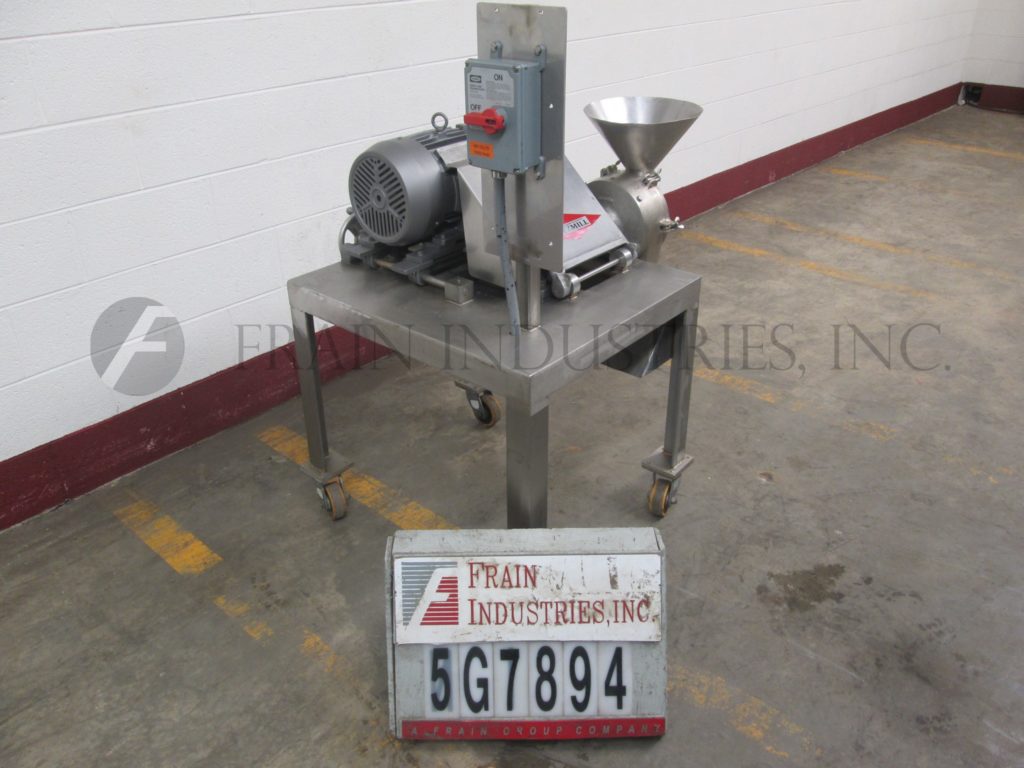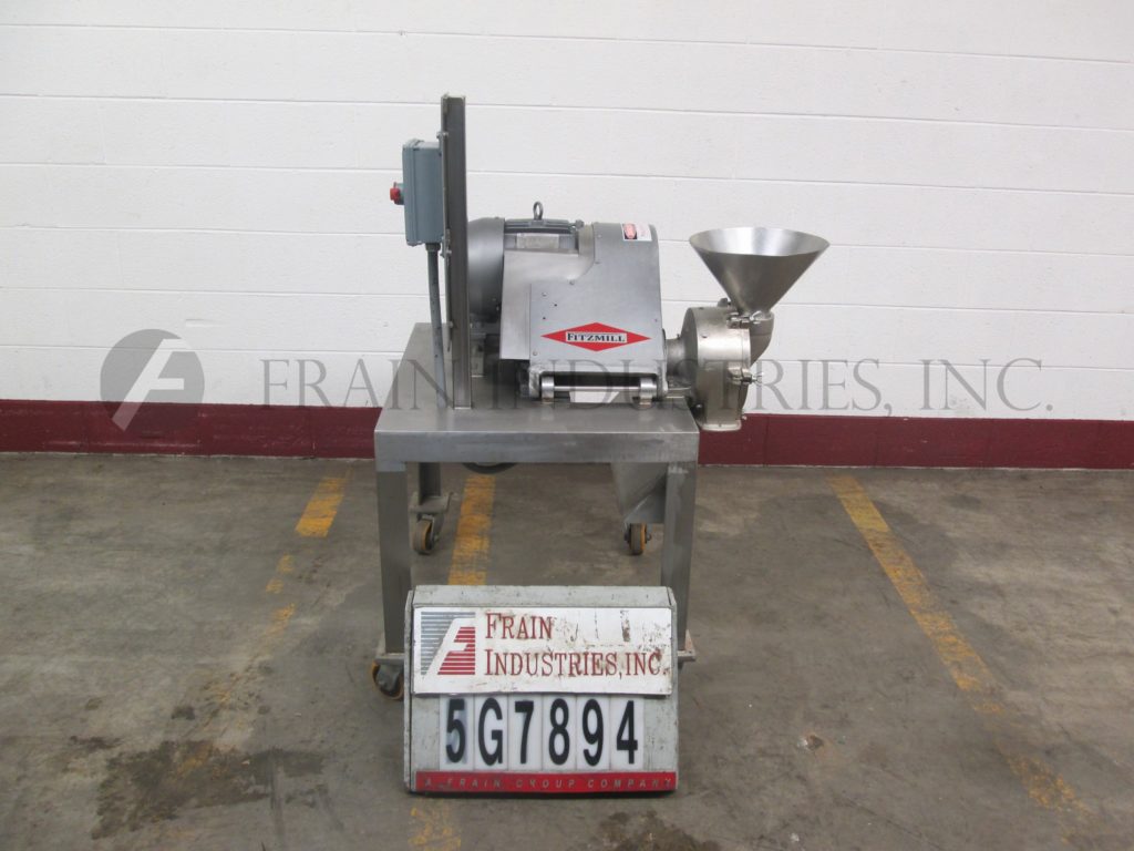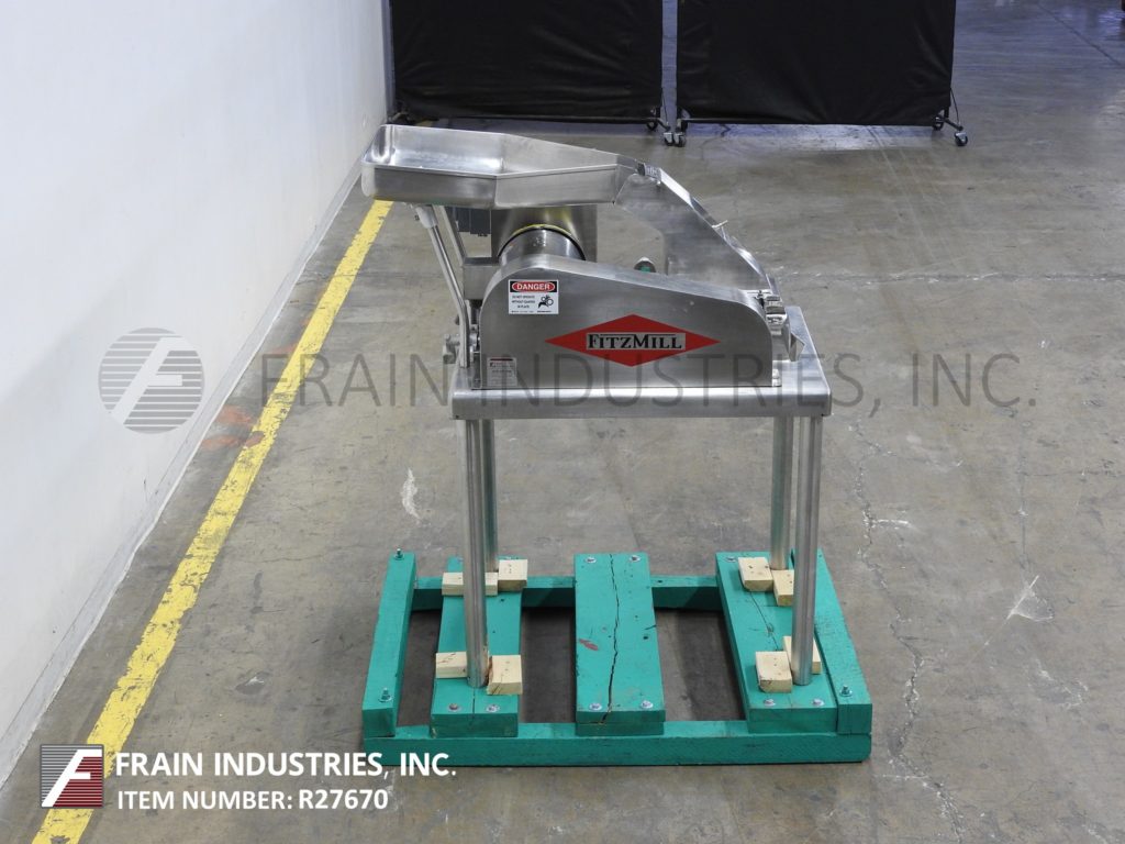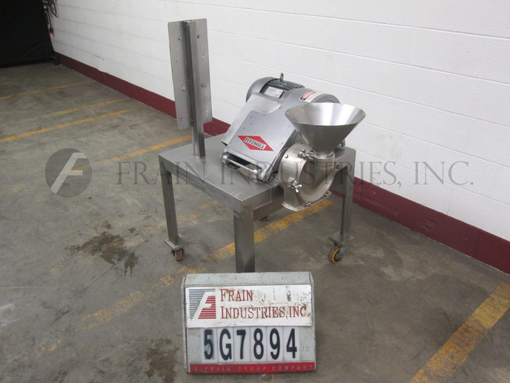 Fitzmill、模型DAS06不锈钢锤式粉碎机. with pounds of product per hour – depending on materials and application. Equipped with 12" long x 12" wide x 12" deep (½ ft³) product hopper, 4" diameter feed screw with 2" centers powered by ¾ HP drive and (26) 4" long x 3" wide fixed knife blades powered by a 15 hp drive. Product discharge is 9½”L x 6” W with 31" of ground clearance. Mounted on (4) leg painted frame base.