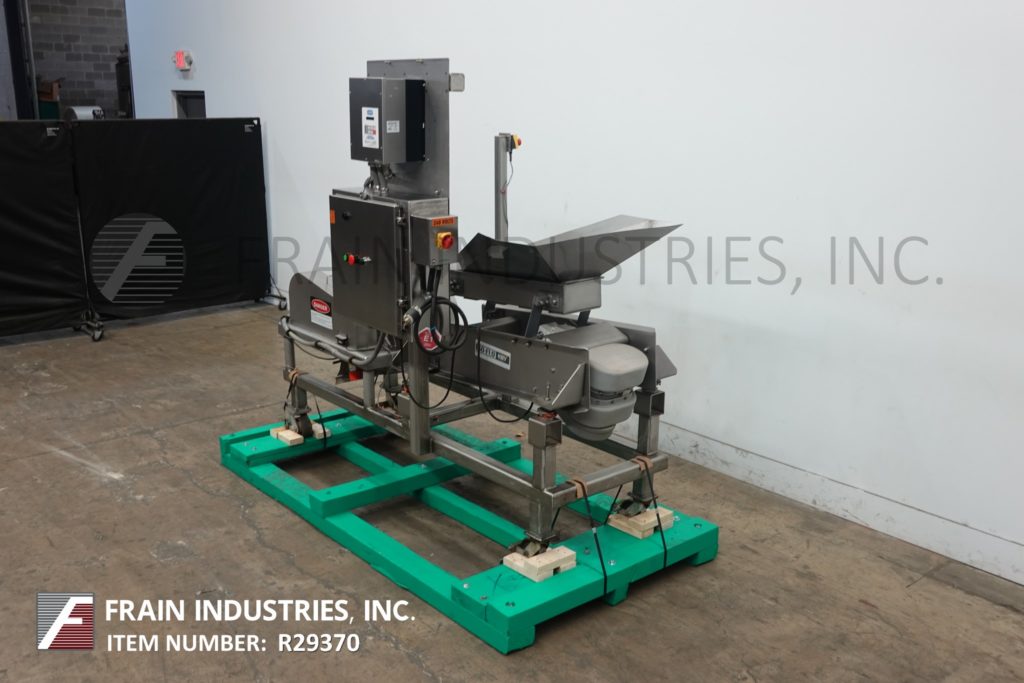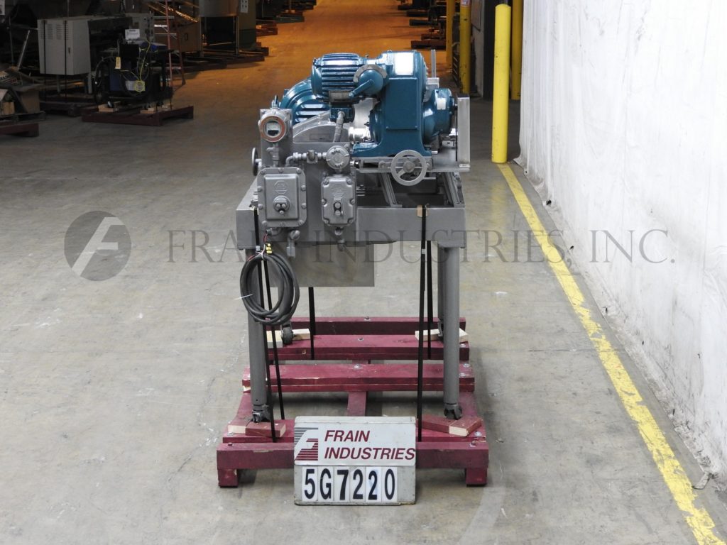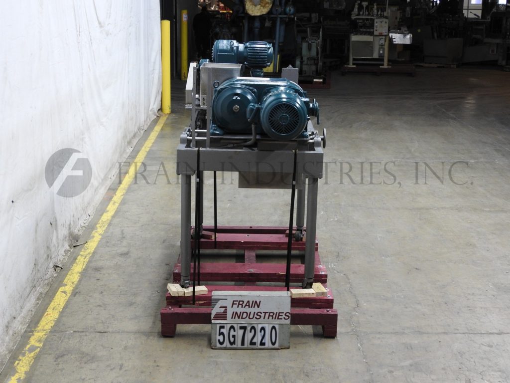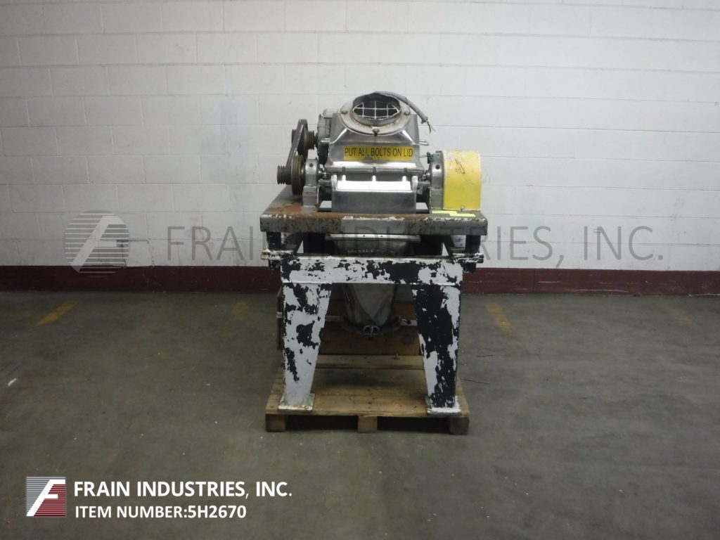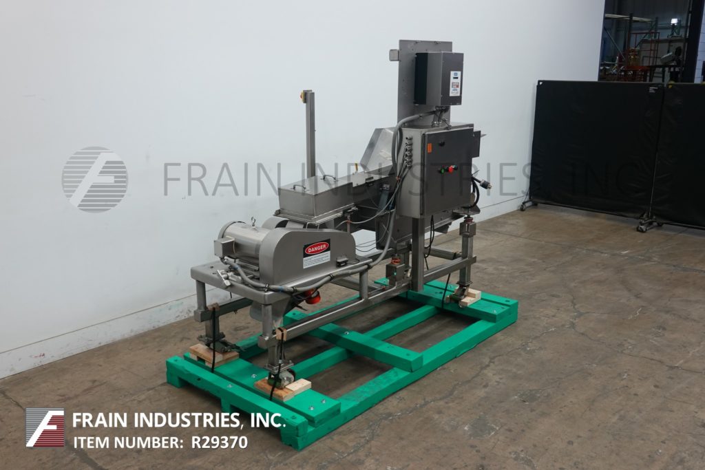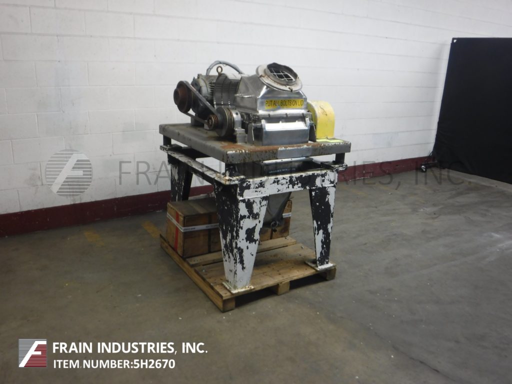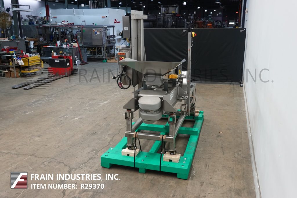 Fitzmill、模型DAS06不锈钢锤式粉碎机. with pounds of product per hour – depending on materials and application. Equipped with 12" long x 12" wide x 12" deep (½ ft³) product hopper, 4" diameter feed screw with 2" centers powered by ¾ HP drive and (26) 4" long x 3" wide fixed knife blades powered by a 15 hp drive. Product discharge is 9½”L x 6” W with 31" of ground clearance. Mounted on (4) leg painted frame base.