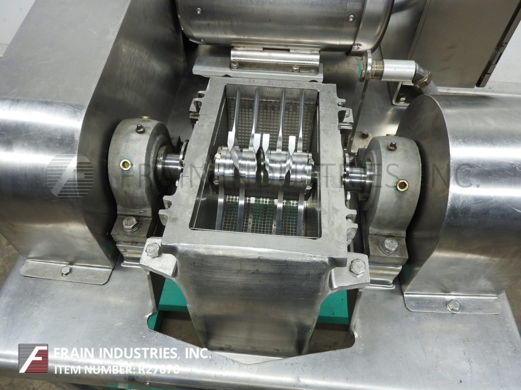 Fitzmill模型U,不锈钢锤式粉碎机。情商uipped with a 12" L x 12" W x 12" D (½ ft³) product hopper, 3" diameter feed screw with 1½" centers powered by a ¼ HP drive with variable speed gearbox and (16) 4" L x 1" W fixed impact blades powered by a 7½ HP drive with variable speed gearbox. Product discharge is 15”L x 5½” W with 38" of ground clearance. Unit mounted on mild steel frame with casters.