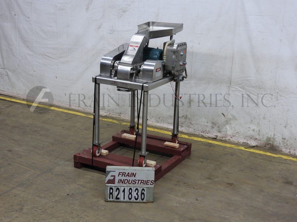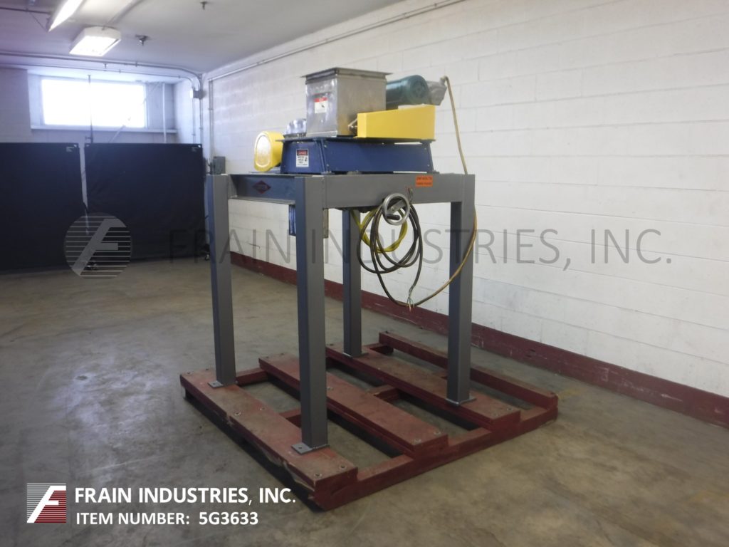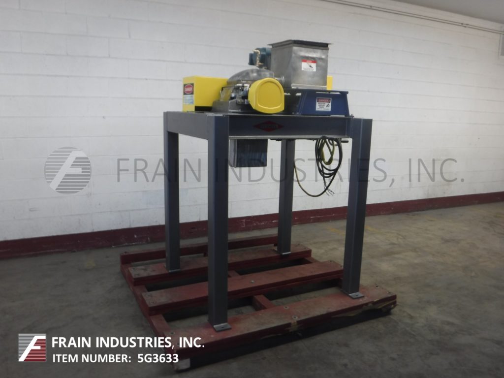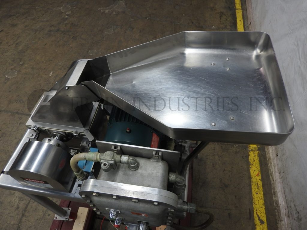 Fitzmill,D6型,不锈钢外套的住房锤磨坊。配备了12英寸L x 12英寸W产品料斗,直径3英寸的进纸螺钉,带有1.5英寸的中心,由½HP驱动器供电,带有可变的速度变速箱和(16)(16)摇摆的双边刀刀片,由7½HP驱动器供电。产品排放量为10英寸l x 5英寸W,地面间隙为37英寸。装置在带脚轮的碳钢框架上。