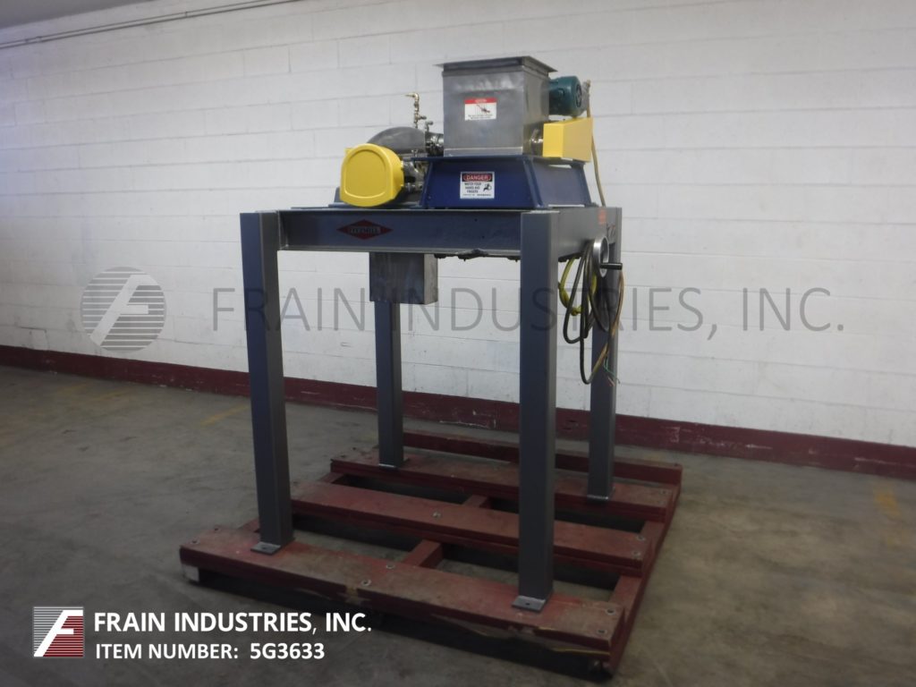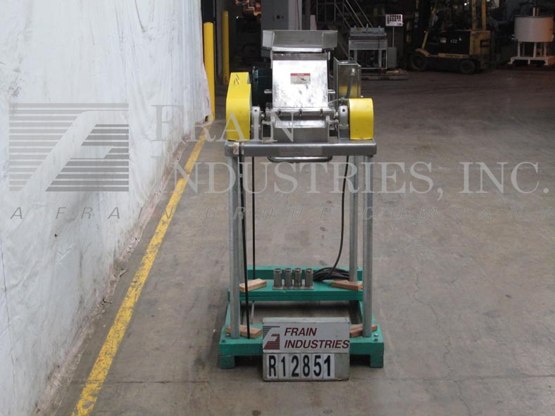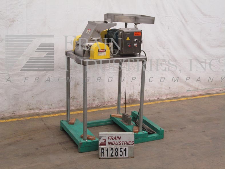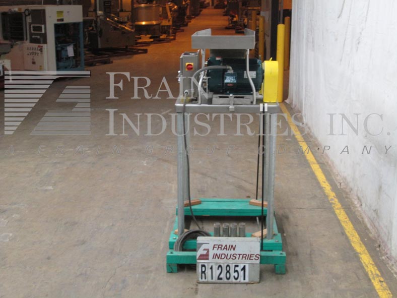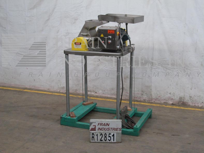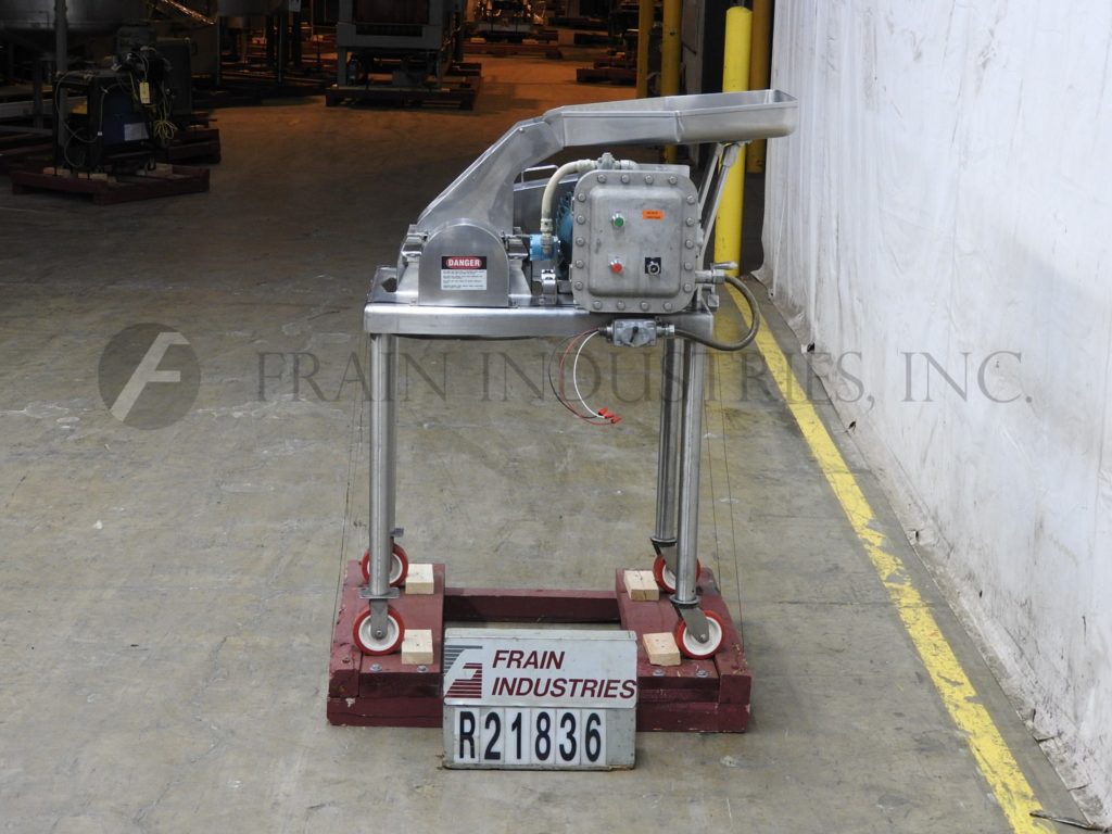 菲茨米尔,,,,Model FAS012, continuous mill. Equipped with (24) #625 fixed serrated blades mounted on a reversible rotor, 15" long x 12" wide stainless steel product chamber, 12"L x 7"W bottom discharge with 58" ground clearance. Horizontal inlet feed throat with 3-1/2" flanged (2" id )connection and limit switch. Volume per hour dependant on materials, application and machine configuration. Powered by 60 Hp motor. Mounted on stainless steel frame.