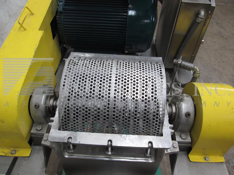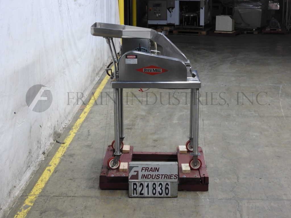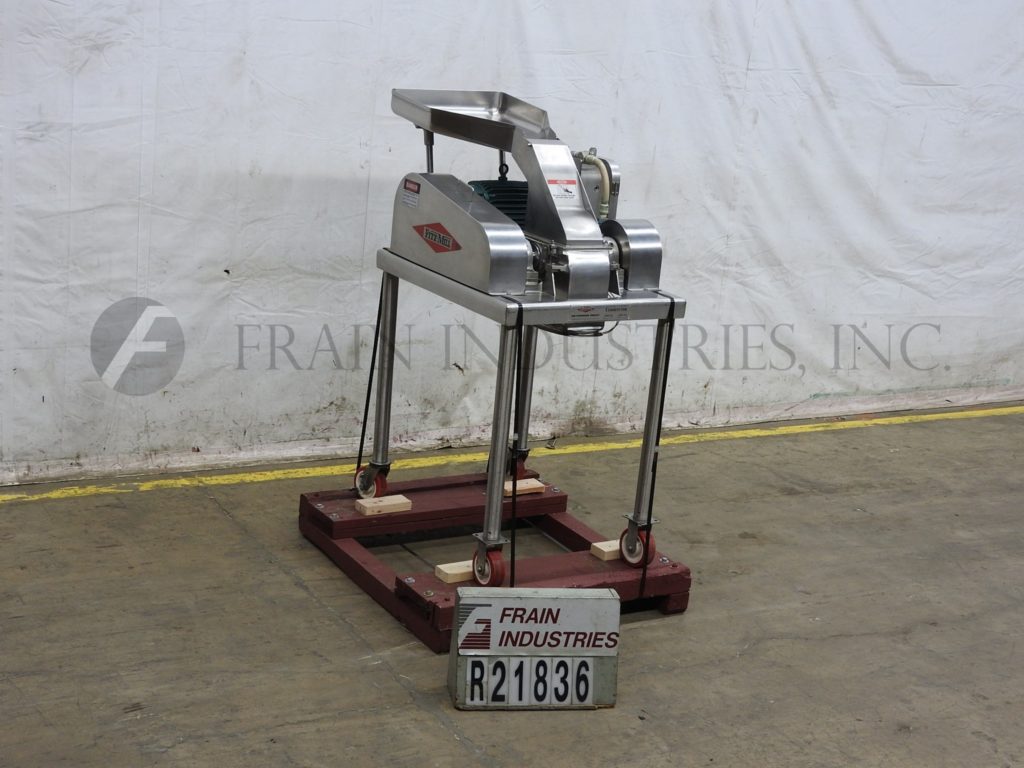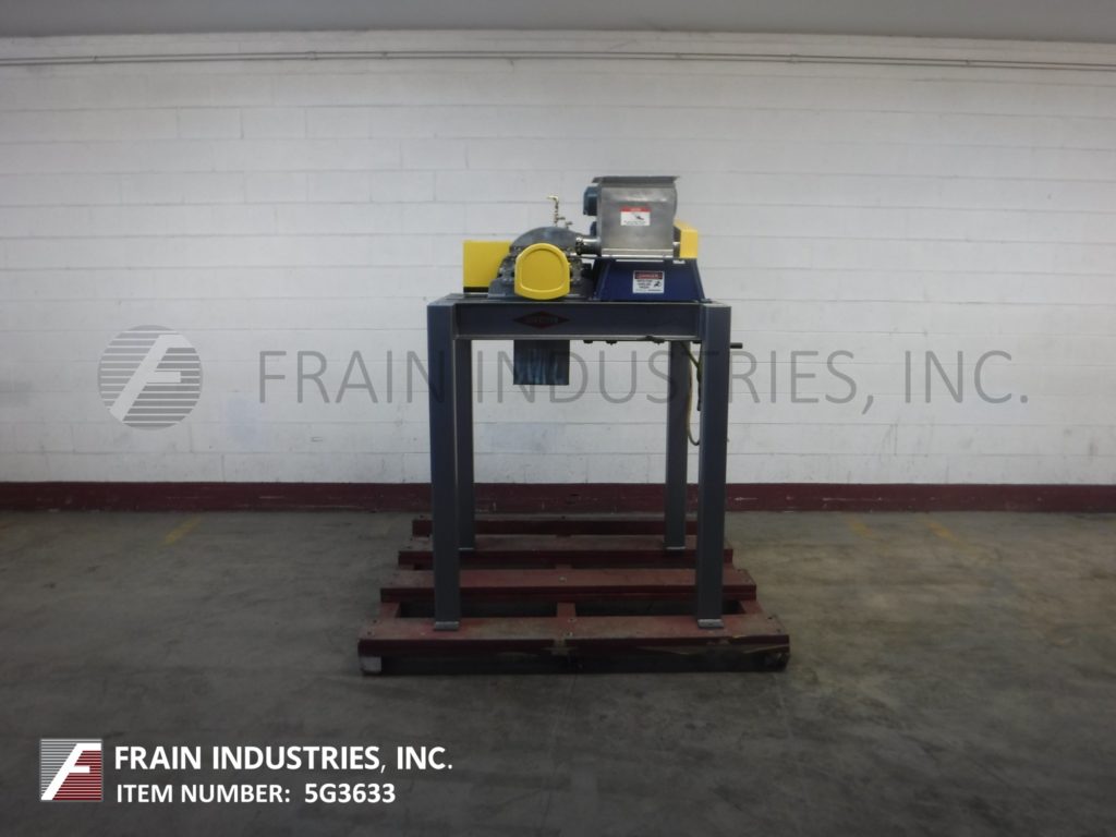菲茨米尔,,,,Model FAS012, continuous mill. Equipped with (24) #625 fixed serrated blades mounted on a reversible rotor, 15" long x 12" wide stainless steel product chamber, 12"L x 7"W bottom discharge with 58" ground clearance. Horizontal inlet feed throat with 3-1/2" flanged (2" id )connection and limit switch. Volume per hour dependant on materials, application and machine configuration. Powered by 60 Hp motor. Mounted on stainless steel frame.