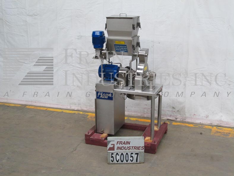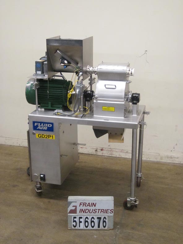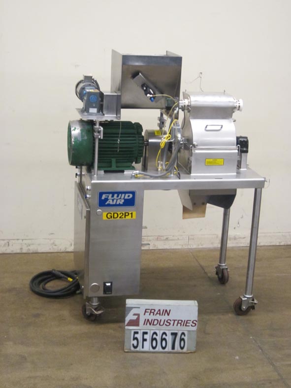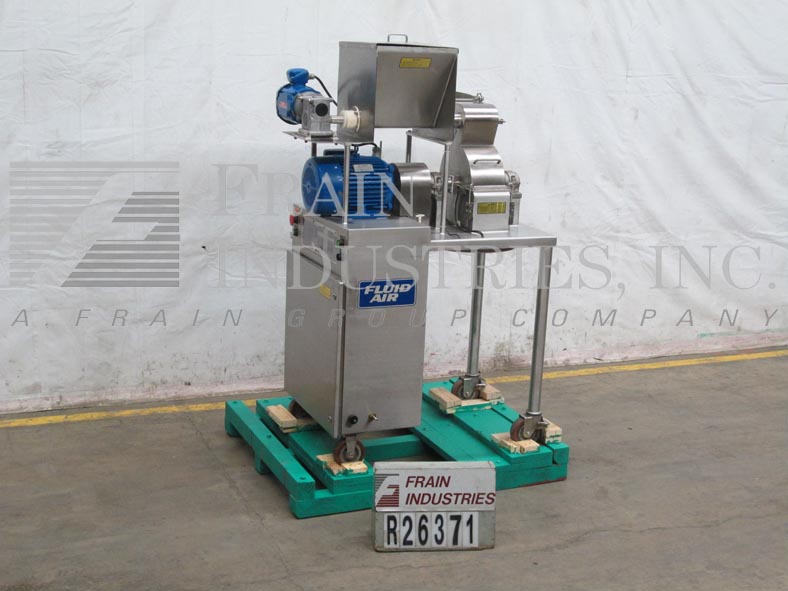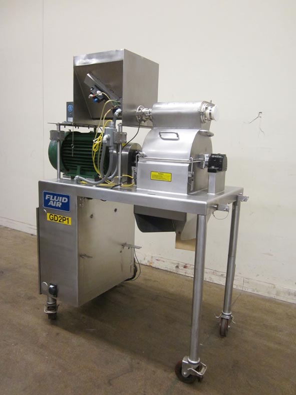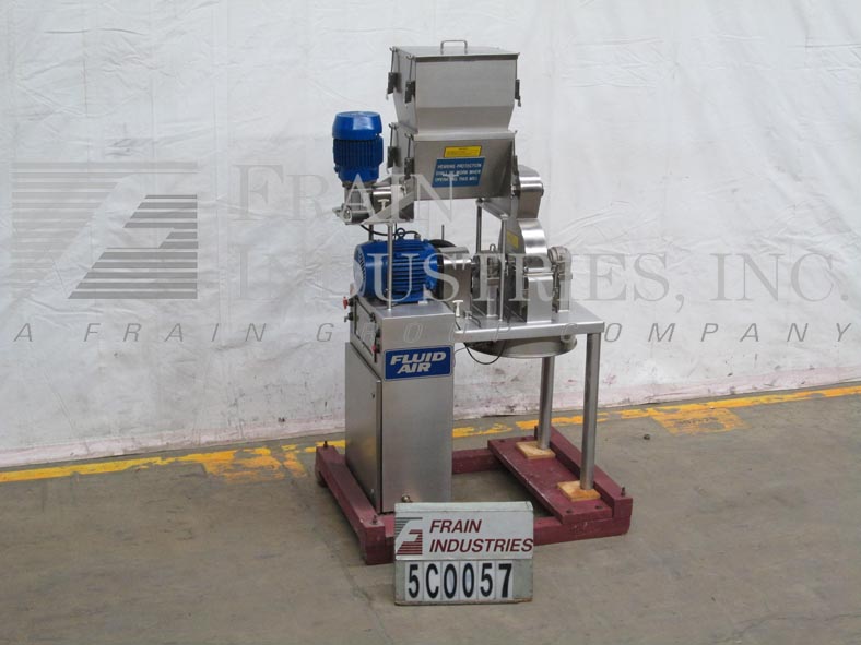 Fluid Air, Model 007 Granumill, all stainless steel pilot size product reduction system. Capable of handling both wet or dry products with thru puts from 2 to 2250 lbs per hour, has screen width of 7" and capable of handling 10 to 400 size mesh with finished reduction particle sizes from 2000 to 27 microns all with proper change parts and depending on materials and application. Maximum speeds of 5,000 rpm’s and maximum tip speed of 21,000 feet per minute. Equipped with 19" long x 15" wide x 18" deep stainless steel product hopper with 3" OD x 28" long product feed screw and secondary pan feeder to reduction chamber with bolt down cover and (4) fixed rotary impact blades with flat square and rounded blades for impacting hard materials and fine grinding also breaking up soft or wet materials. Control panel has frequency and fault controls with mill and feeder readouts for rpm and percent of load controllers. Mounted on stainless steel base frame with casters.