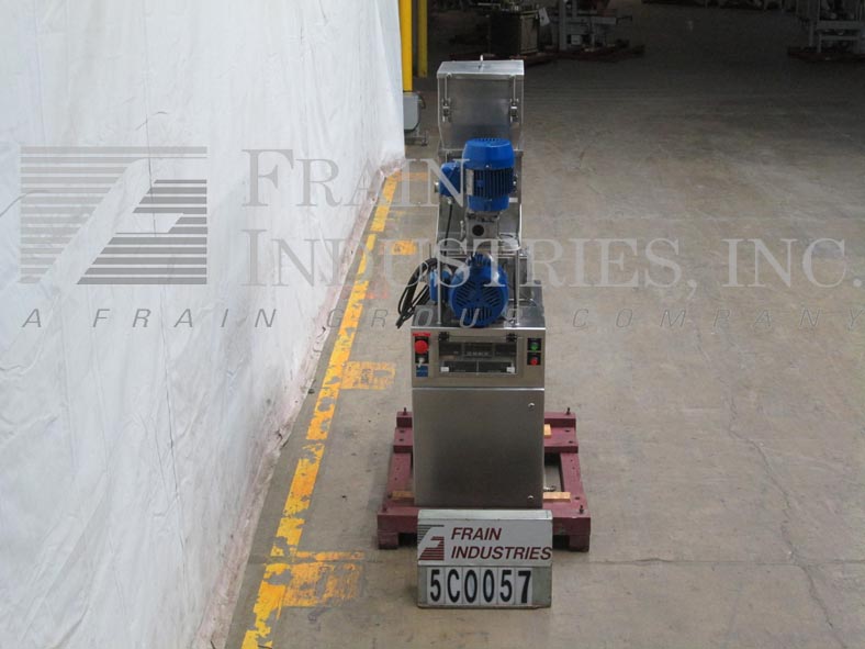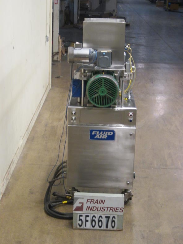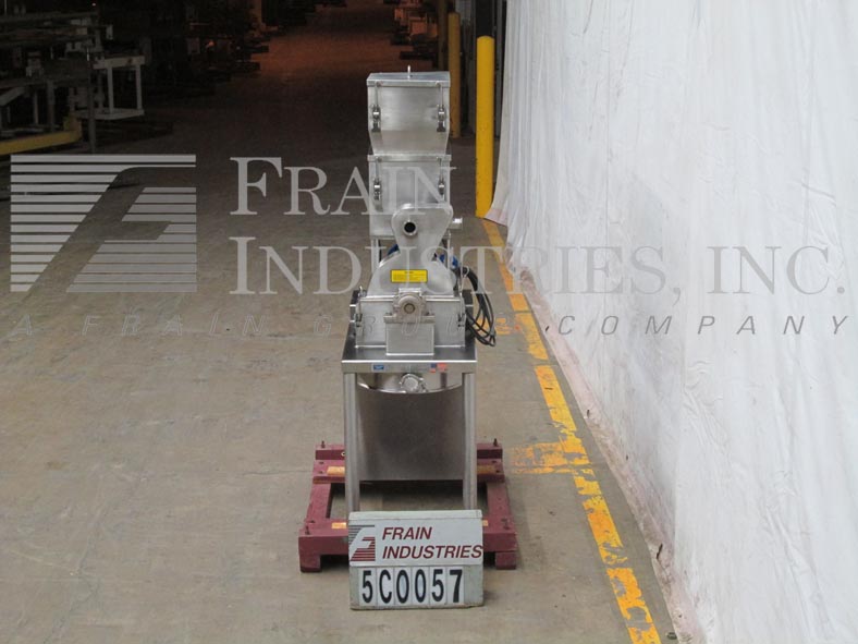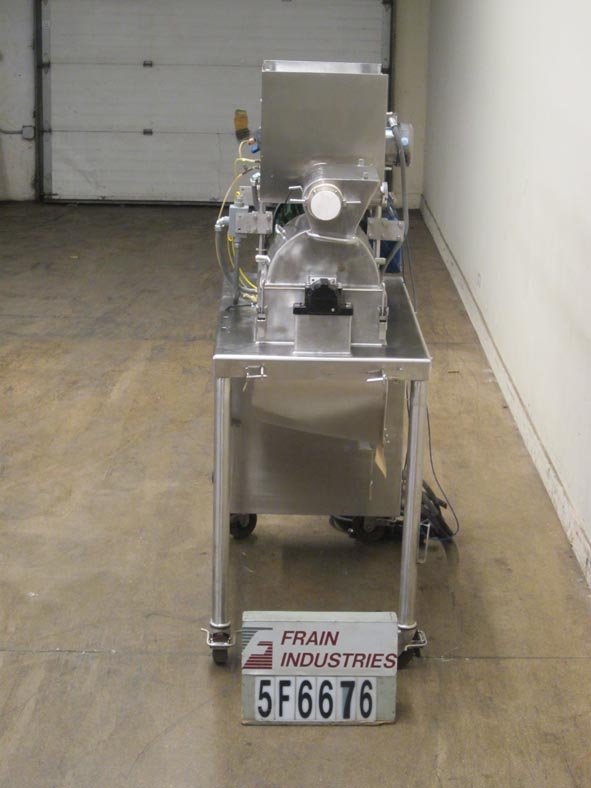 Fluid Air, Model 007 Granumill, all stainless steel pilot size product reduction system. Capable of handling both wet or dry products with thru puts from 2 to 2250 lbs per hour, has screen width of 7" and capable of handling 10 to 400 size mesh with finished reduction particle sizes from 2000 to 27 microns all with proper change parts and depending on materials and application. Maximum speeds of 5,000 rpm’s and maximum tip speed of 21,000 feet per minute. Equipped with 18" long x 15" wide x 15" deep stainless steel product hopper with 3" OD x 28" long product feed screw and secondary pan feeder to reduction chamber with bolt down cover and (4) fixed rotary impact blades with flat square and rounded blades for impacting hard materials and fine grinding also breaking up soft or wet materials. Control panel has frequency and fault controls with mill and feeder readouts for rpm and percent of load controllers. Mounted on stainless steel base frame with casters.