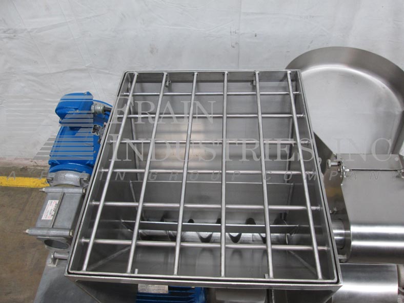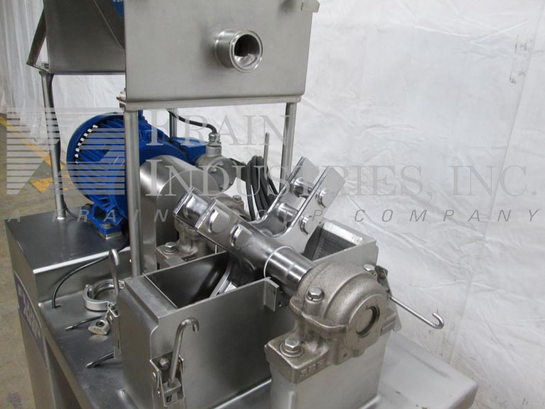 Stainless steel Fluid Air comminuting / hammer mill rated up to 6,000 RPM. Equipped with feed auger, reversing blade feature, dual frequency drives.