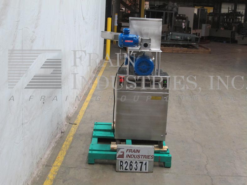 Fluid Air Model 003, stainless steel comminuting mill with volumes of product per minute or hour – depending on material and application. Equipped with feed hopper and pneumatic vibratory feeder, capable of handling both wet or dry products and reduce up to 40 microns. Blade shape is flat for impacting hard materials and fine grinding and round for breaking apart soft or wet materials. Reversing blades is done by flip of a switch. Thru put factor .39, maximum speed 5600 rpm, maximum tip speed 21,000 feet per minute, variable frequency drive controls. Screen area of 56 square inches. Mounted on (4) stainless steel legs with locking casters.