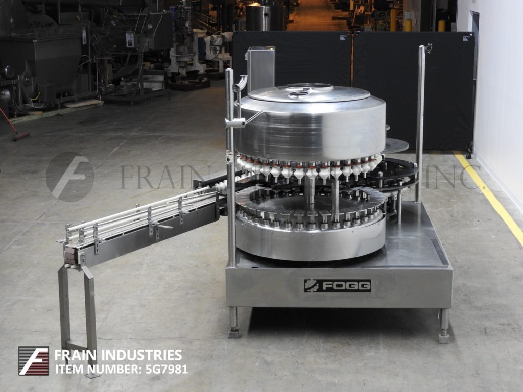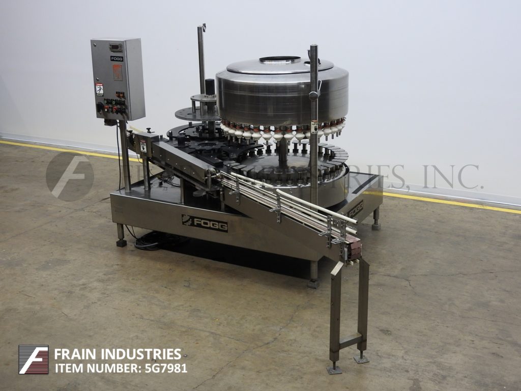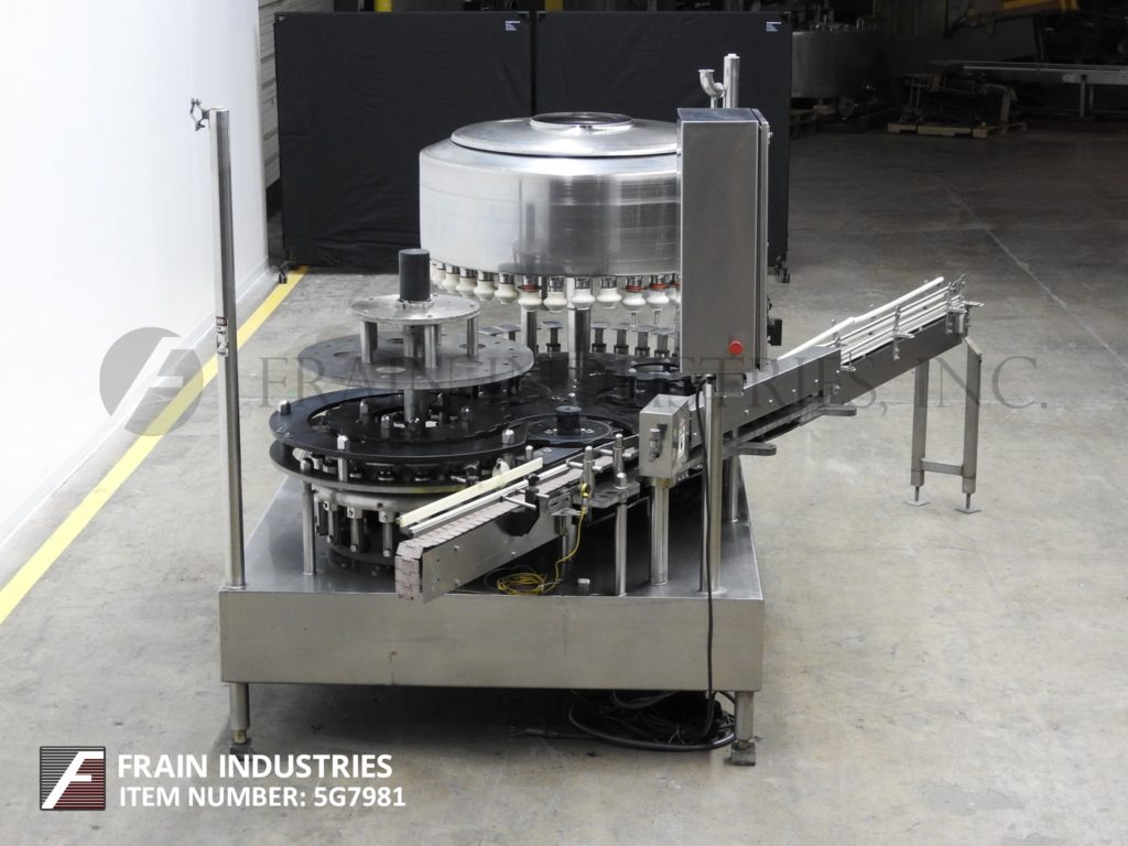 福克,型号FAA-3618,自动,不锈钢,36头旋转,压力重力填料和18磁头旋转封盖机。每分钟325箱 - - 50额定视材料及应用。配备有3.25“ 宽容器输送机,蜗杆到星轮在进料和排出,48" turrett与(36)¾" OD填充到水平喷嘴,集上3¾" 的中心与长5" ×3" 宽容器平台,48" OD产品保持槽18和磁头旋转封盖机与41/2设置(18)____式帽头“ 中心。与按钮启动/停止对填料和输送机控制面板;按钮点动,变速填料快速拨号,通/断开关,用于帽传感器和瓶备份传感器,上/下为碗和压盖机的开关。安装在不锈钢基架。