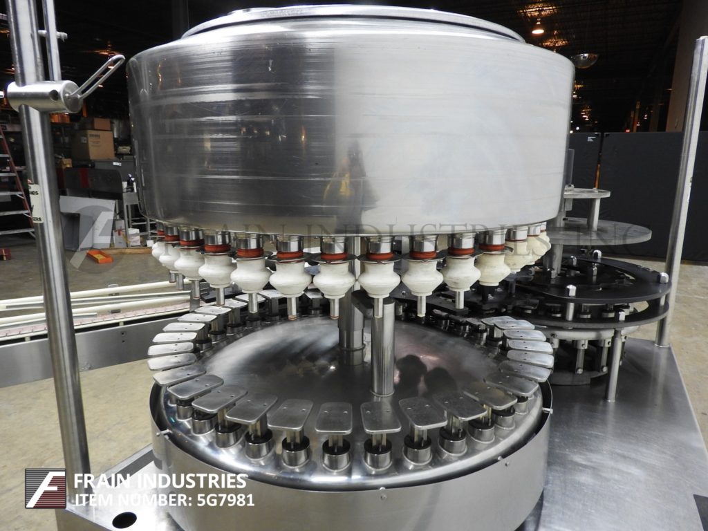自动,不锈钢,32头,旋转,重力/压力填料额定每分钟80至320瓶,这取决于材料和应用。具有4 1/2" 间距,5/8" 直径填充到级喷嘴,蜗杆螺钉进给,进给星轮/放电,颈部定心钟,4‘L×4 3/8’W容器平台和100加仑产品保持坦克。安装在具有高度可调节的支腿不锈钢框架。