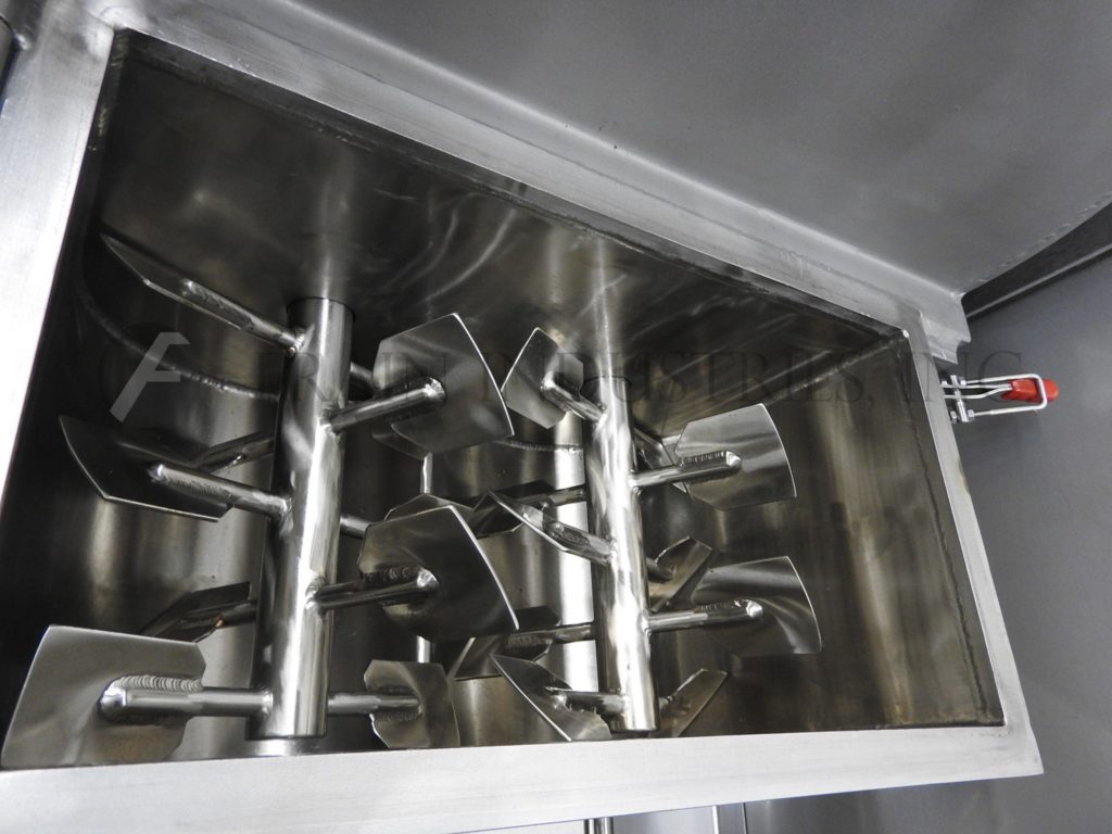 福贝格,FZM.7型,304不锈钢,叶片式搅拌器。混合槽尺寸:16英寸长度;18“宽;在深度12”。配备钳下翻转盖,(2)套(14)角度桨设置在2"直径轴由1½马力驱动和(2)3" x 13"放电端口与16"地间隙。安装在带脚轮的不锈钢底座上。