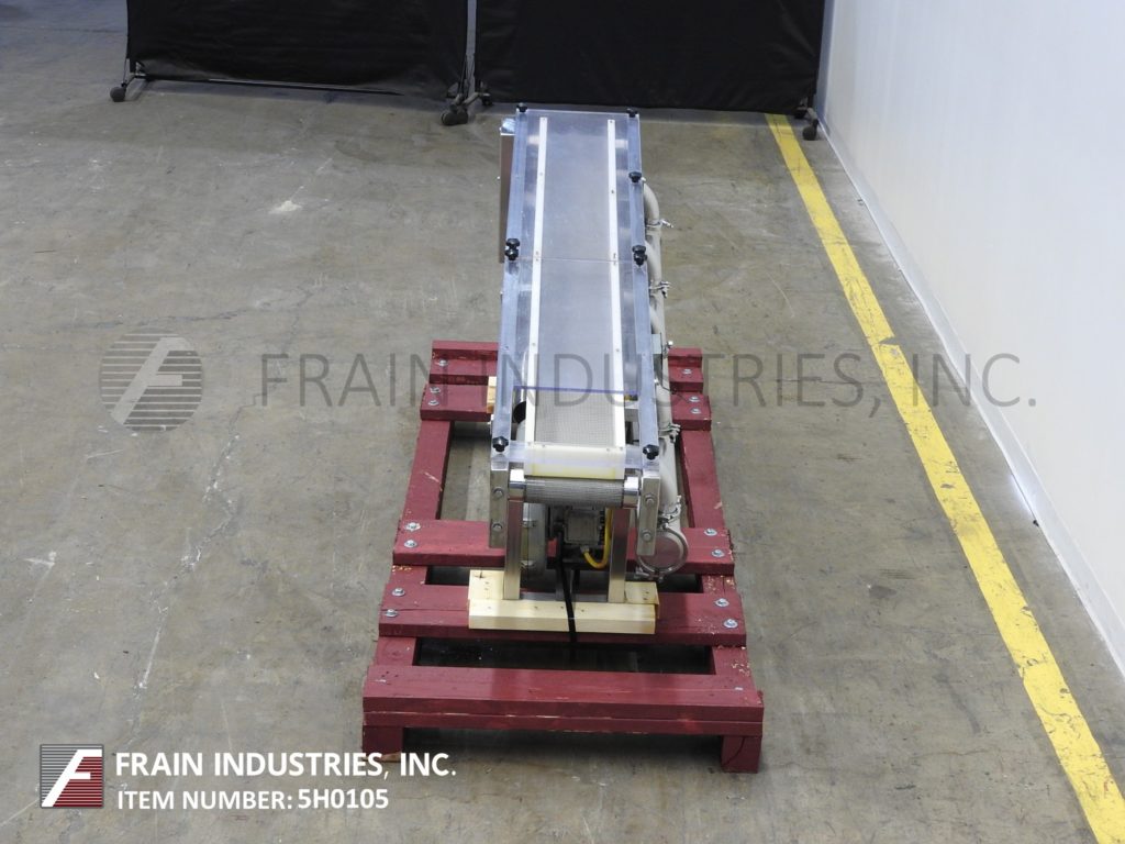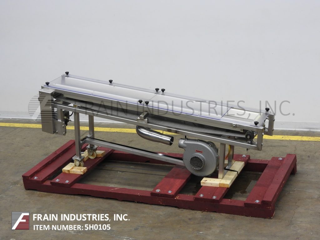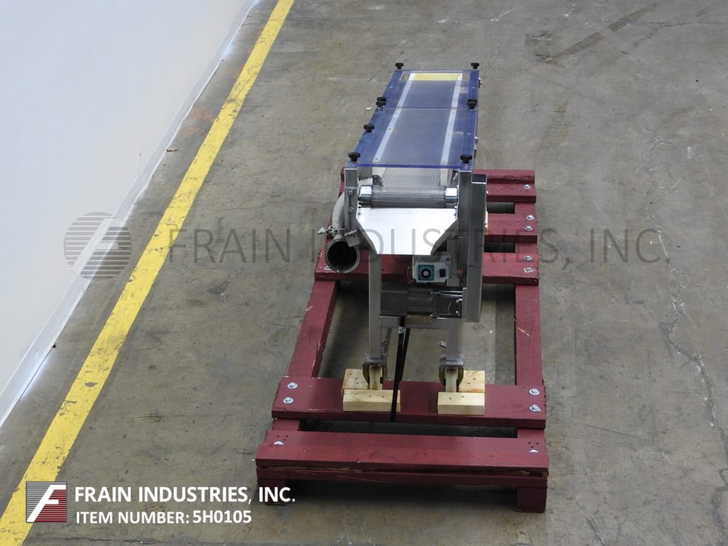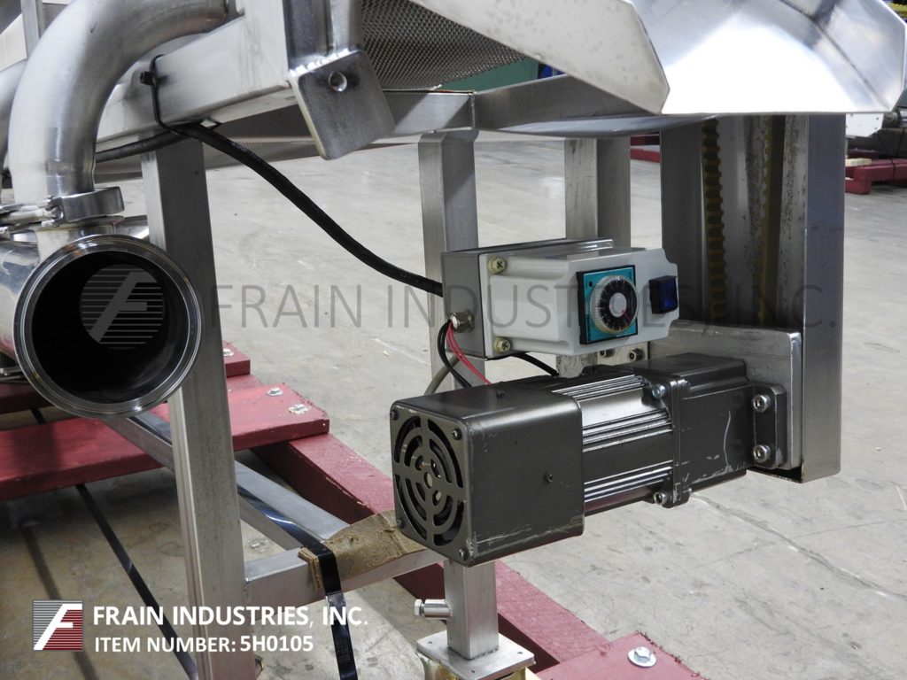 G2材料处理,9英寸宽x 82“长,不锈钢,冷却输送机。配有9英寸宽x 82“长不锈钢网带,7½”宽x4½“长电荷开口,带27”至36“进给高度,25”至34“排放高度,lexan盖有2”间隙,0.88HP鼓风机包装,可变速度控制,并安装在带有高度可调节腿和脚轮的不锈钢框架上。