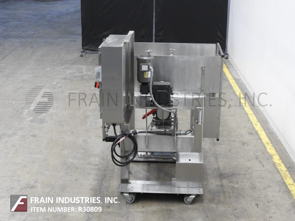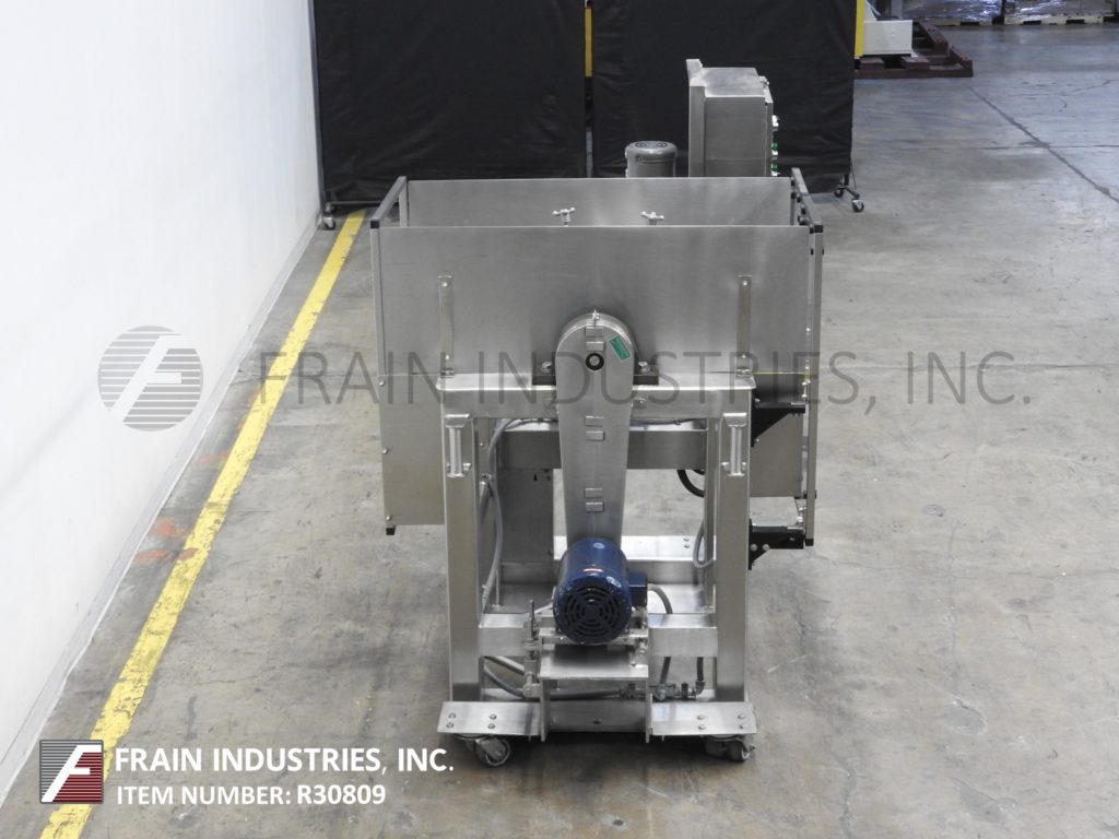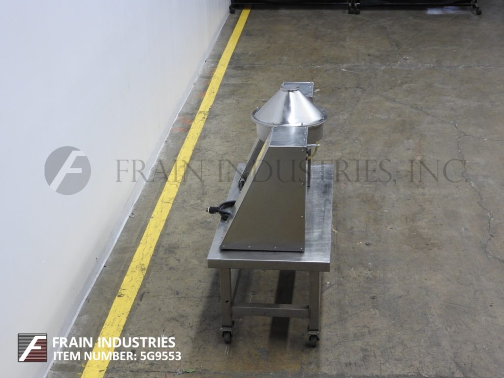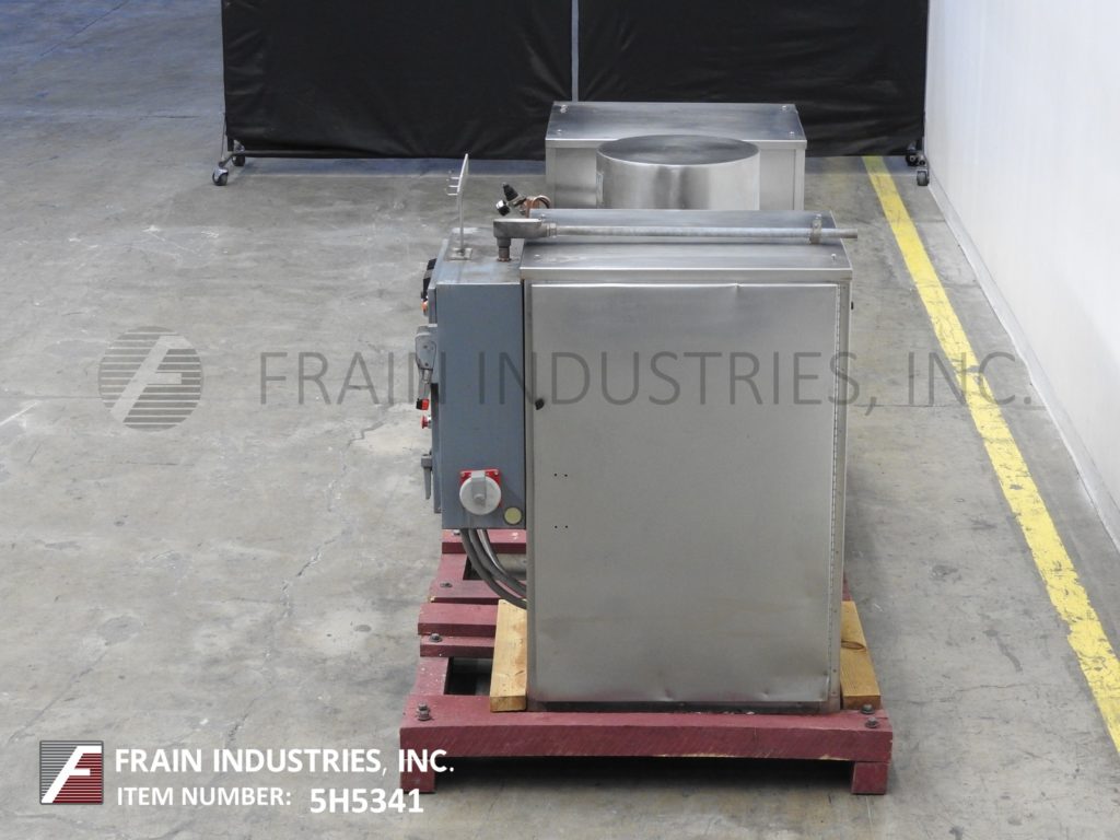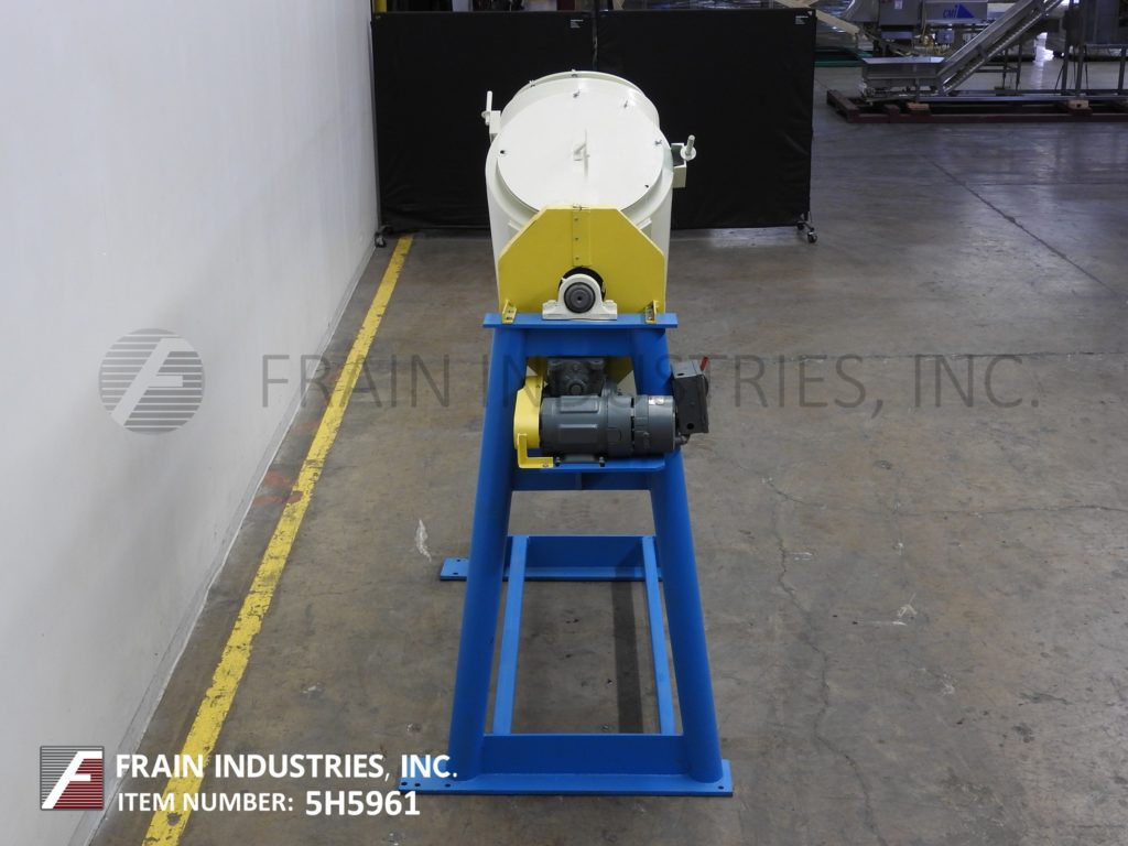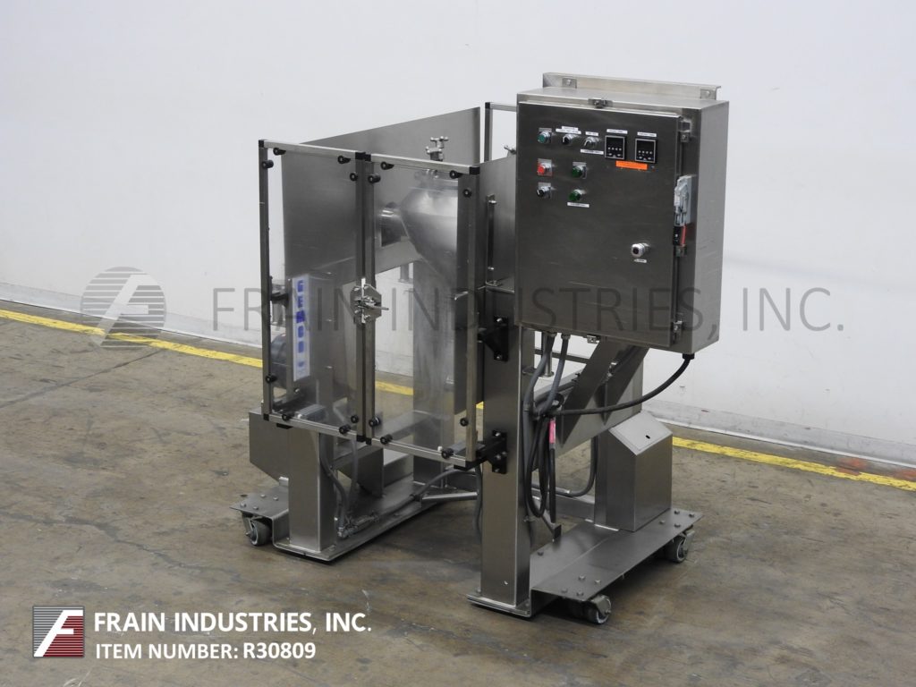 Gemco Model 1立方英尺,不锈钢,斜面滚筒搅拌机,每小时磅产品 - 取决于材料和应用。将锥形尺寸混合在宽度的16“和16”。在配有11" 在进料口和排出口用夹具向下盖和增强杆ID填充水平:1.0立方英尺最大/ 0.33立方英尺最小,额定功率为60磅散装用的40℃或104°F的最高工作温度下的密度控制面板具有用于容器和搅拌器搅拌计时器快,关闭,缓慢和搅拌计时器,断开控制已上,点动,断,开关与启动,停止和急停按钮。安装重型不锈钢底座上与安全防护和锁定脚轮。