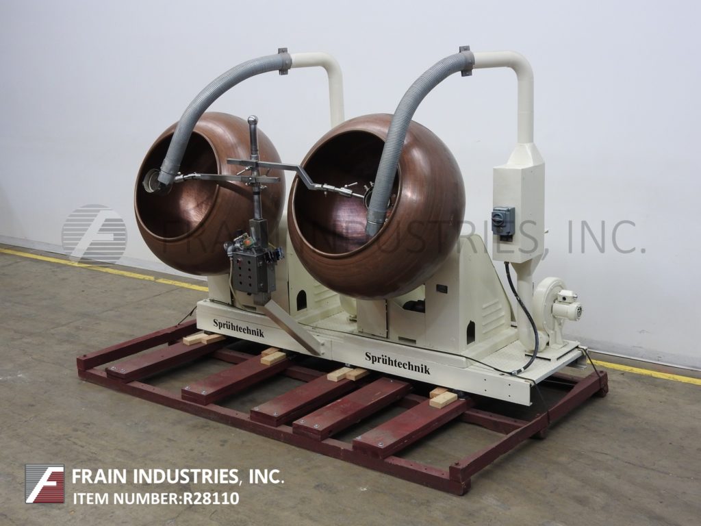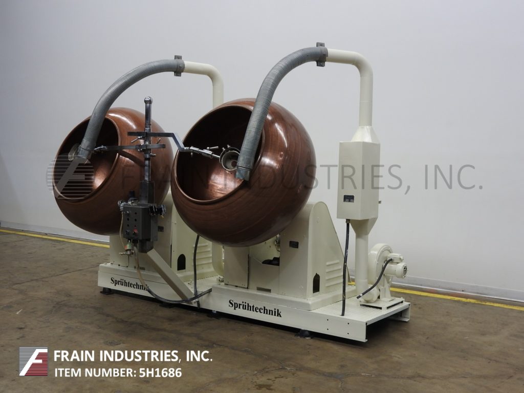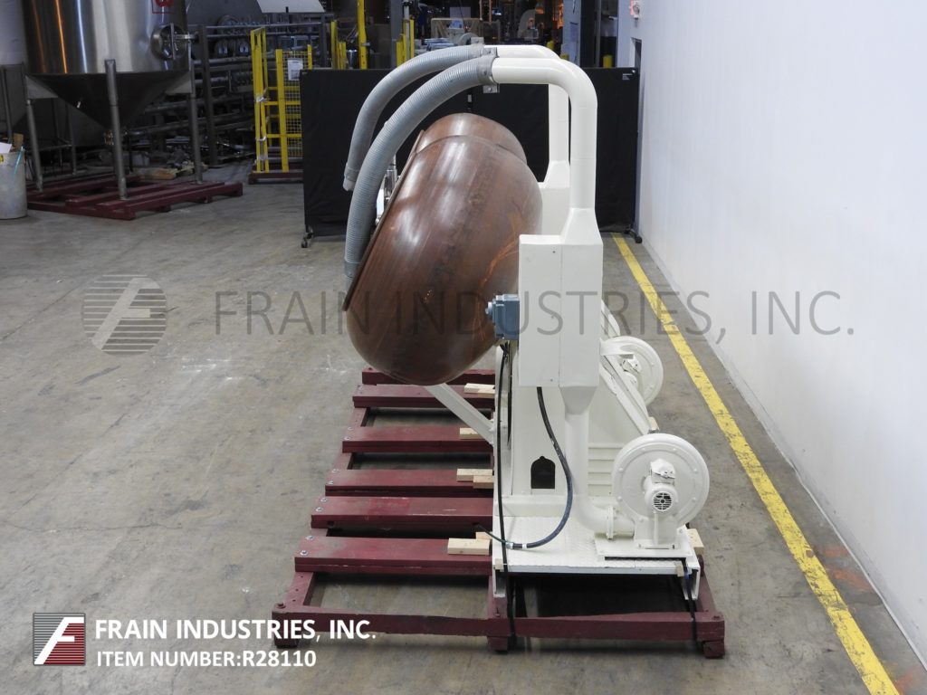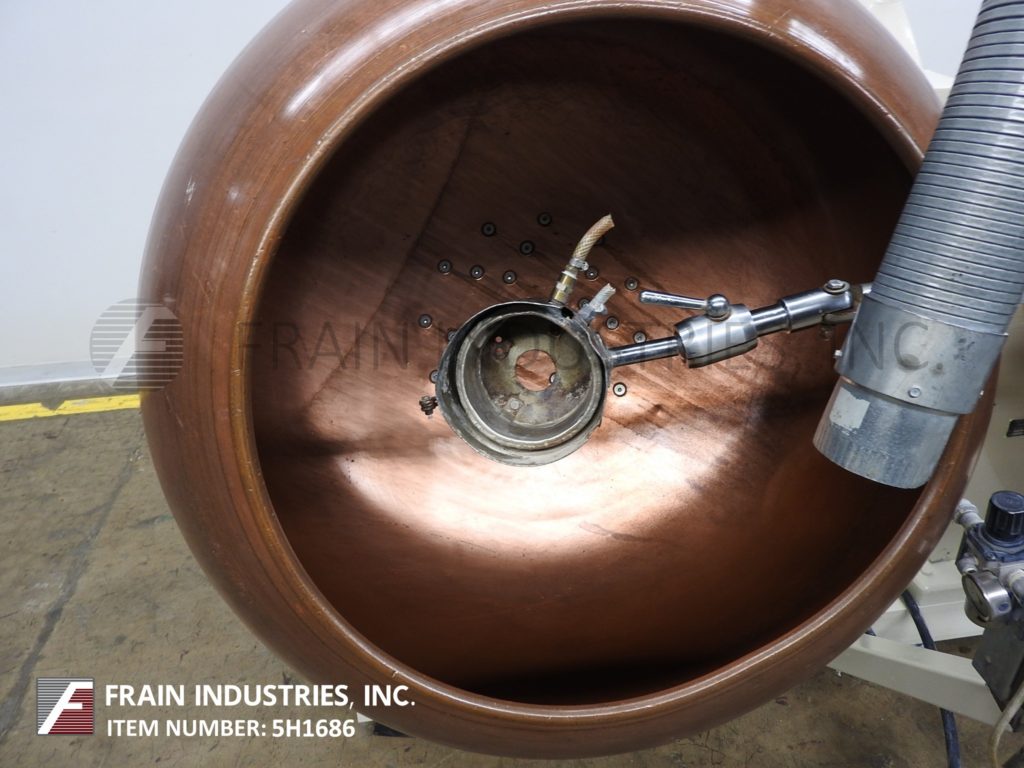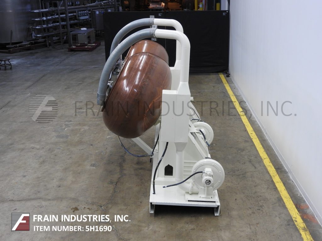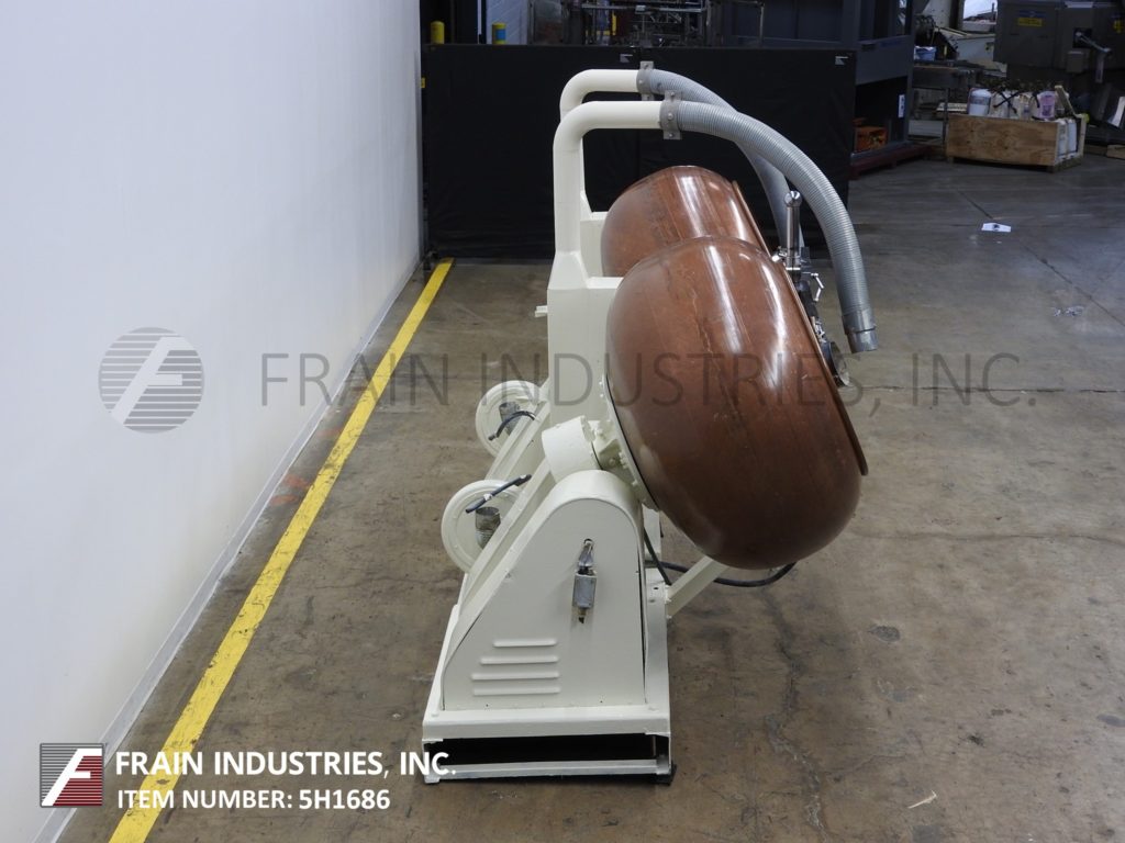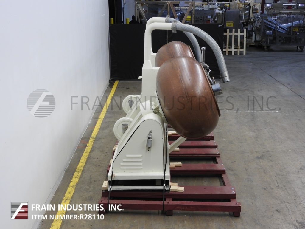 Gerhard Steinberg, Model DK120, dual 48" diameter, copper, doughnut shaped, coating pan system. Equipped with (2) 48" diameter x 30" deep coating bowls with 30" diameter product access ports and 32" ground clearance, (2) model WL-6 0.34 hp blowers and liquid spray nozzles. Control panel with coating output on / off switch, rotation direction switch, manual / auto switch and tilt up / down switch. Mounted on a heavy duty base.