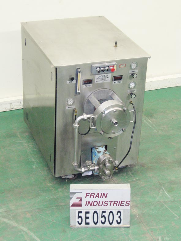 Goodway型号CM35,紧凑型,不锈钢,连续,高剪切,转子,定子,曝气器,混合器,额定每小时250至4800磅产品-取决于材料和应用。配备用于冷却液循环的双壁混合室,具有16“OD/13”内径的金字塔形混合头,具有具有高剪切作用的径向流盘,包括前后转子和定子(2-1/2在CM35上,外径螺纹中心成品出口和卫生密封驱动轴的额定值从150psi标准到450psi。底部产品泵,外径为2“的螺纹进/出端口。控制面板有搅拌器/泵速度控制旋钮、顶部压力调节器、泵和搅拌器手动、自动、关闭开关。安装在不锈钢普通底座上。连续搅拌器为蛋糕糊、奶油填充物、棉花糖、冰凌、搅打奶油、黄油和其他许多东西充气。