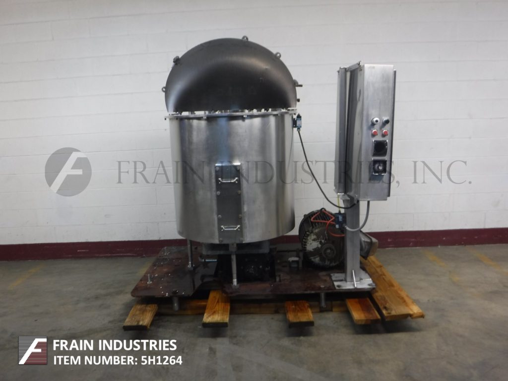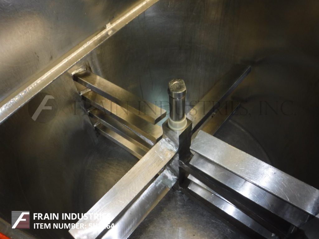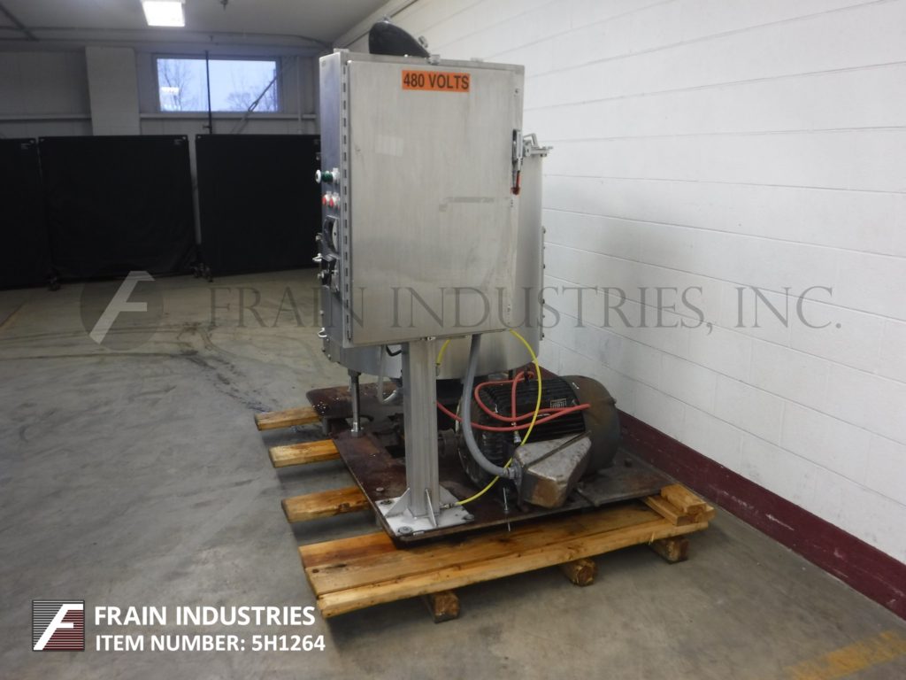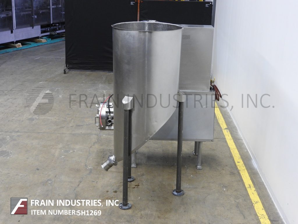 Goodway,VBM 2000型,304不锈钢,泥浆混合器和输送系统。每批额定重量为2000磅,混合时间为4至9分钟,具体取决于材料、应用和机器配置。配备44“内径x 52”直壁不锈钢搅拌槽(300加仑),配有半翻式螺栓下盖、两个固定定子组件(每侧一个)和内部旋转搅拌叶片,底部平台安装有Hp主电机驱动和Hp辅助电机驱动,用于泵送时的慢速搅拌。Waukesha 130型容积式输送泵,内径为3½“OD/3”的座式斜面式进出口,带10个“离地间隙和10马力电机驱动,配备10:1的齿轮箱,排量为45 gpm。控制面板带有搅拌机和泵的启动/停止按钮、搅拌机和泵的定时器刻度盘以及产品阀门打开/关闭开关。安装在96“长x 60”宽的不锈钢平台上。