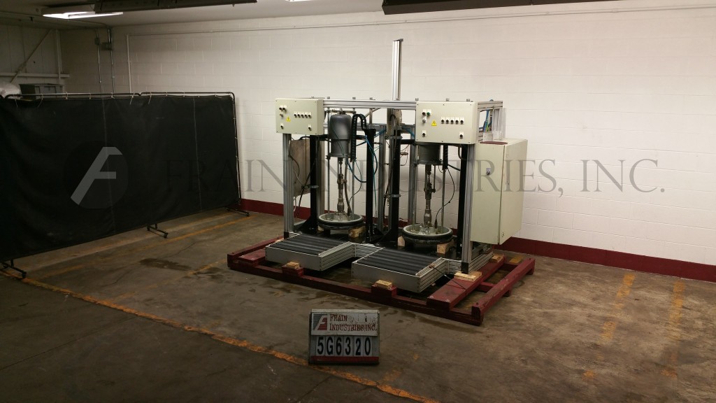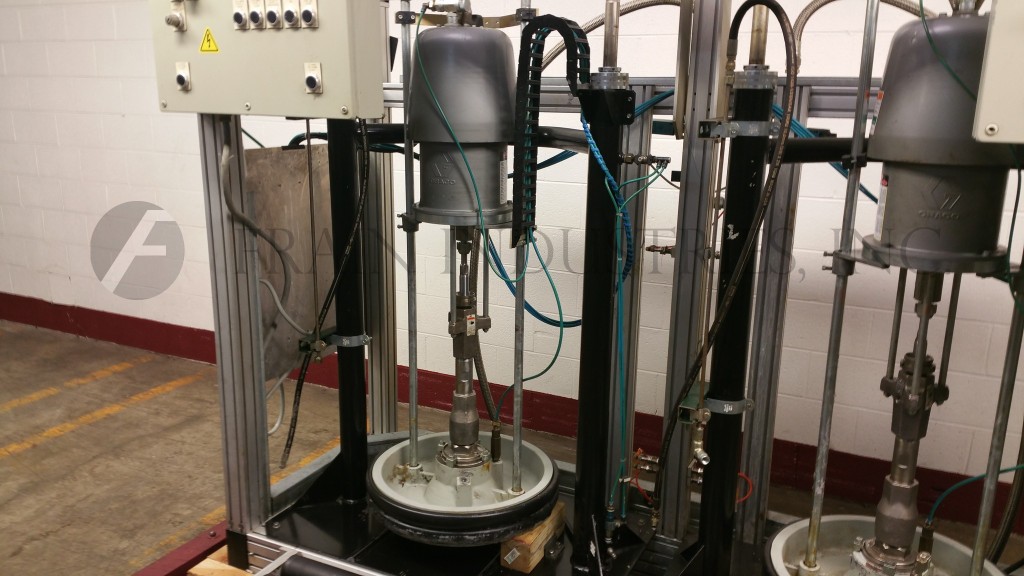 Graco,双斗牛犬气泵,带有支架450位移泵。(2)55:1比例,空气驱动的鼓泵 - 每个额定高达1½加仑/分钟 - 取决于材料和应用。最大流体工作压力:4950 psi(341 bar)。最大空气输入压力:90 psi(6.2 bar),可以处理粘度,高达1,000,000个CPS。配备21½“柱塞,带有单个气动活塞RAM,¾”NPT螺纹流体出口,双站控制,双手按钮操作,并安装在涂漆的底架上,具有(2)26½“宽X 24”长滚筒鼓式输送机。