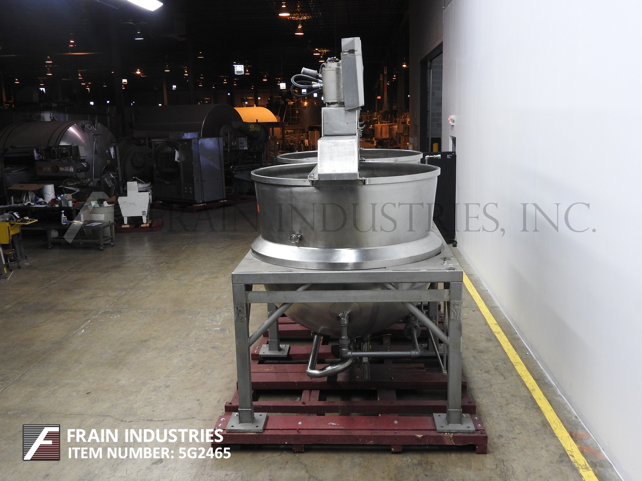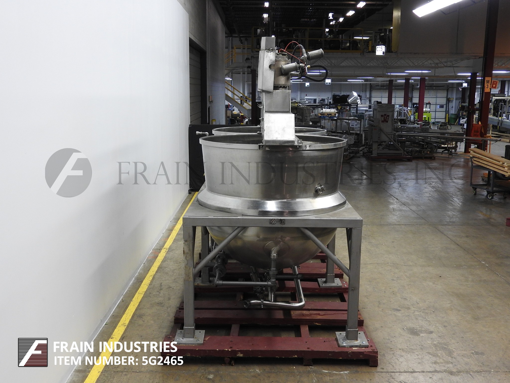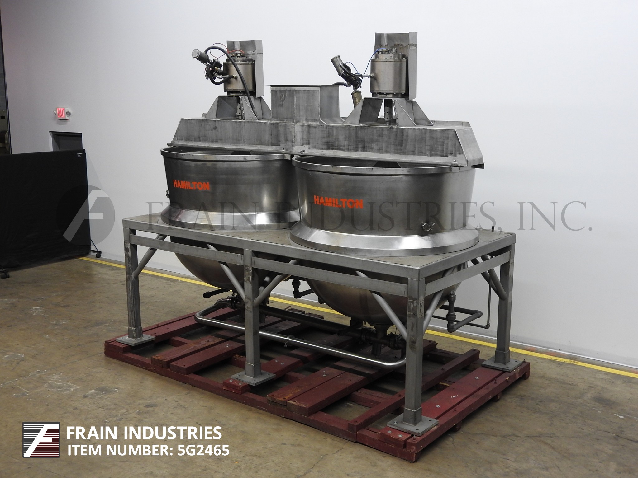 汉密尔顿,双600加仑,304不锈钢半夹克水壶。船舶尺寸:65英寸直径26英寸直墙。夹克被评为110psi @ 340°F。(2)打开顶部设备,配备液压驱动器的桨式搅拌,(1)2½“OD /1¾”ID Tri-Clamp风格接入安装在直墙上,(4)2“螺纹夹克端口,(1)11”OD/ 6“ID八个螺栓法兰中心底部。水壶安装在带腿的不锈钢底座上。