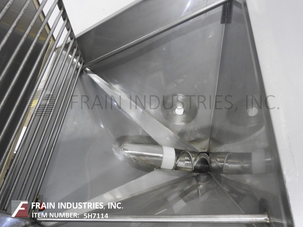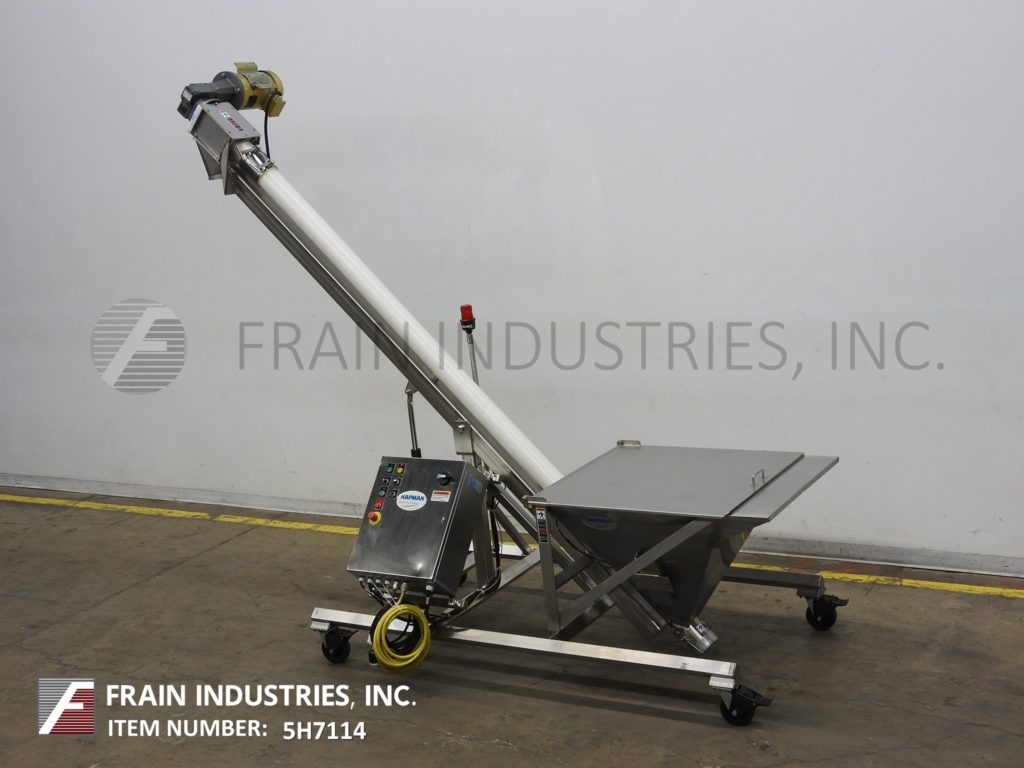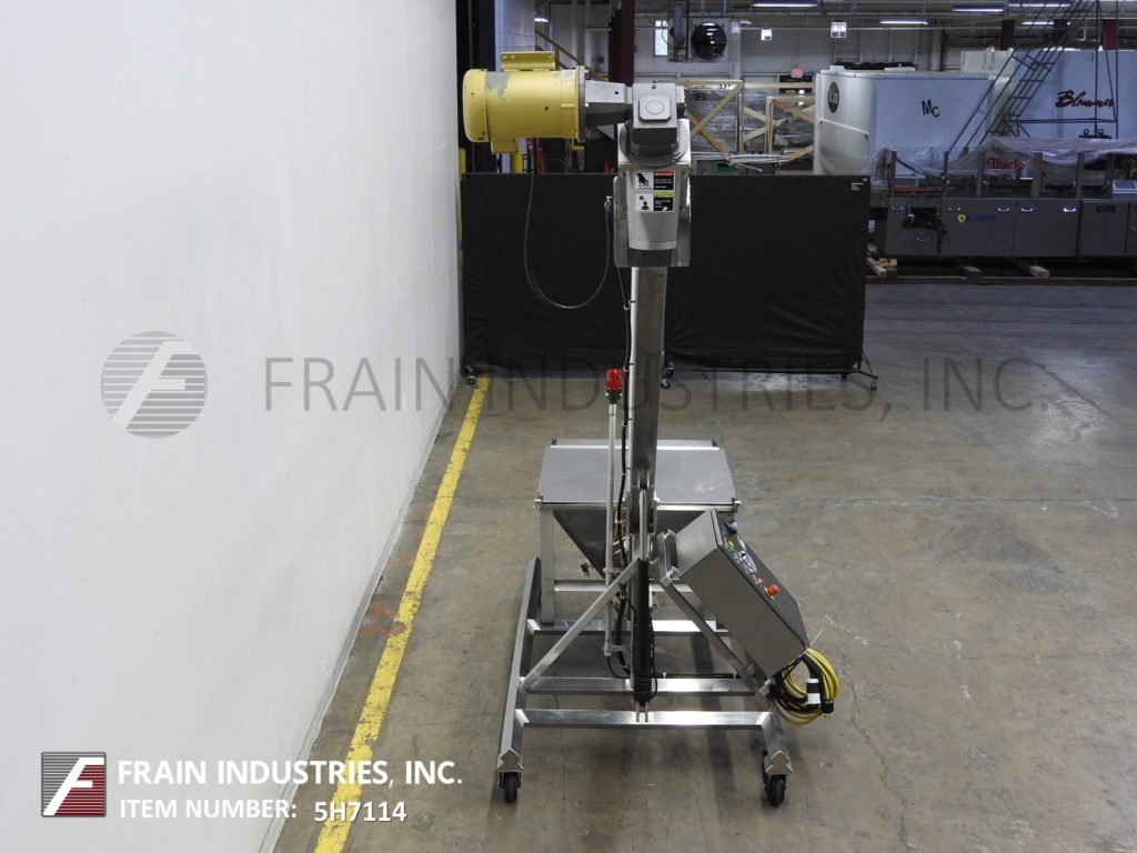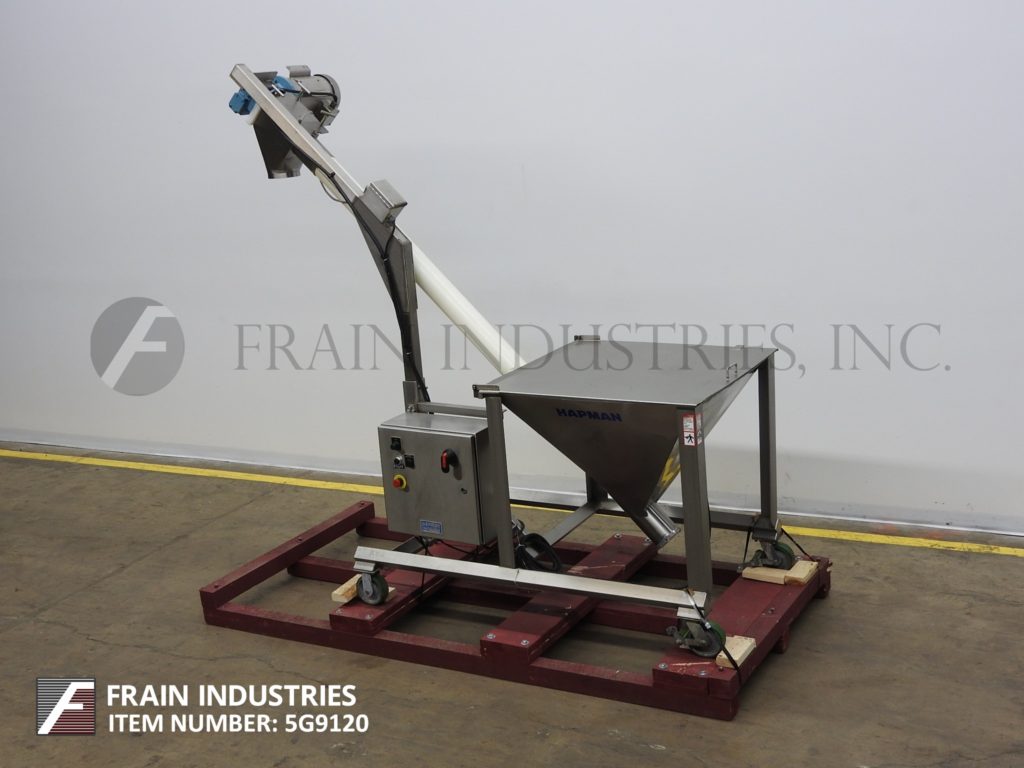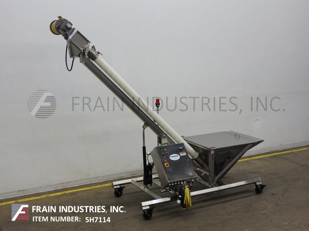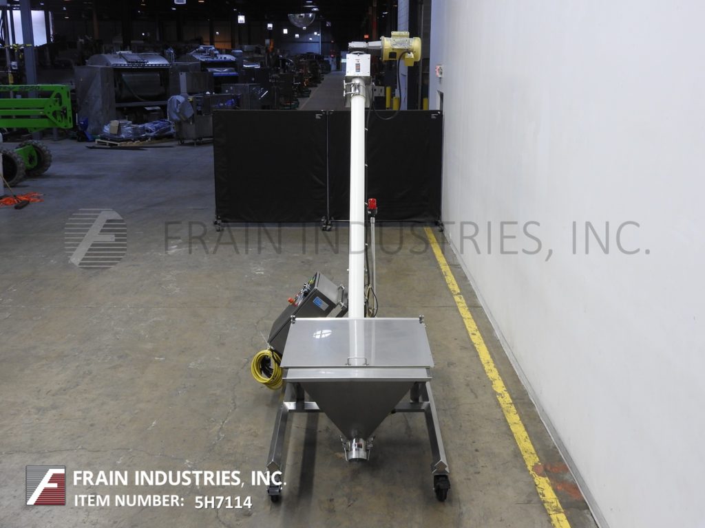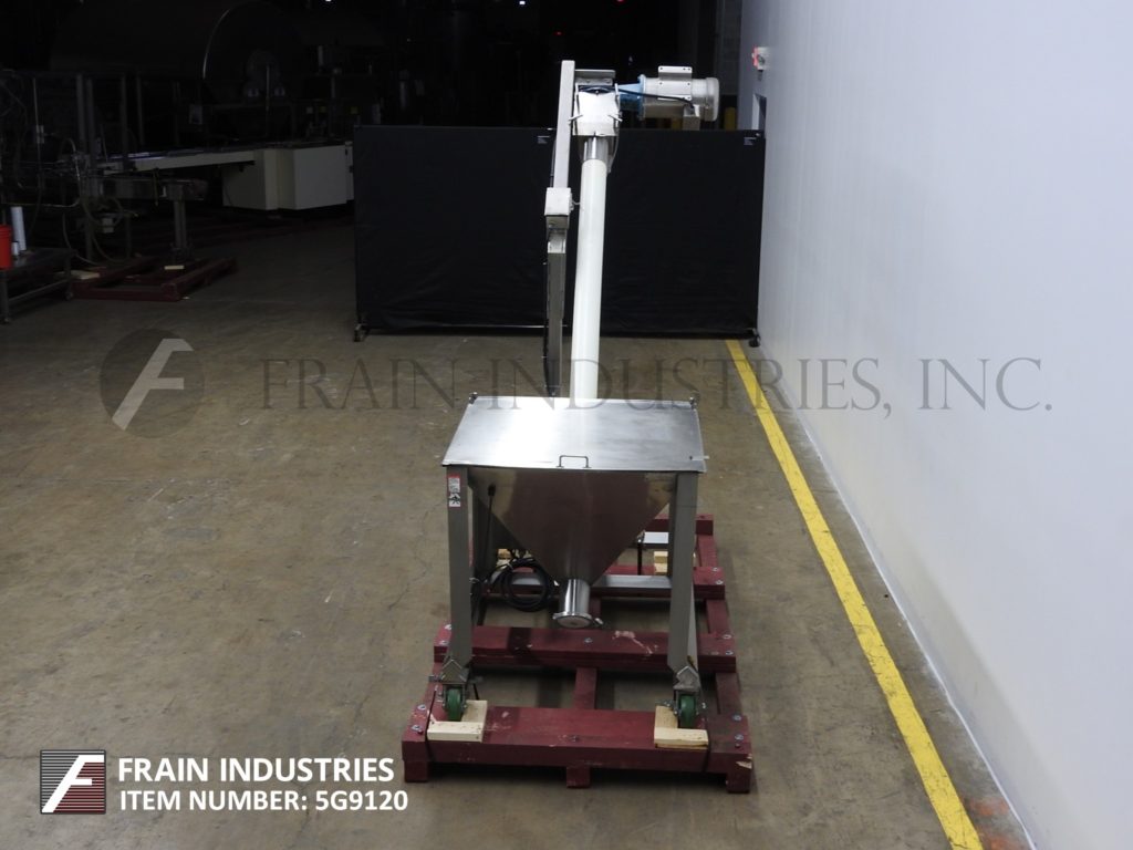哈普曼,300系列,螺旋输送机和产品料斗。配有36“长x 36“宽x 30“深不锈钢产品料斗与电网安全,树搅拌、振动搅拌2¾OD x 168”长螺旋输送螺旋不锈钢产品,3”ID x 128“长灵活的聚乙烯管和顶部安装2 Hp马达驱动6“OD产品卸货港113”地面间隙。控制面板具有升降开关,变速,E-stop和启动/停止和反向按钮控制。根据材料、应用和机器配置而定。安装在不锈钢框架与脚轮。