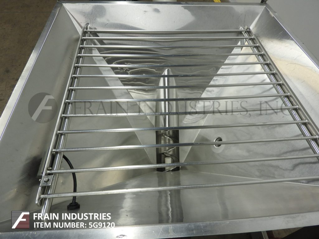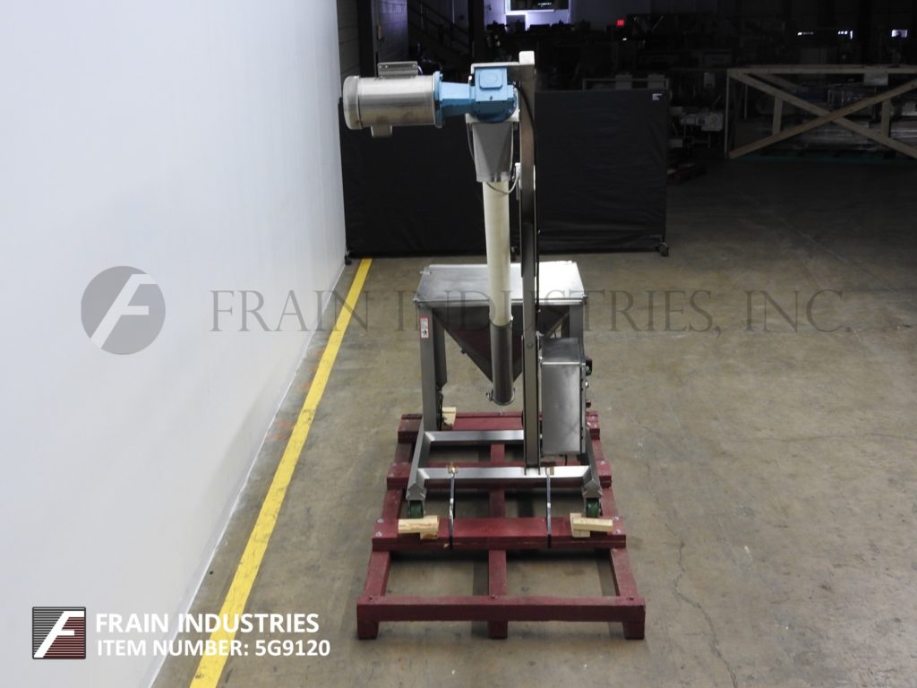 螺旋输送机和产品料斗。根据材料、应用、环境和机器配置,额定重量为每小时120 - 360立方英尺/小时。配备35 "长x 35 "宽x 32 "深不锈钢产品料斗,4"直径x 144"长的产品螺旋输送螺丝,5" ID x 96"长柔性聚管和顶部安装3马力电机驱动器有6"外径产品排出端口与96"地间隙。控制面板具有升降开关,变速,E-stop和启动/停止和反向按钮控制。安装在框架与脚轮。