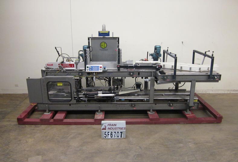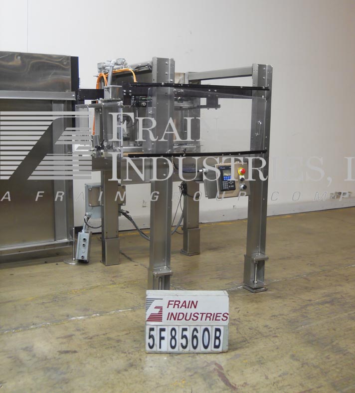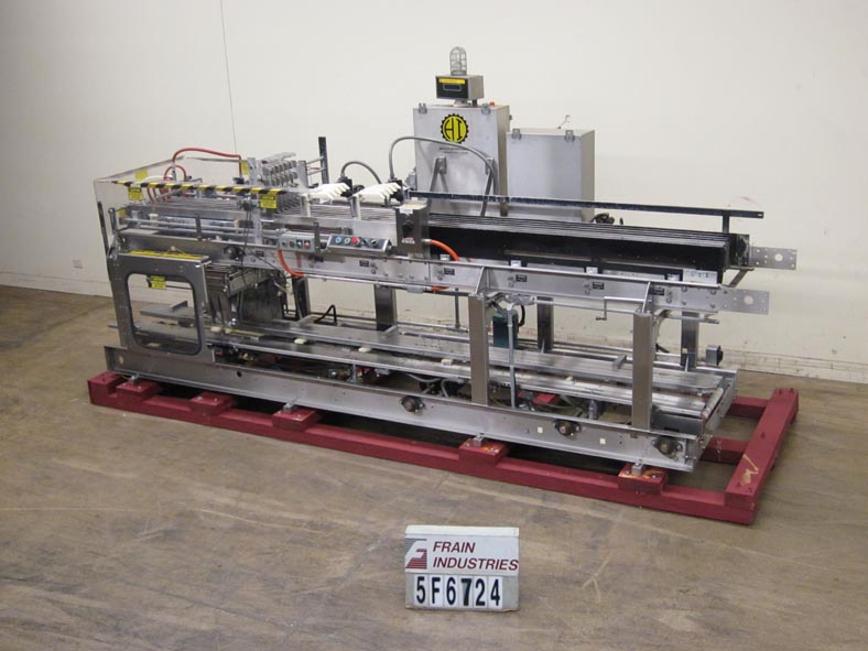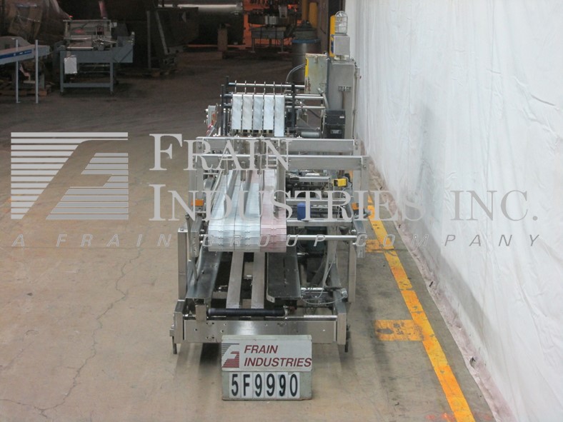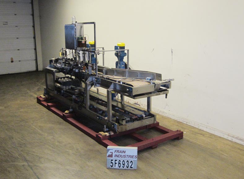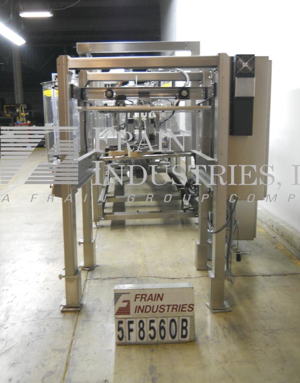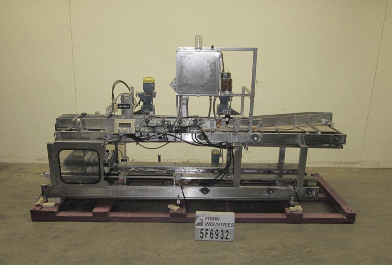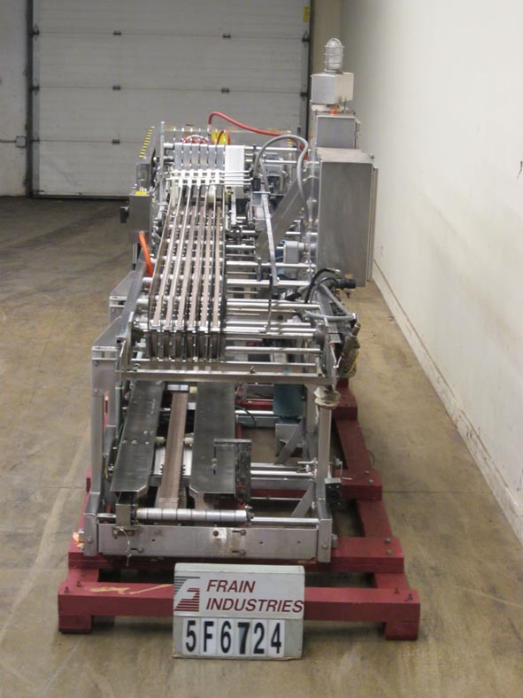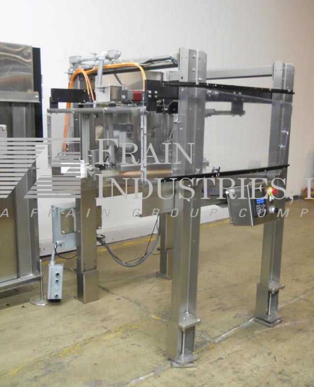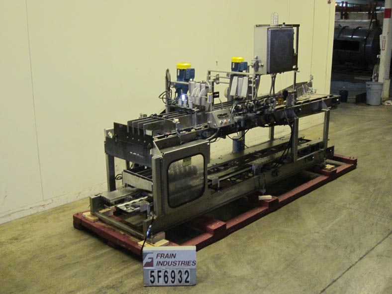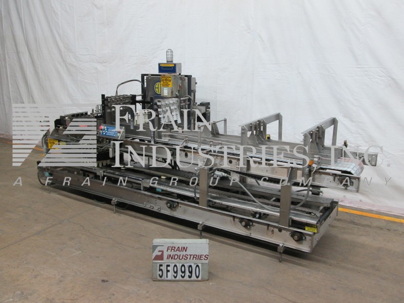 Hartness 825型、自动、不锈钢steel, drop case packer rated from 10 to 35 cases per minute with number of containers – depending on materials and application. Case size range: 6" to 24" in Length; 6" to 16" in Width; 1-1/2" to 12" in Height. Equipped with a 96" long x 18" wide (3) lane Delrin product infeed conveyor, static dividers, container stops, 96" long bottom empty case infeed conveyor, with desending drop product elevator and grid into case with skate roller discharge section. Control panel with push button controls and e-stop. Mounted on stainless steel frame.