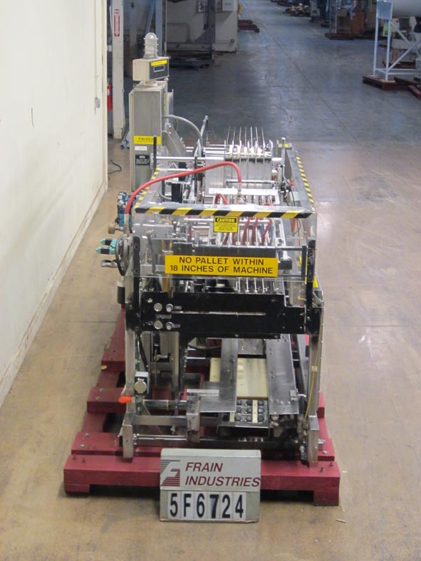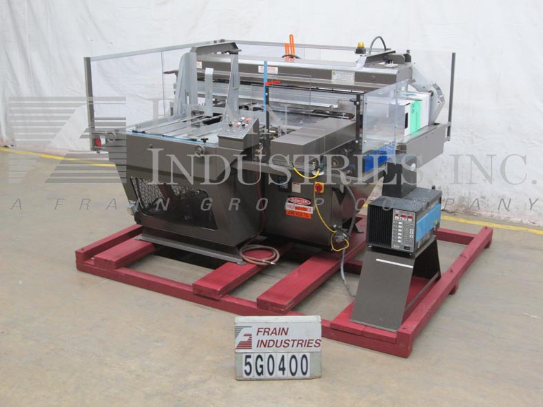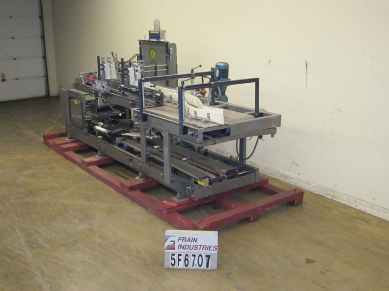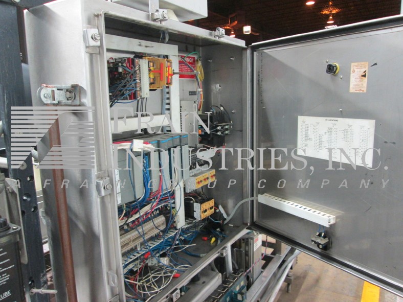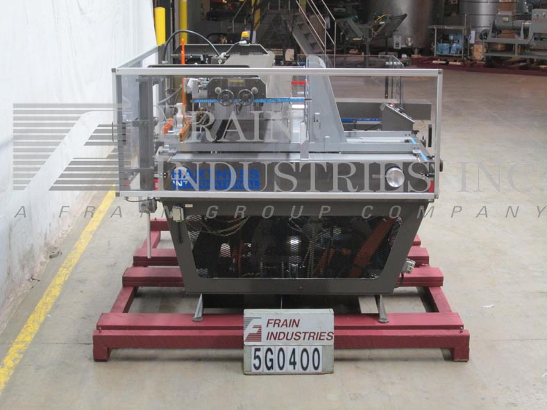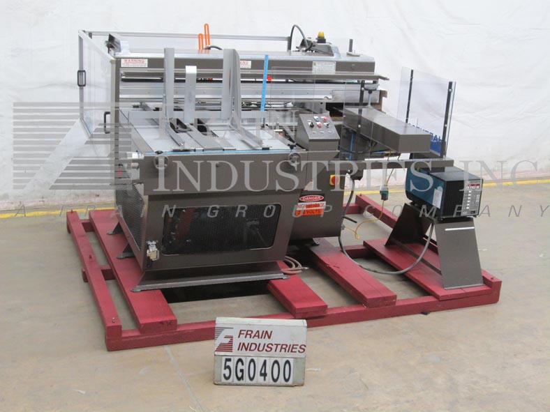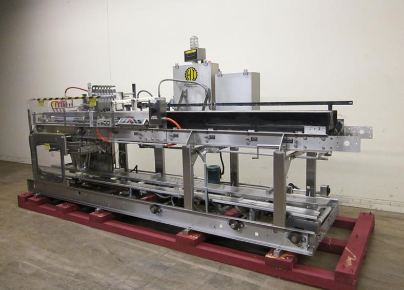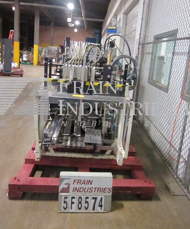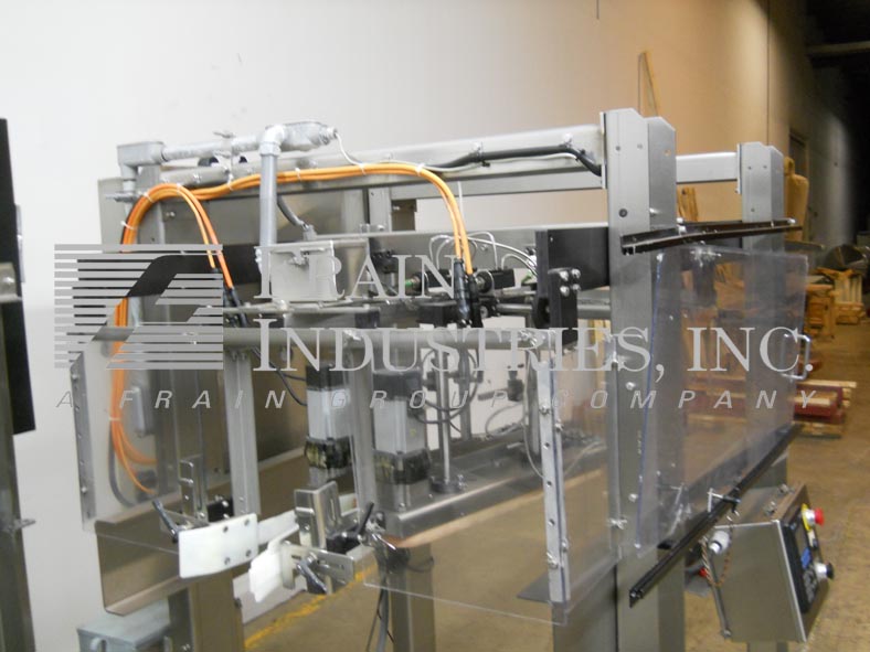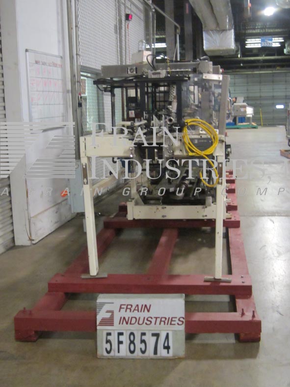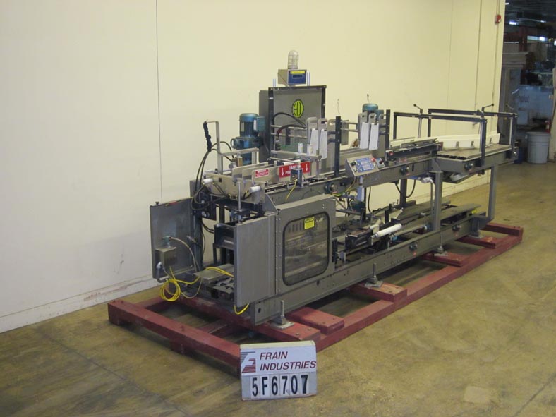 Hartness 825型、自动、不锈钢steel, drop case packer rated from 10 to 35 cases per minute with number of containers – depending on materials and application. Case size range: 6" to 24" in Length; 6" to 16" in Width; 1-1/2" to 12" in Height. Equipped with a 96" long x 18" wide (3) lane Delrin product infeed conveyor, static dividers, container stops, 96" long bottom empty case infeed conveyor, with desending drop product elevator and grid into case with skate roller discharge section. Control panel with push button controls and e-stop. Mounted on stainless steel frame.