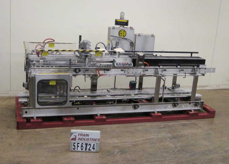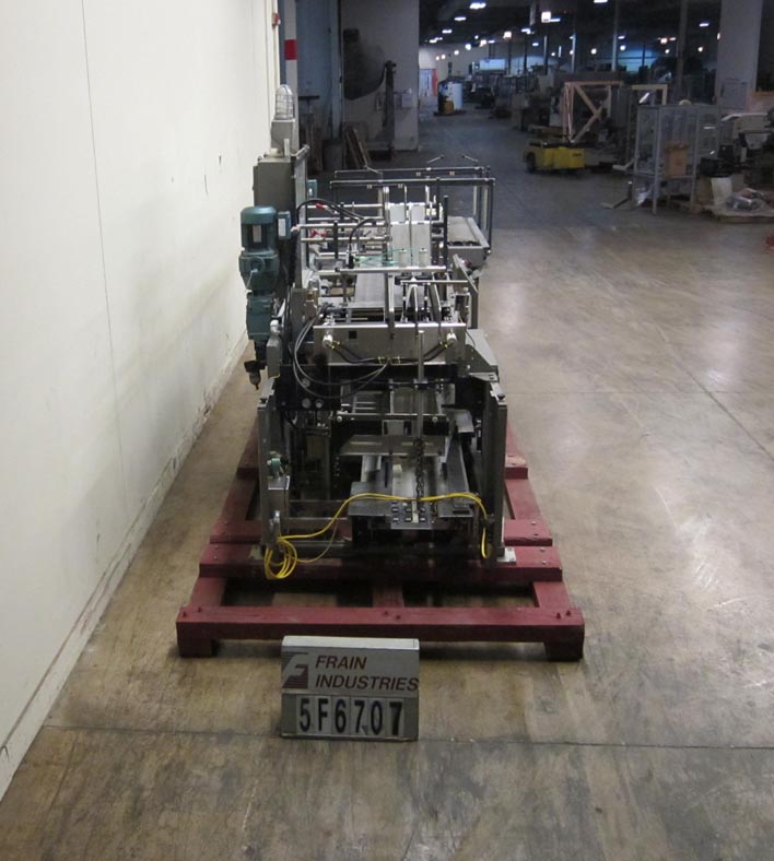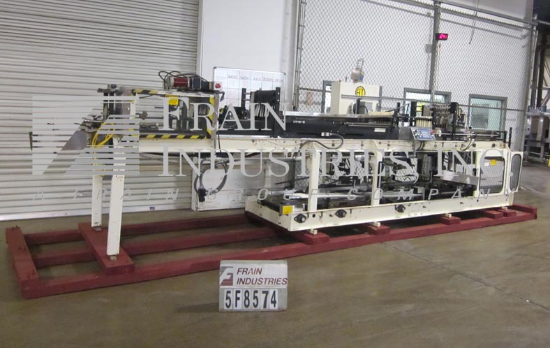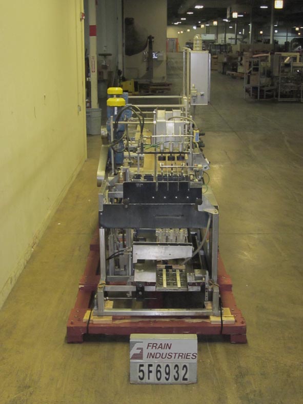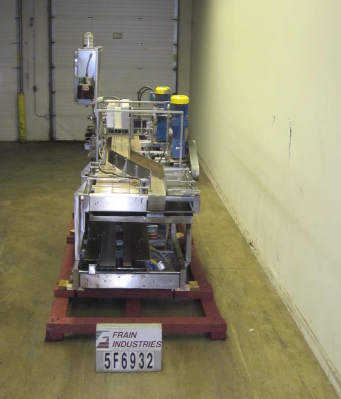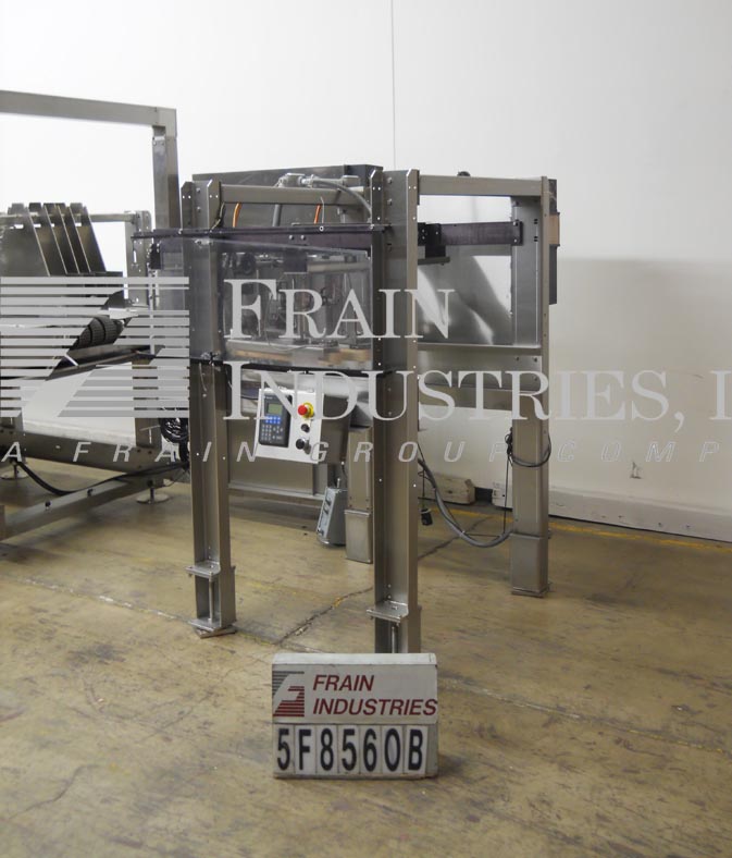 Hartness自动,型号825,紧凑,不锈钢steel, drop case packer rated from 10 to 30 cases per minute with number of product – depending on materials and application. Case size range: 6" to 24" in Length; 6" to 16" in Width; 1-1/2" to 19" in Height Container size range 2oz to 2-1/2 gallons of glass, plastic, cans, round containers and various shapes and sizes and can handle HSC, RSC, tray and display trays (with proper change parts). Equipped with 120" long x 12" wide plastic delron in feed conveyor with 6 adjusatable lane dividers, dual 72" long x 3-1/2" wide empty bottom plastic delron case conveyor with desending soft drop product elevator and grid into case. Control panel with in feed, air bladder and case controls with start and e-stop buttons. Mounted on heavy duty base frame.
