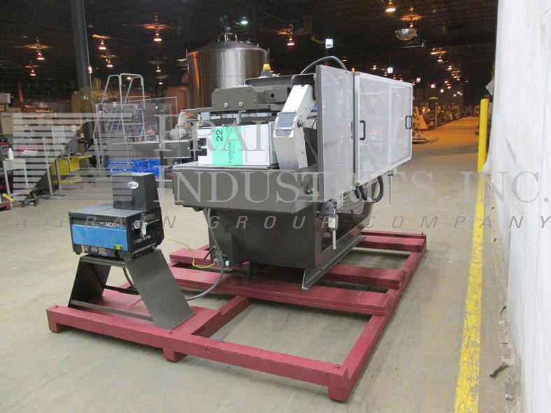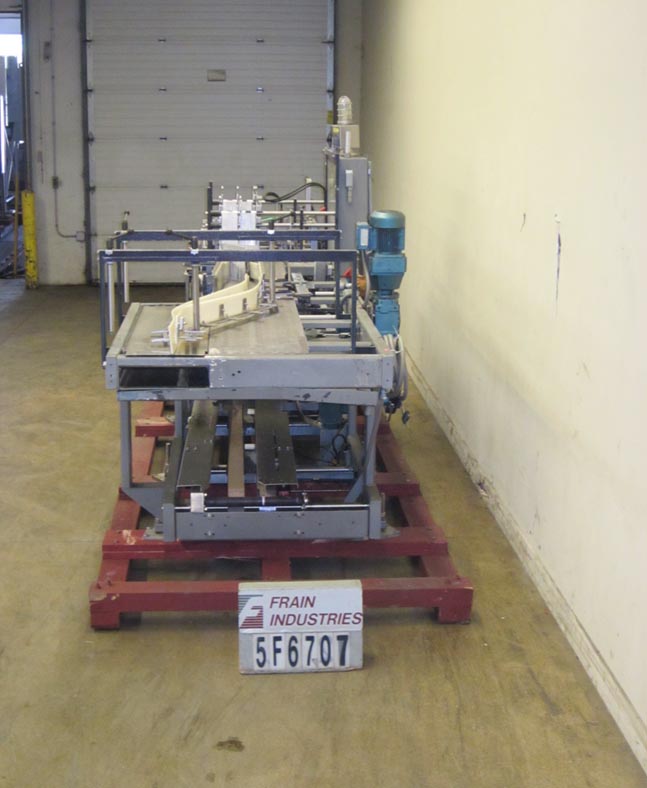 Hartness automatic, compact, desending, drop case packer rated from 10 to 20 cases per minute with number of containers – depending on materials and application. Case size range: 6" to 24" in Length; 6" to 16" in Width; 1-1/2" to 19" in Height and can handle most round and rectangle style containers both with proper change part. Equipped with 130" long x 18" wide heavy duty, thick plastic in feed conveyor with adjustable lane dividers, 60" long x 18" wide empty bottom plastic delron case conveyor, with desending soft drop product grid into case and skate roller discharge section. Control panel has A/B PLC with touch pad controller and variable speed drive controller. Mounted on heavy duty base frame.