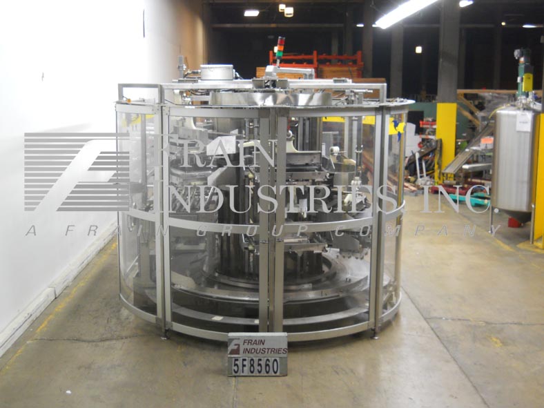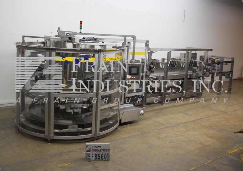 Hartness Global Pack Model 3500, 6 station rotary, continuous motion, zero impact, case packer rated from 20 to 35 cases per minute, with number of containers – depending on materials, application and pack pattern. Can handle most containers glass, plastic, round and non round from 10 ounces to 2-1/2 gallons and place into corrugated, tab lock, RSC, or plastic cases. Equipped with (4) 44" long x 3" wide to (1)108" long x 18" to (1) 24" long x 18" wide plastic in feed conveyors with (4) product lane dividers, product overhead orientor and lugged walking beam feeder into 6 head rotary gripper system with grids and gripper fingers to capture containers and ensure perfect alignment of containers every time for zero breakage while desending into the cases. Control panel has A/B controller and A/B swing arm panel view controls with machine start, stop, reset, e-stop buttons, statis light bar and safety guarding. Mounted on heavy duty base frame.