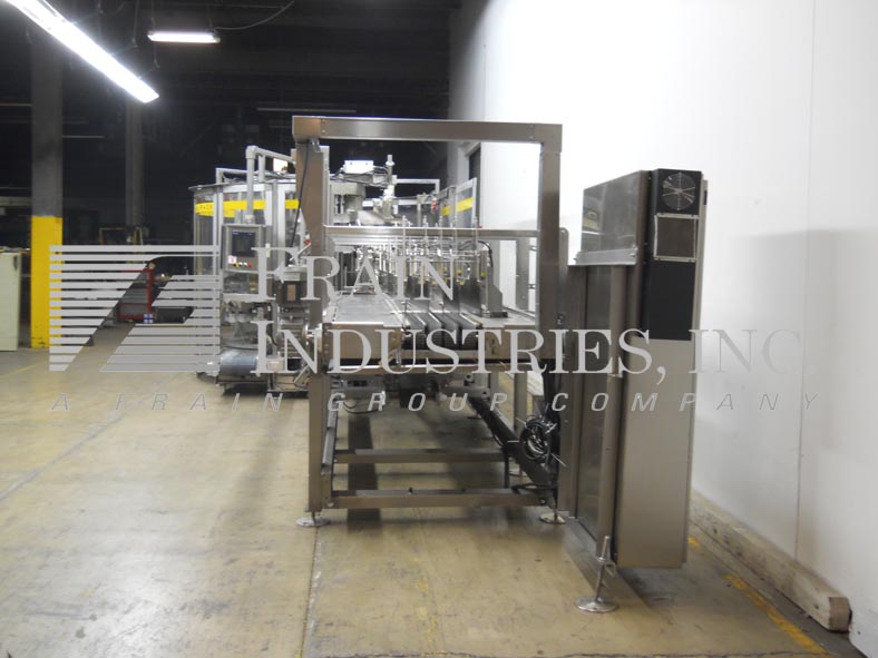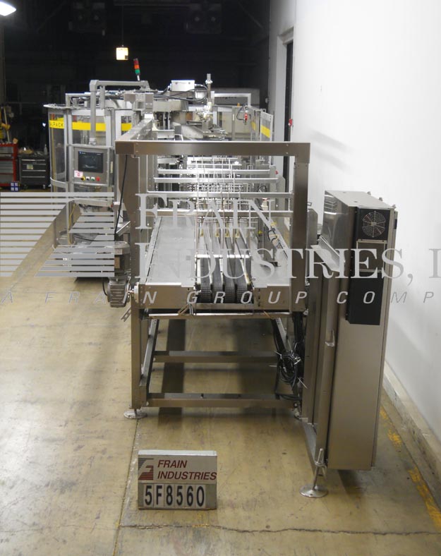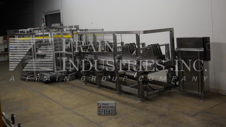 versatile. to handles containers that tend to bridge, lock up or shingle when conveyed or transferred. Equipped with 72" long x 16" wide product in feed conveyor, that feeds into 128" long product laner currently has (8) lanes with 1" wide conveyors each. 72" long bottom case belt in feed conveyor to 96" long lugged empty case conveyor, desending soft drop, with 17" x 17" grid area currently set for 6 x 8 pack pattern. Control panel has A/B controller with touch pad controls, operator start, stop, e-stop push buttons, central lubrication and pneumatic valve systems. Mounted on heavy duty base frame.