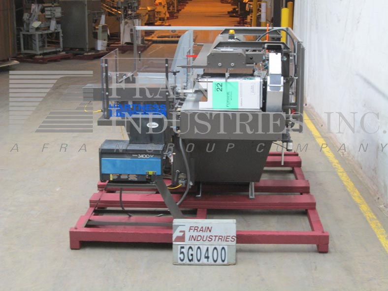 Hartness, Model CE201G, automatic, case erector / bottom hot melt glue sealer rated from 5 to 30 cases per minute – depending on materials and application. Case size range: 5-3/4" to 24" in Length; 5-3/4" to 24" in Width; 10" to 33" in Height. Equipped with flat blank case magazine, suction cup case pick and place, erector with plows and flap closers, hot melt glue system and single arm compression ram. Control panel has A/B controller with touch pad controls and digital read out and start, stop, mast up / down switches with e-stop with Lexan safety guarding. Mounted on heavy duty base frame.