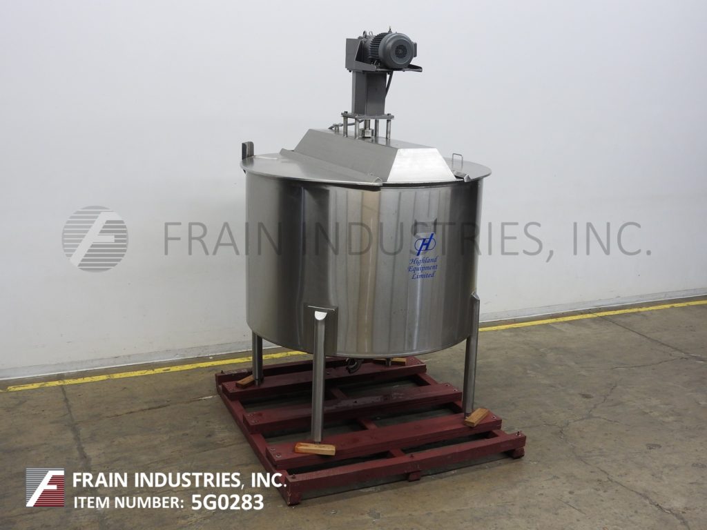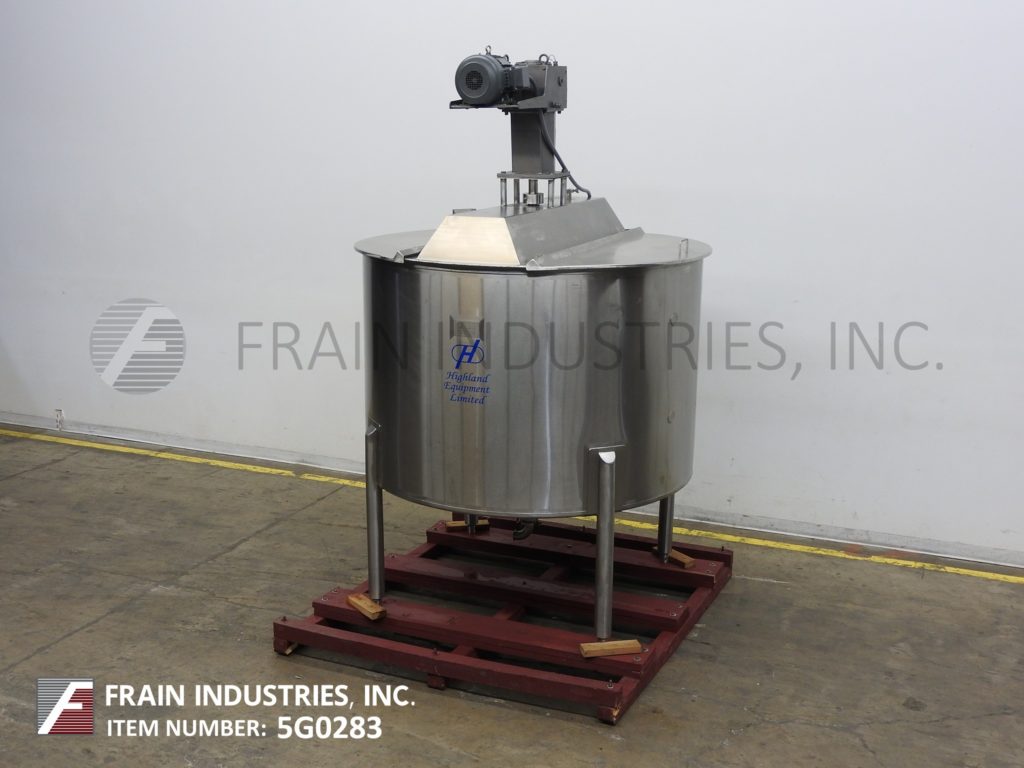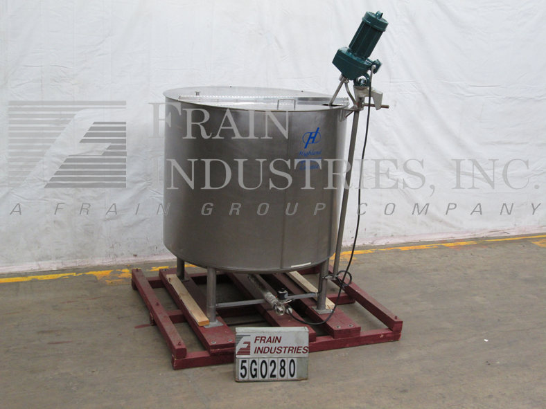 高地模型750加仑,316不锈钢,单壁搅拌罐。船舶尺寸:68“ID; 48”直墙。配有开放式顶部,双重翻盖顶盖和桥式安装桨式搅拌器。锥形底部有2-1 / 2“OD卫生中心底部放电。安装在(4)不锈钢臀部插座腿上。