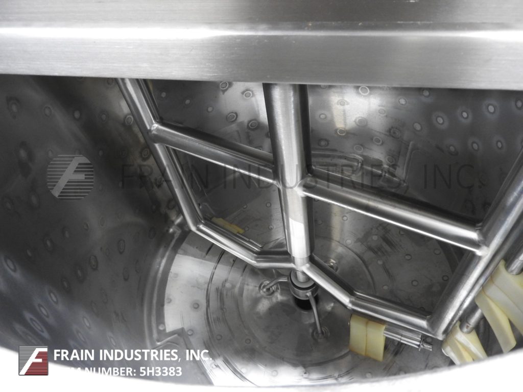 高地型号1600加仑,304不锈钢1/2凹凸夹套,搅拌罐。64“OD x 120”直墙,圆顶顶部带16英寸的OD Manway带翻盖螺栓盖板,顶部安装闪电桨式空气搅拌器,(3)3-1 / 2“OD卫生和(1)2”ID螺纹顶部港口。1/2凹陷侧夹在50psi @ 400°F,(4)1“OD Sanitray夹套中/出口端口和(1)2”ID侧螺纹侧端口。锥底,有卫生5“OD中心底部放电,球形阀门和6“落地间隙(1)2”OD卫生港,带温度探头,安装在(4)腿臀部插座腿上。
