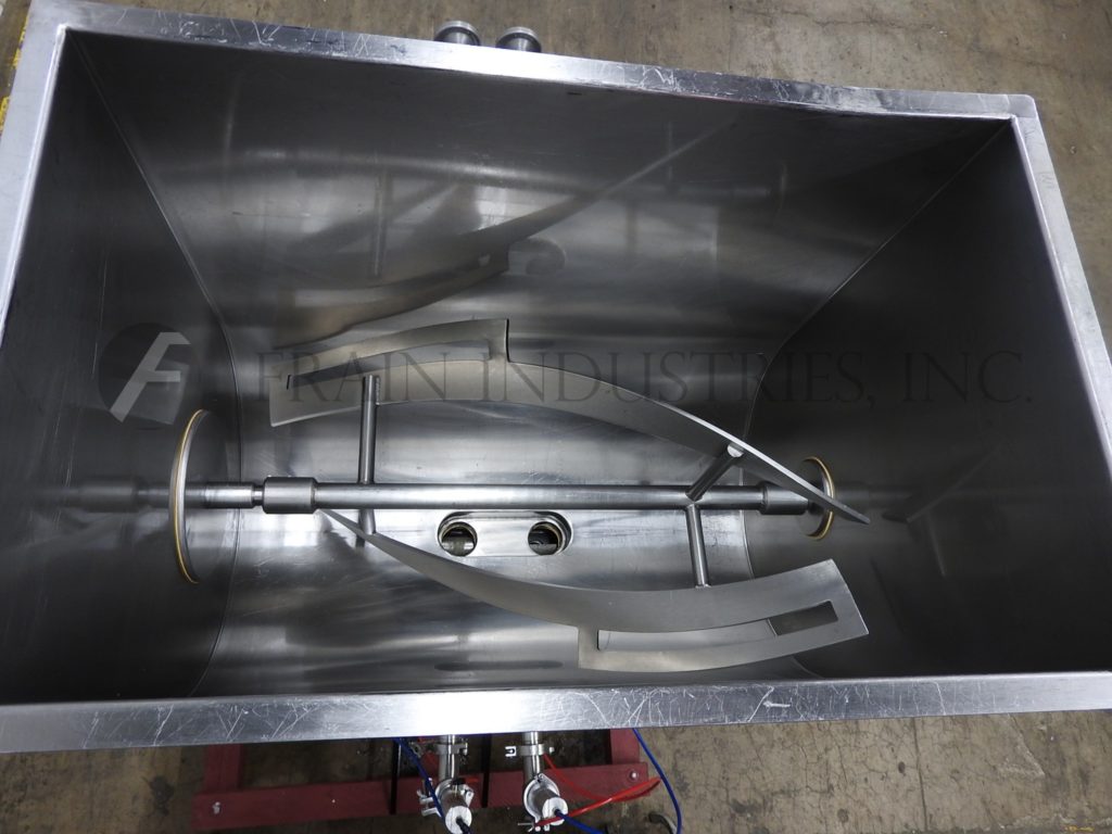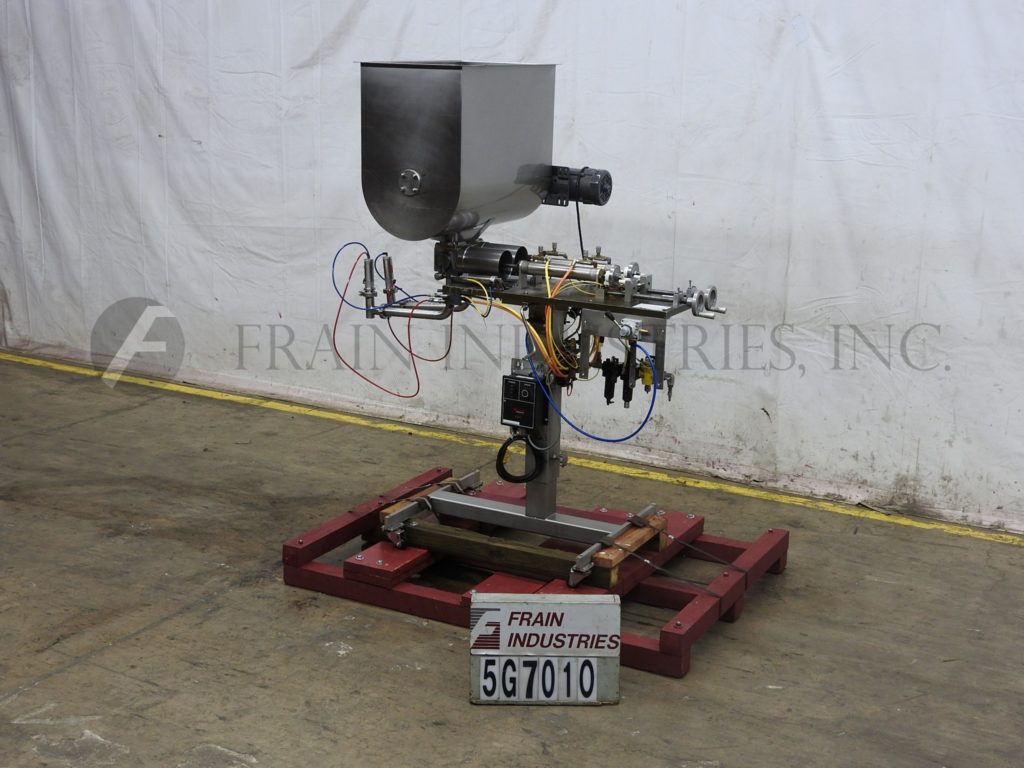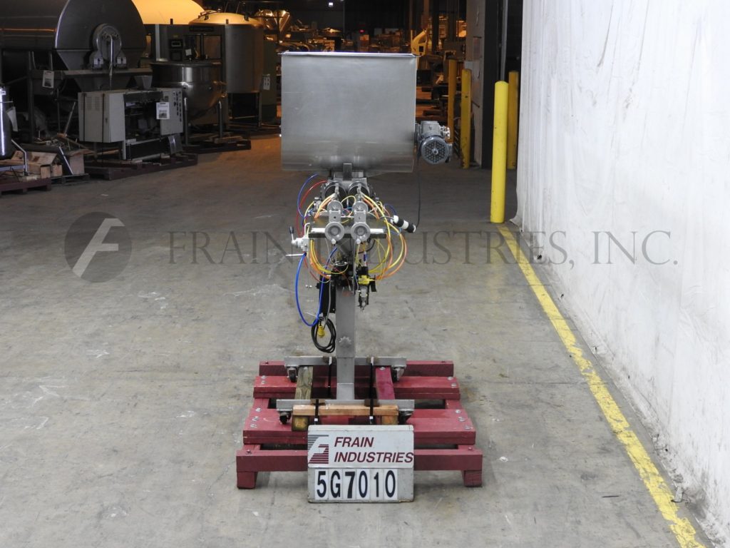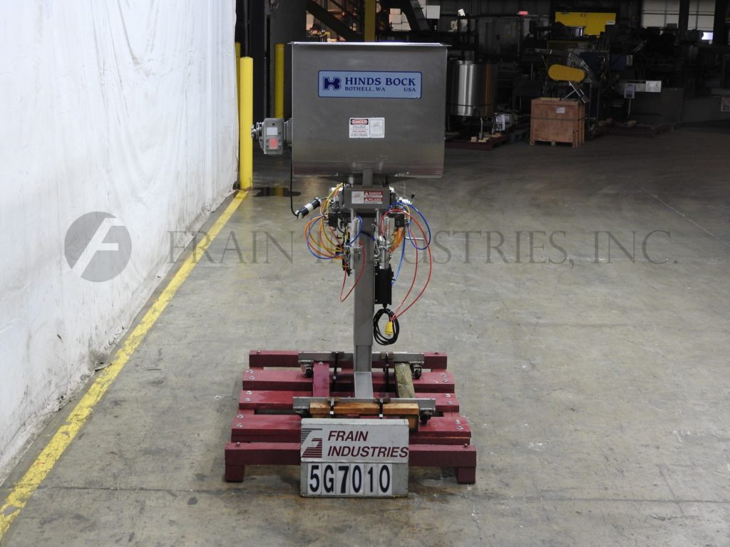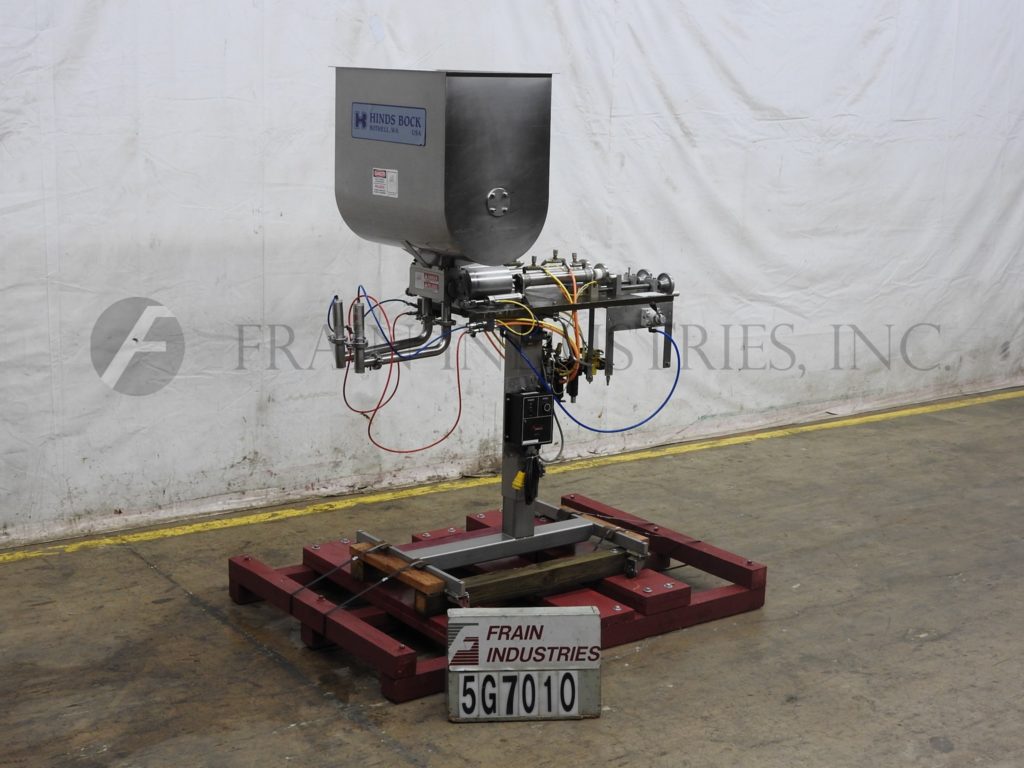Hinds-Bock, Model 2P-64I, stainless steel, dual head piston filler / depositor. Rated to 64oz per piston. Equipped with 30" long x 18" wide x 27" deep (7.8 ft³) stainless steel product hopper with variable speed agitation, two 64 oz pistons, two 1½" OD positive cut-off nozzles set on 5" centers, height adjustable column with current discharge height of 36½". Mounted on H style stainless steel base frame with casters. Speed dependant on materials, application, machine configuration and operator dexterity.