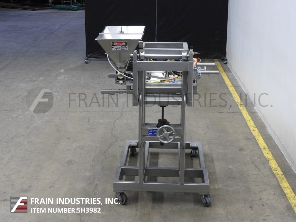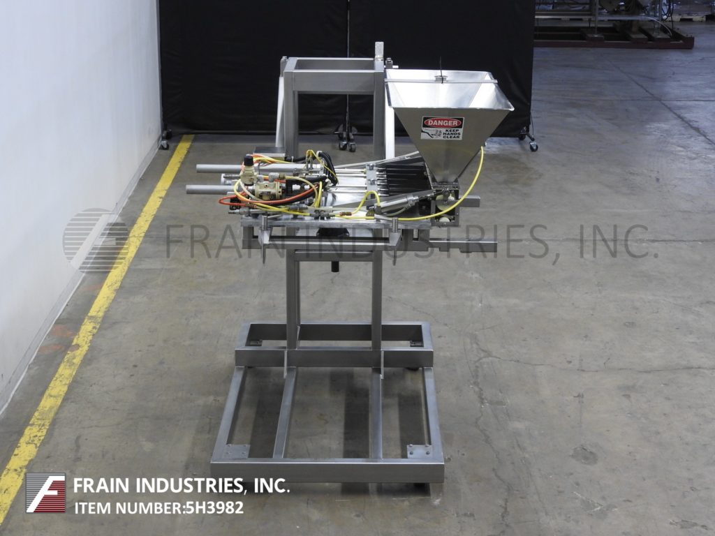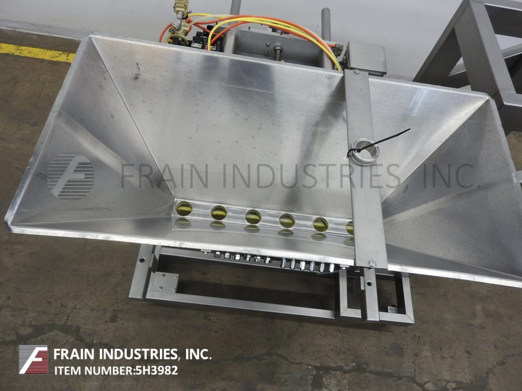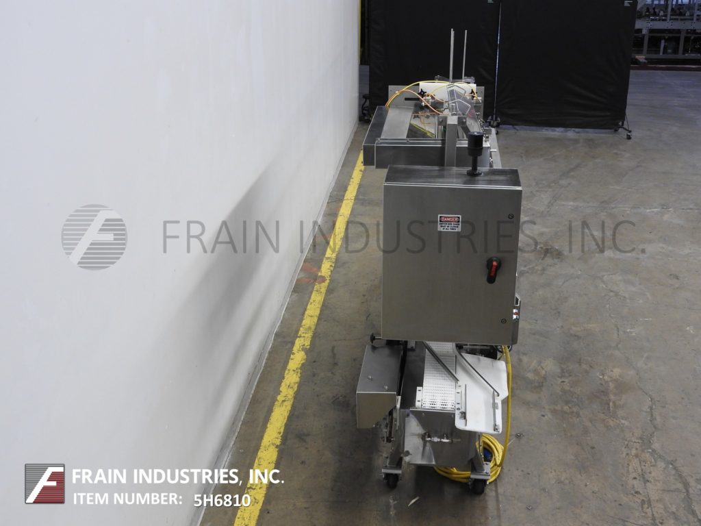 汉德斯博ck Model SC-1330, automatic, inline stainless steel, empty cup denester, filler and lidder. Rated from 5 to 60 cups per minute – depending on materials, application and size fill. Equipped with 64" long x 6" wide plastic Delrin conveyor thru filling section and 72" long x 6" wide flexlink conveyor thru lidding section with 32" infeed / discharge heights. 40" long empty cup magazine with spinning rod cup denester and low stack alarm, places cups on conveyor to Bimba cup indexing for filling (choice of filler per application) then to lid applicator with 48" long automatic roller lid magazine and compression section, with no container, no fill, no lid system. Control panel has PLC controller and A/B Panel View touch pad controls with cycle start, stop, reset and e-stop push buttons. Mounted on (6) leg frame with locking casters.