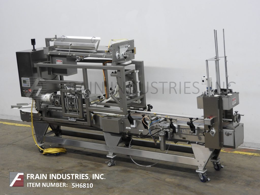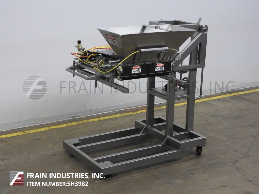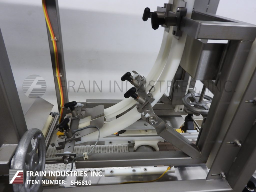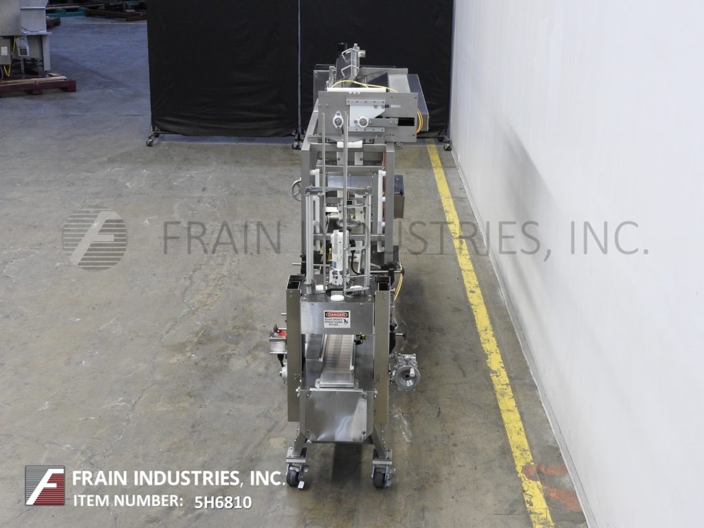 汉德斯博ck Model SC-1330, automatic, inline stainless steel, empty cup denester, filler and lidder. Rated from 5 to 60 cups per minute – depending on materials, application and size fill. Equipped with 64" long x 6" wide plastic Delrin conveyor thru filling section and 72" long x 6" wide flexlink conveyor thru lidding section with 32" infeed / discharge heights. 40" long empty cup magazine with spinning rod cup denester and low stack alarm, places cups on conveyor to Bimba cup indexing for filling (choice of filler per application) then to lid applicator with 48" long automatic roller lid magazine and compression section, with no container, no fill, no lid system. Control panel has PLC controller and A/B Panel View touch pad controls with cycle start, stop, reset and e-stop push buttons. Mounted on (6) leg frame with locking casters.