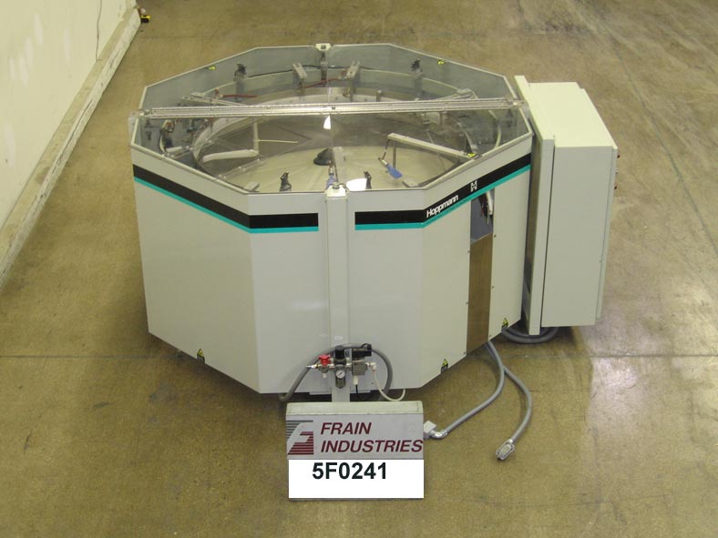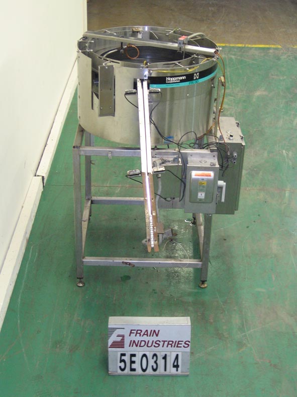 Hoppmann, ft50crs型,自动50"直径,刚性圆盘离心碗给料机额定从100到2000片每分钟-取决于材料,应用和机器配置。配备一个42" x 42" x 30"料斗9½宽x 35"长的橡胶输送机活底。提起联锁的lexan安全防护罩,66"直径外圈,和48"直径内底产品圈,和1马力鼓风机冲压空气输送机。安装在不锈钢底座与(6)旋转脚轮和排放高度33"。