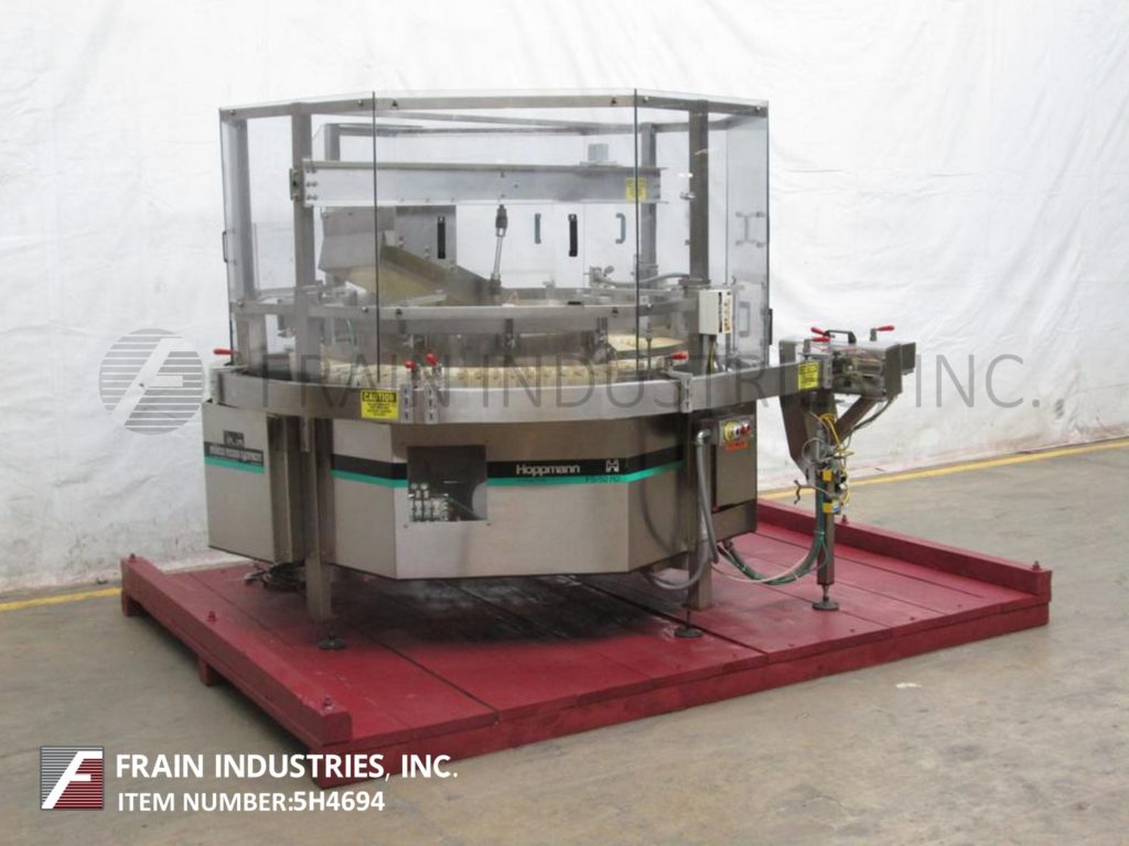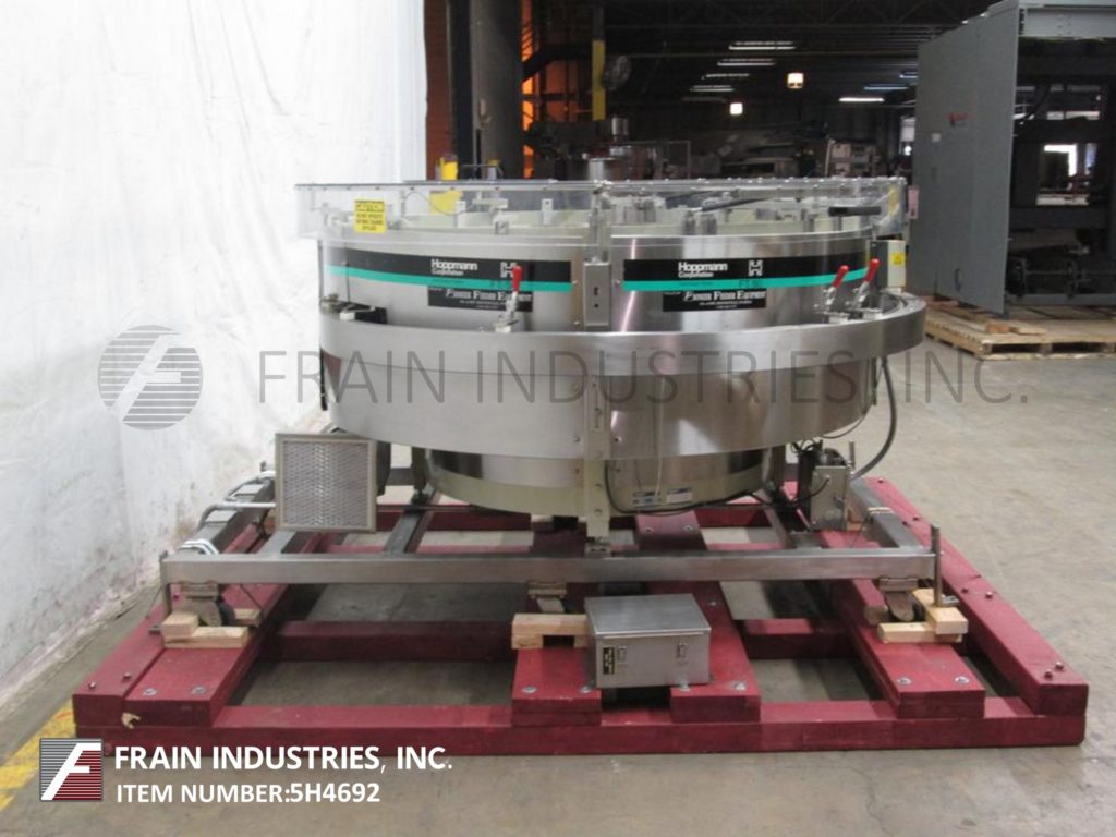 Hoppmann, ft50crs型,自动50"直径,刚性圆盘离心碗给料机额定从100到2000片每分钟-取决于材料,应用和机器配置。配备联锁lexan安全防护罩,66"直径外圈,和48"直径柔性内底产品环,和冲压空气输送机与1马力鼓风机。安装在不锈钢底座与(6)旋转脚轮和排放高度40"。