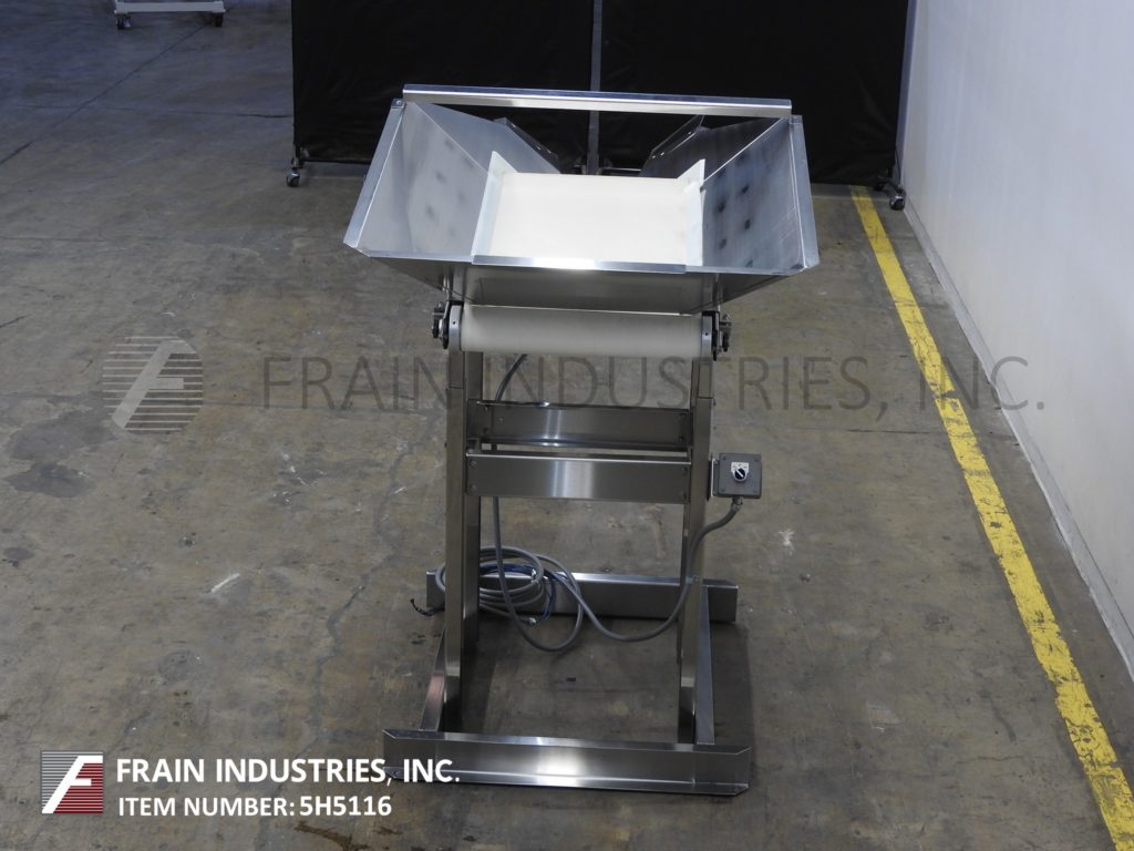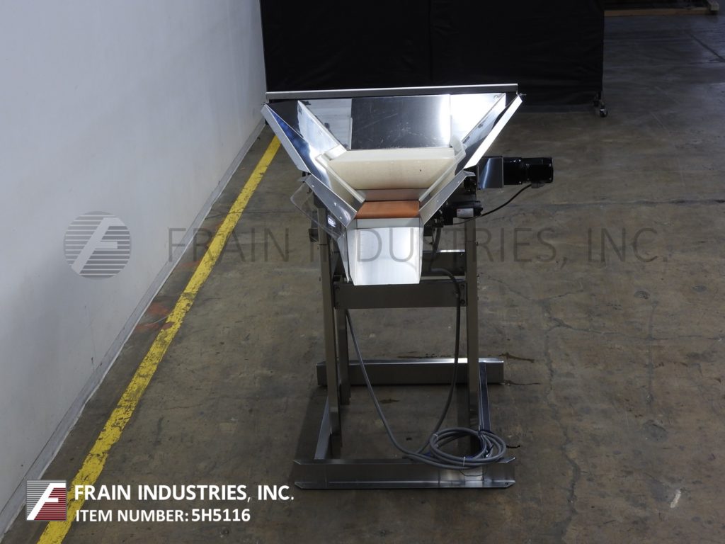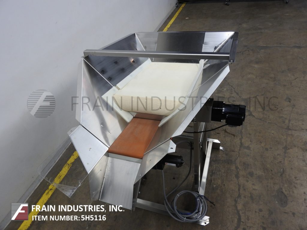Hoppmann, VWB型,料斗和带式给料机。配备一个42"宽x 40"长x 10"深不锈钢料斗与一个24"宽x 36"长的橡胶带活底和10"宽x 16"长的橡胶带卸料输送机与卸料高度50"。