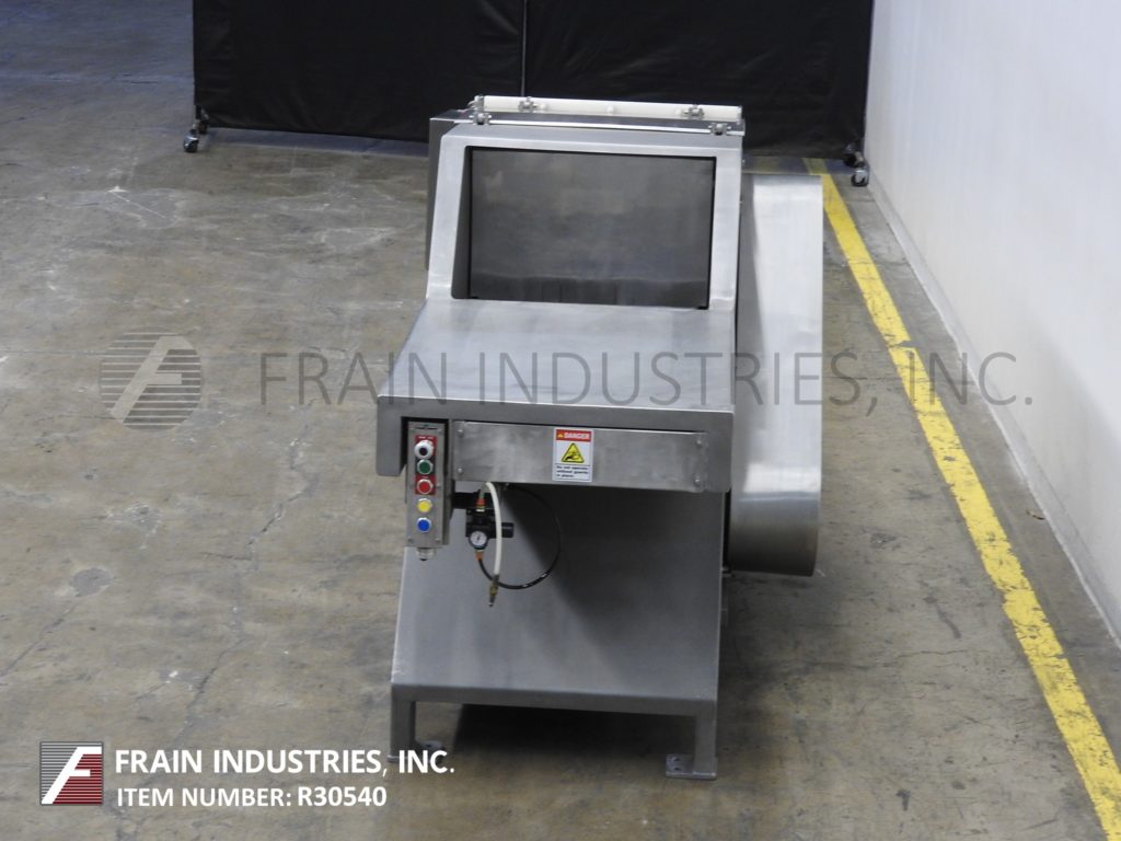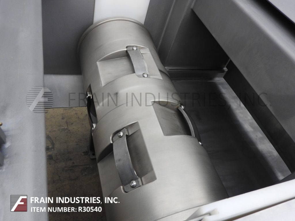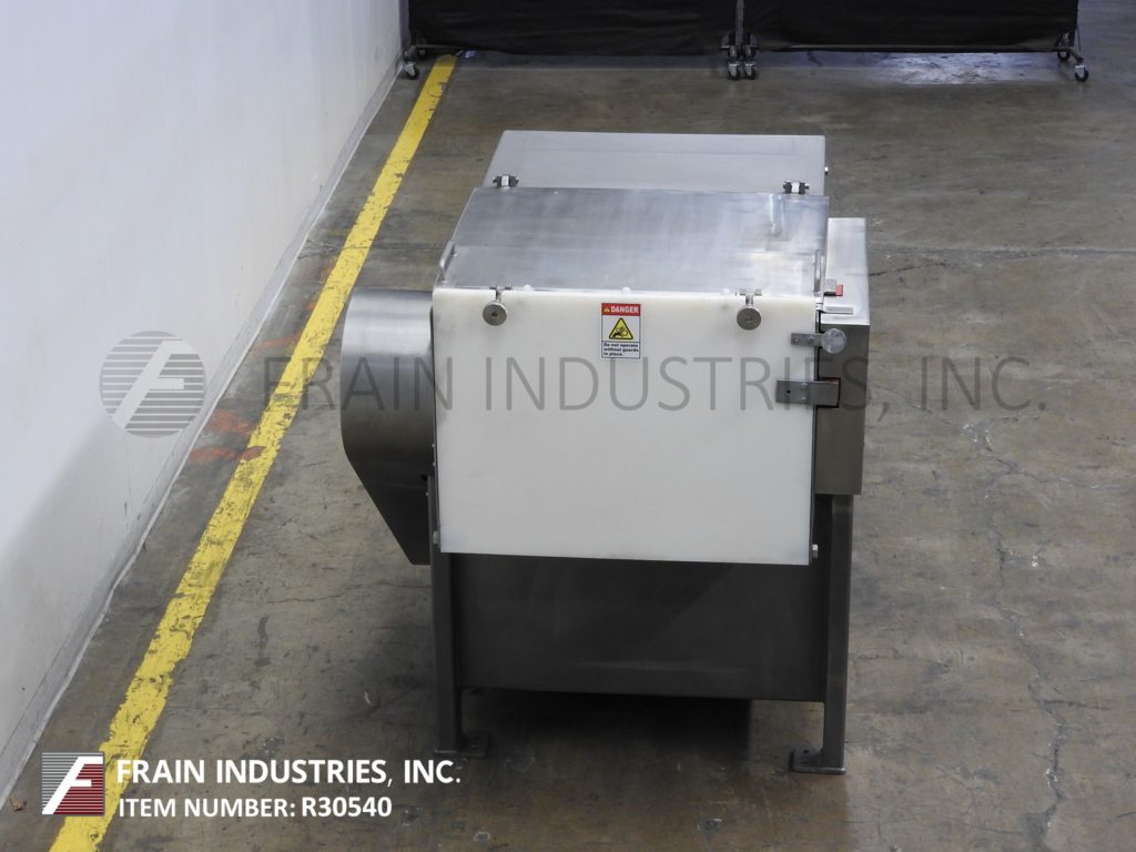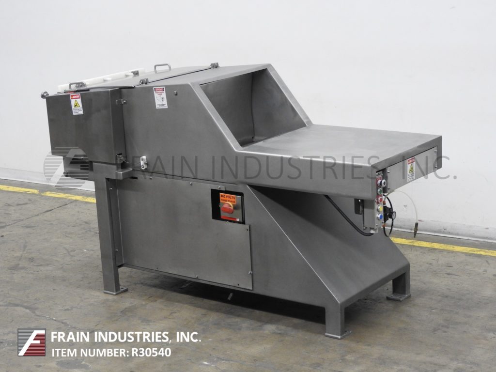 Gemac模型Hydraflaker,不锈钢,冷冻阻挡断路器和切片机从1到3个块/分钟 - 取决于材料和应用。块尺寸长达24英寸:24“宽度;10“高度,温度下降到0°F,可以在2分钟加上1/4”厚的1/4“厚度下降到1/4”厚度(取决于产品)。配备32英寸宽x 36“长产品饲料台,带26”宽X 7“高液压产品RAM至27”长x 22“高产品通过开口和12”OD x 30“长旋转鼓切割组件,具有(8)4-1 / 2长叶片随着翻转,锁定安全盖和32“长x 16”宽排放式斜槽,27“楼层清除。控制面板具有机器和进料启动,停止和e-stop按钮控件。安装在不锈钢(4)腿基架上。