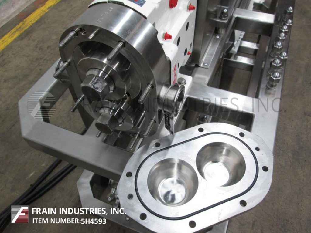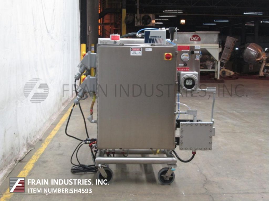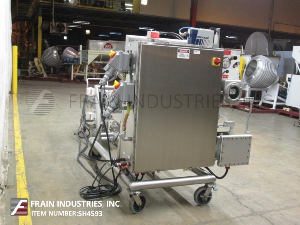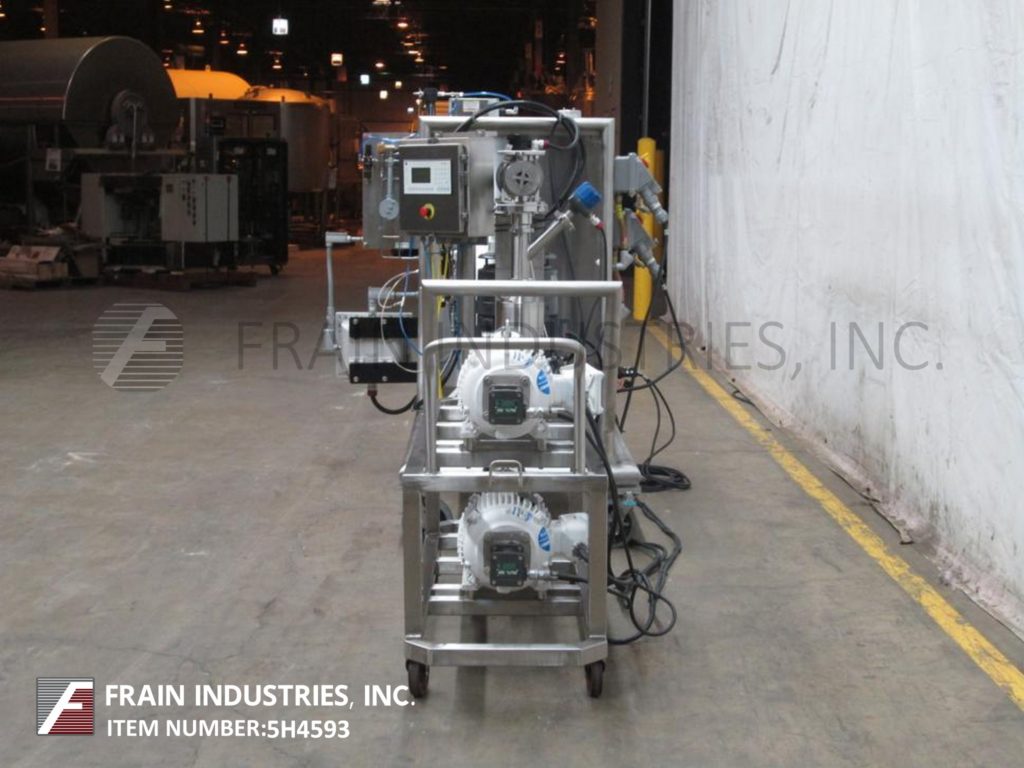 Ika-Works型号MHD 2000/10,连续液体/固体,混合,均质和分散系统,能够处理高达80%的固体浓度,额定为1500升液体和2900磅的粉末/颗粒每小时-取决于材料和应用。所有316 l不锈钢接触液体的部件,1/2惠普顶部安装马达驱动与Sunco不锈钢,清洁锁,固体旋转计量阀7“OD /半”ID x 19-1/2“长产品混合室3”OD固体入口,2 - 1/2“OD液体入口,2 - 1/2 OD最终均质,分散出口和2 - 1/2”OD流量计港口内部进料螺旋,混合桨和转子/定子系统,20马力主电机驱动。控制面板有A/B CPU与A/B变速控制器,Stahl触摸板控制器与读数和e-stop也液体流量控制和压力表。安装在带脚轮的不锈钢管状底座框架上。