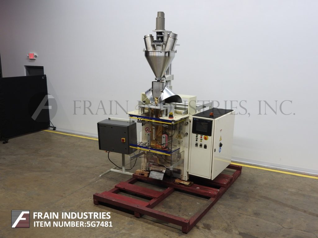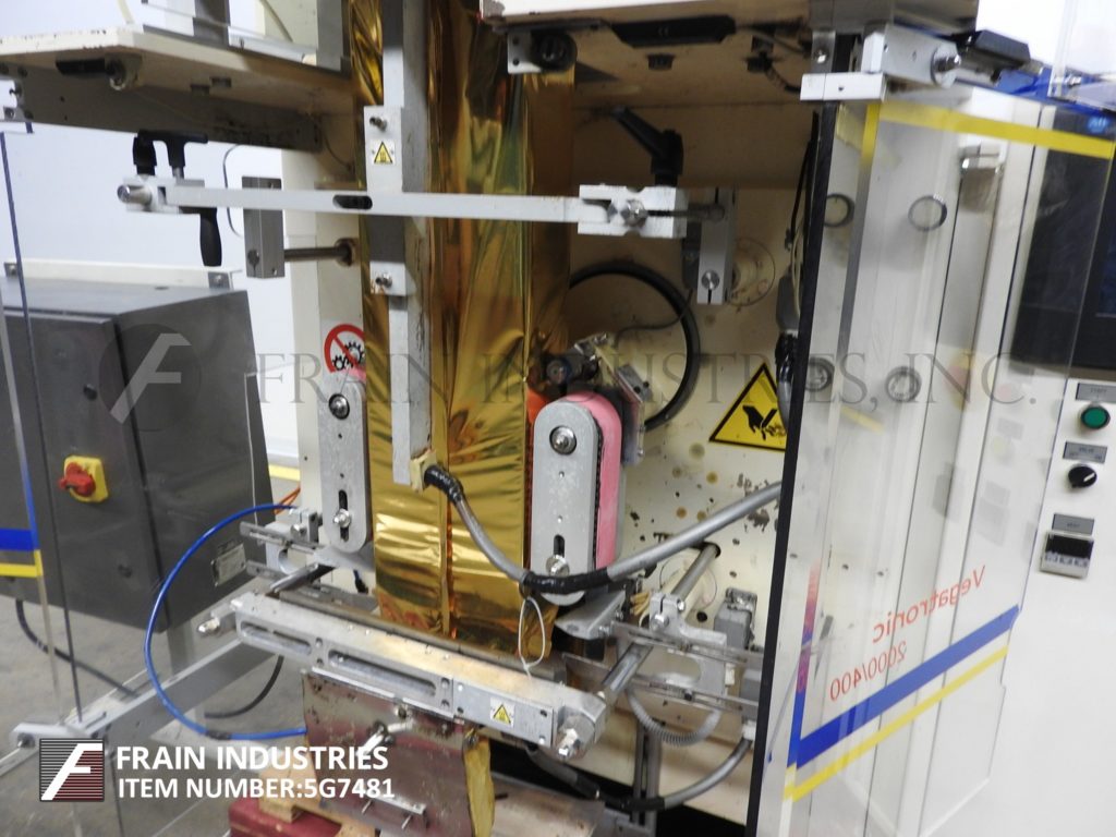 Ilapak, Vegatronic 2000型,立式成型、填充和封口机。额定每分钟20到120包-取决于材料,应用和机器配置。包装尺寸范围:2"至15"宽度:18.9"长度。配备双带膜下拉,动力膜展开,17"宽水平密封钳口,25"长垂直密封条,成型管,最大膜宽32",最大卷外径19.7",3"外径芯和膜配准。控制面板采用PLC控制器,触摸屏HMMI。安装在重型框架上。