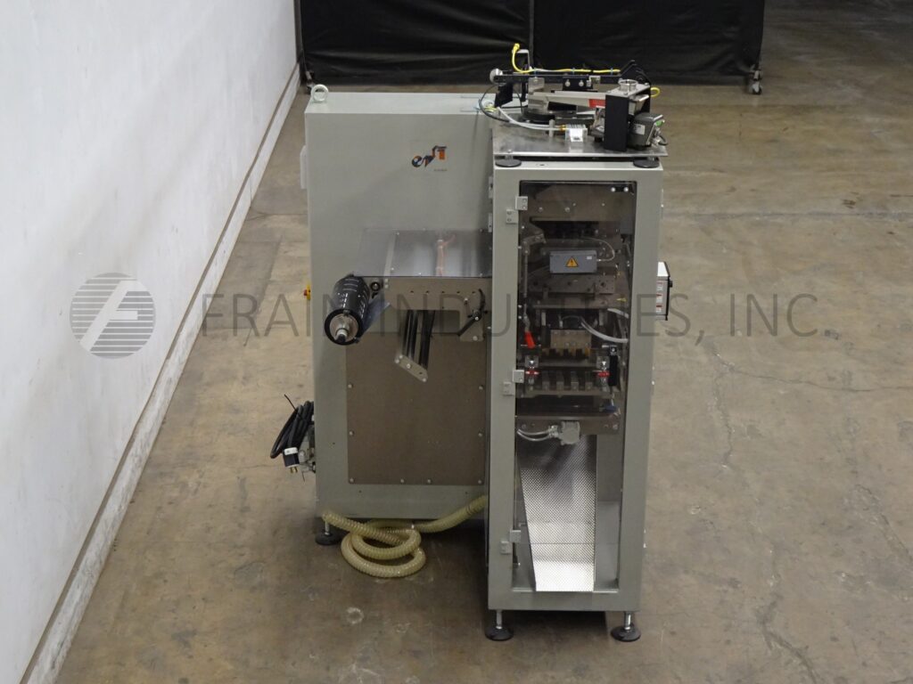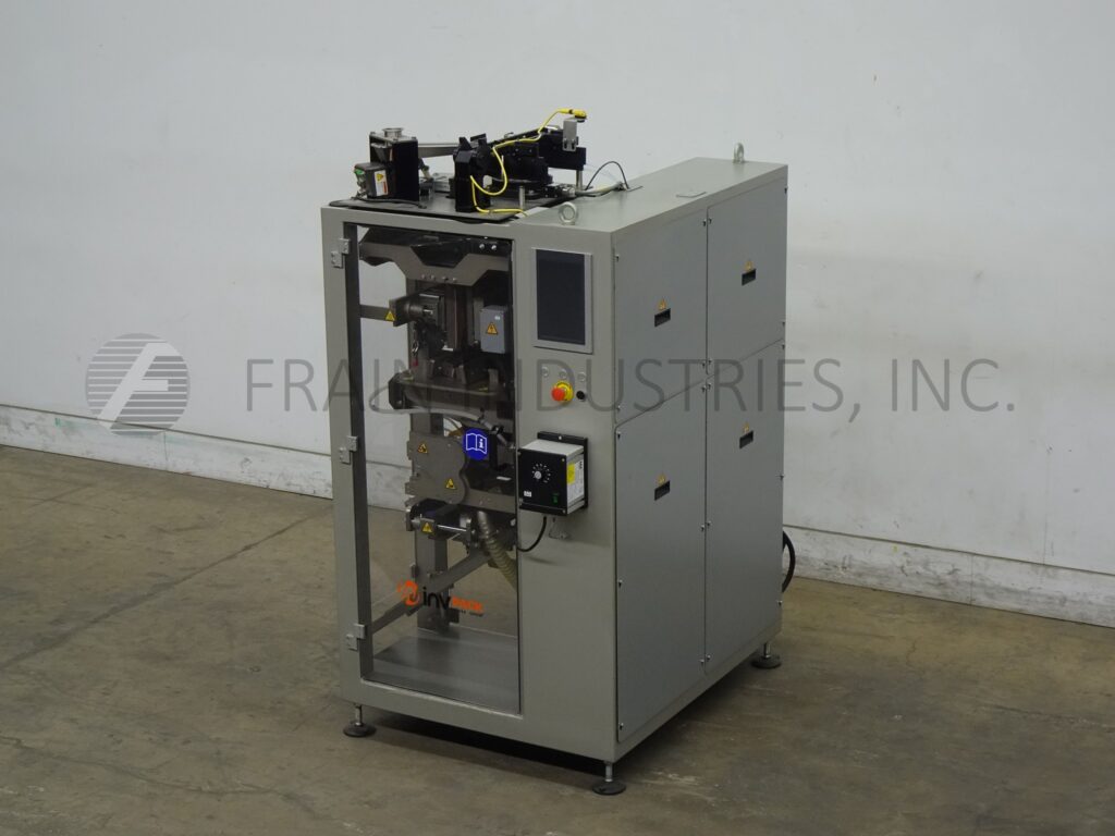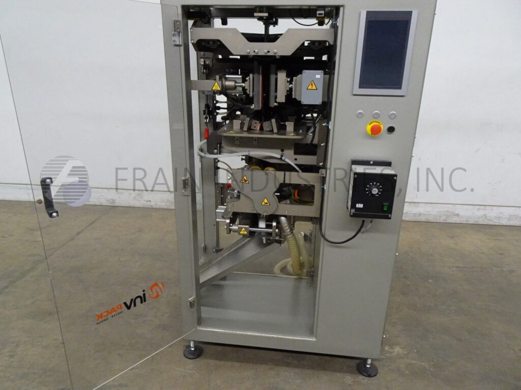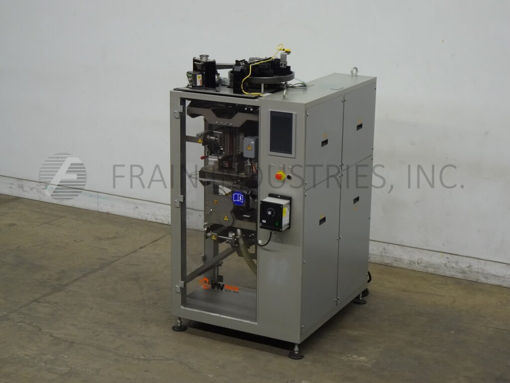 INVpack, Model MVA3, Automatic, vertical, stainless steel, form, fill and seal sachet machine. Rated up to 280 sachets per minute – depending on materials, appliaction and machine configuration. Roll size: 300mm max film width; 300mm max OD. Sachet size range: 40mm to 150mm in width; 50mm to 150mm in length (depending on how many lanes are being used). Equipped with single web, film registration, (4) 6½" long vertical seal bars, (1) 7" wide horizontal seal bar with tear notch, emboss coder, slitter wheels with vacuum trim removal and cut off knife. Control panel with touch screen HMI.