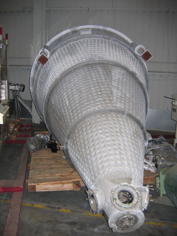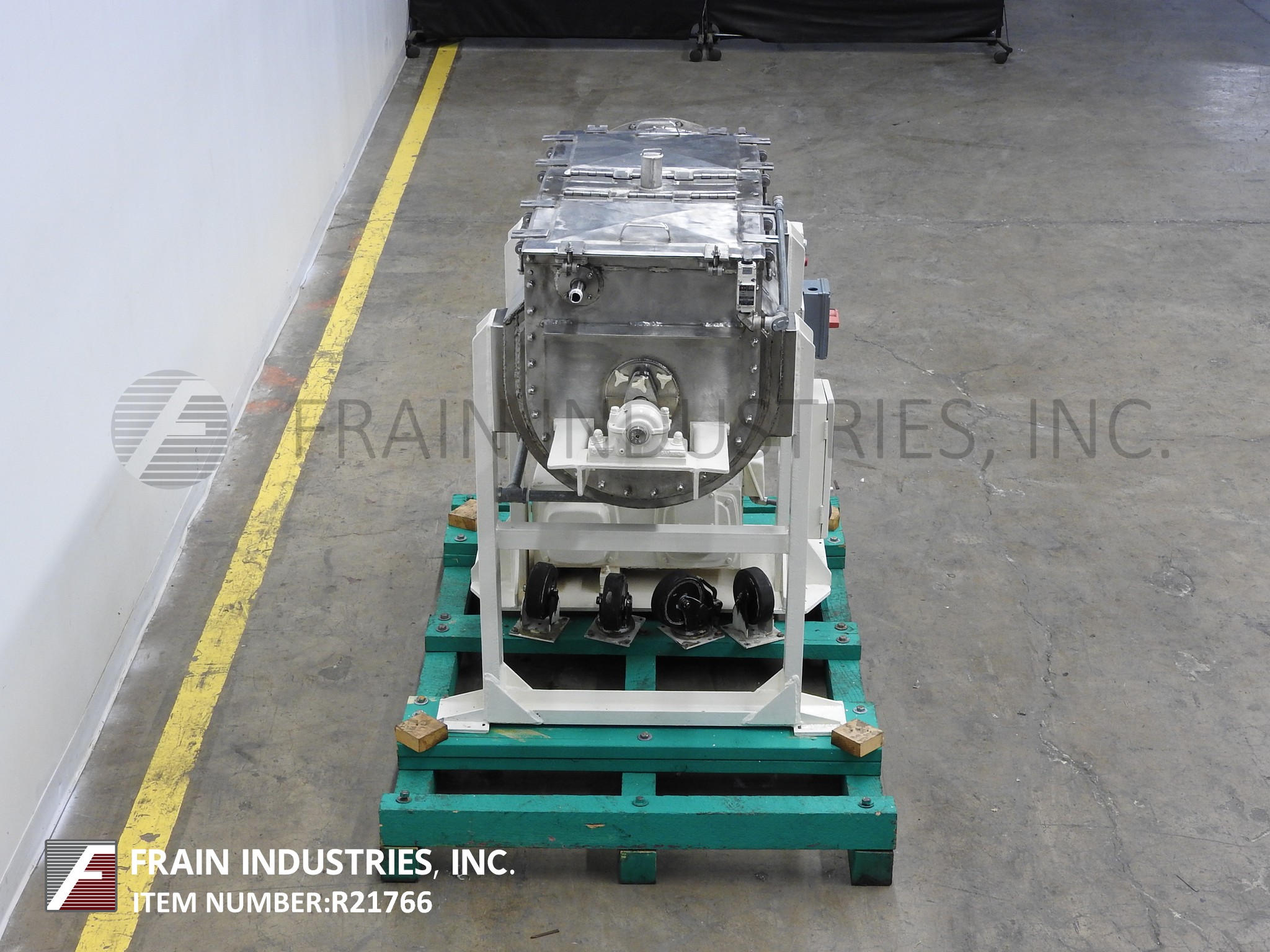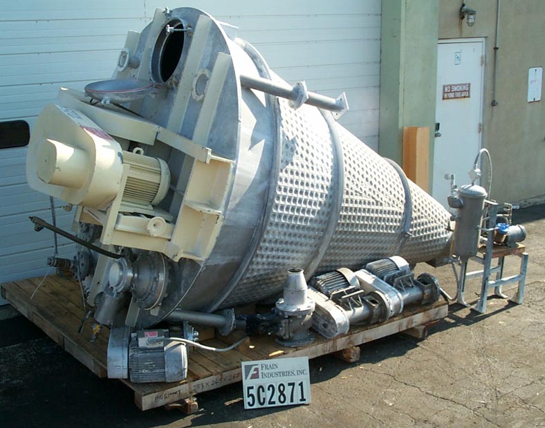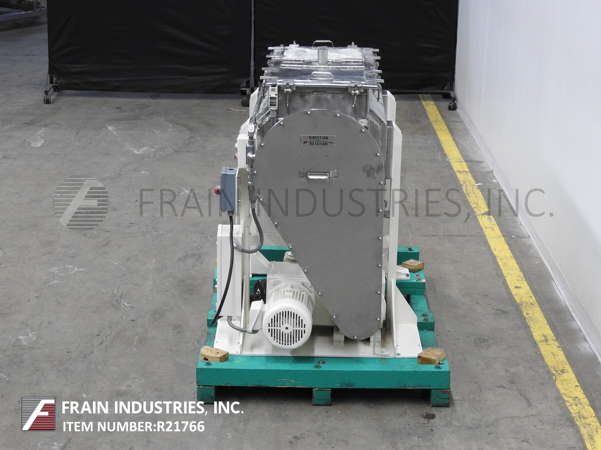 J H Day Model Nauta MBX1225,122.5 Cu FT,304不锈钢,3区,凹凸夹套Nauta搅拌机。每小时磅产品 - 取决于材料和应用。锥形船只:90“顶部OD和10”底部OD和136英寸的直墙。配备24“OD螺栓向下通道,(1)5”OD和(1)7“OD视线端口,(2)顶部安装Separte驱动电机。3 HP驱动器为ARM,20 HP驱动器为14英寸OD主混合螺旋螺钉,带标准通用接头,有三个混合动作:打开其轴线,绕罐式轨道,向上螺旋螺旋旋转。贵普夹克额定到125 psi350 deg f,真空。混合粘性产品,粘度从100,000 - 300,000厘泊和密度为1.3 - 3.6克的每CC。(3)3 HP自动的“Lumpbreakers”安装在锥形底部的底部底部,从坦克绘制产品横跨叶轮,并返回与Sihi真空系统的混合螺杆。