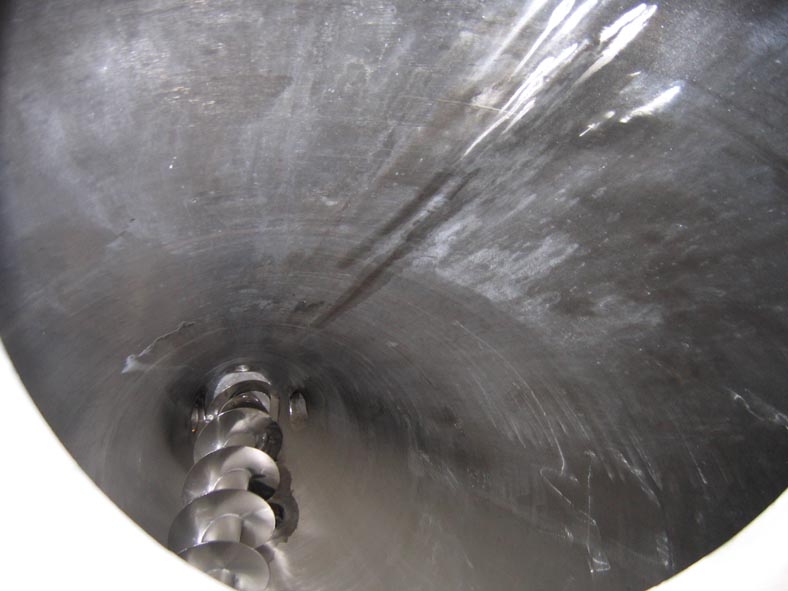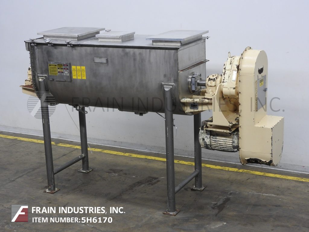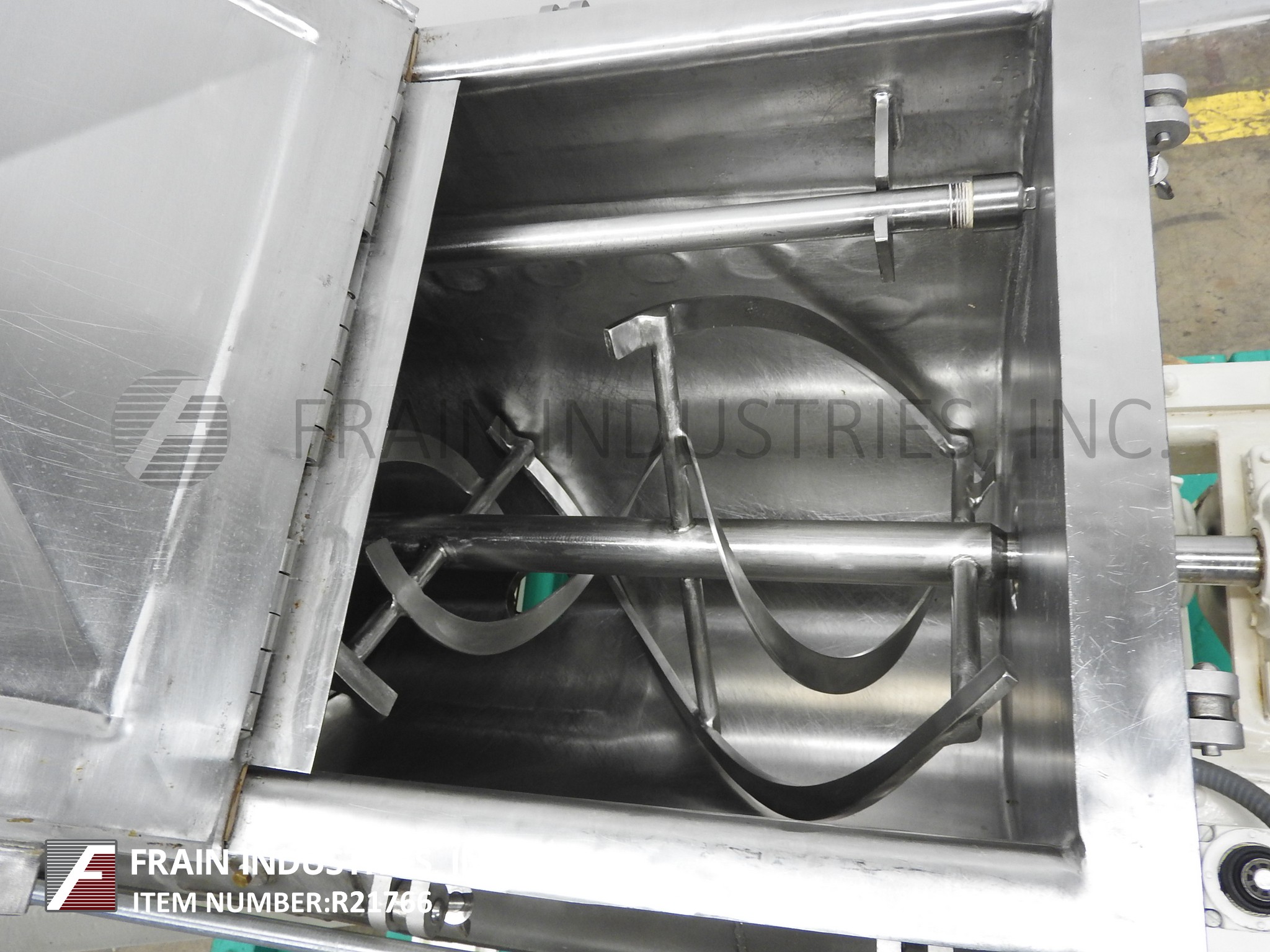 jh Day, 30立方英尺,双带搅拌机,每小时可搅拌几磅产品,具体取决于材料和应用。304不锈钢接触部件和内部混合室尺寸:长度70";30“宽;在深度33”。配备螺栓下盖,(1)20" x 20"法兰人孔,(1)12" x 12"充电端口与升降盖,(1)23" x 13"法兰人孔,4"外径混合轴1¼"宽x¼"厚(外部)和1½"宽x(1/8)"厚(内部)不锈钢带。6"外径中心底部放电,配有手动滑门和42"地面间隙。安装在(4)腿框架上。